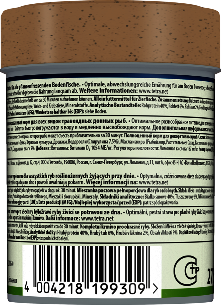 Tablety Tetra Pleco nabízejí optimální a pestrou výživu pro býložravé a plaché ryby žijící u dna, jako jsou malí krunýřovci guyanští, parmouni šikopruzí, hlavačky a krunýřovci jehlicovití. Jedinečné složení těchto dvoubarevných víceúčelových tablet podporuje dobrý zdravotní stav, zářivé barvy a vitalitu bez přidání jakýchkoli barviv nebo konzervačních látek. Obsažené rostlinné bílkoviny uspokojují specifické výživové potřeby býložravých ryb. Tablety Tetra Pleco se rychle potápějí, ale pomalu se rozpouštějí. Proto jsou ideálním krmivem pro plašší ryby v akváriu. Vysoký podíl řasy spiruliny navíc podporuje vitalitu, zatímco omega-3 mastné kyseliny podporují zdravý vývoj. Kromě snadno konzumovatelného složení jsou tablety Tetra Pleco vysoce stravitelné, a proto udržují vodu čistou a stabilně kvalitní.