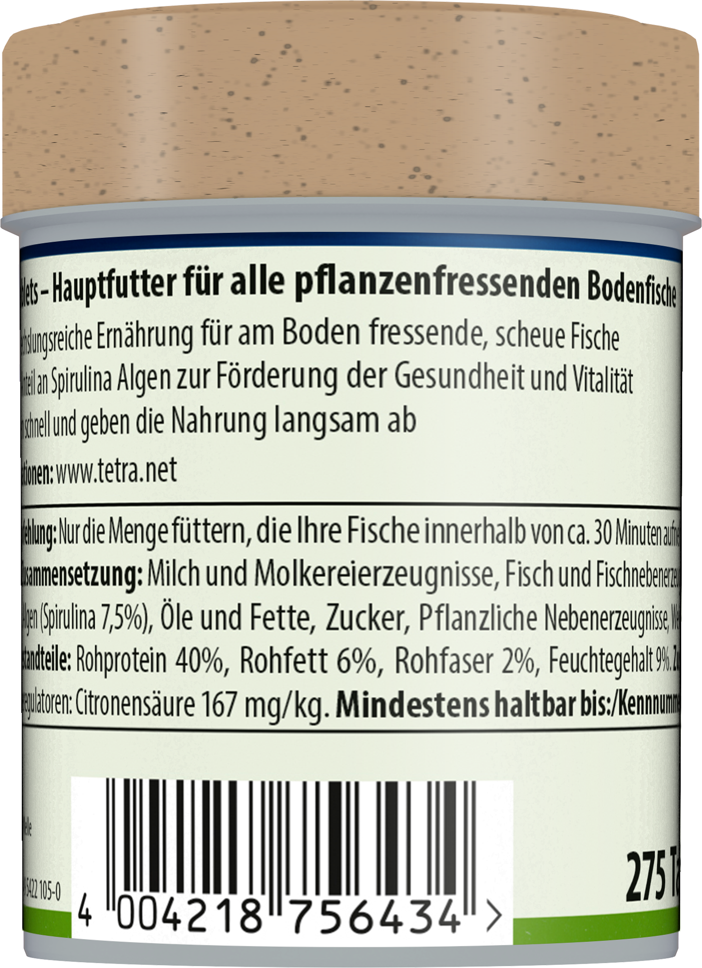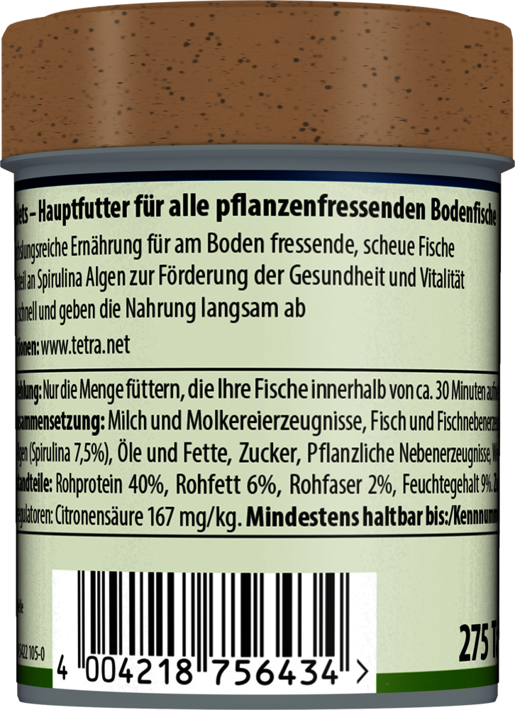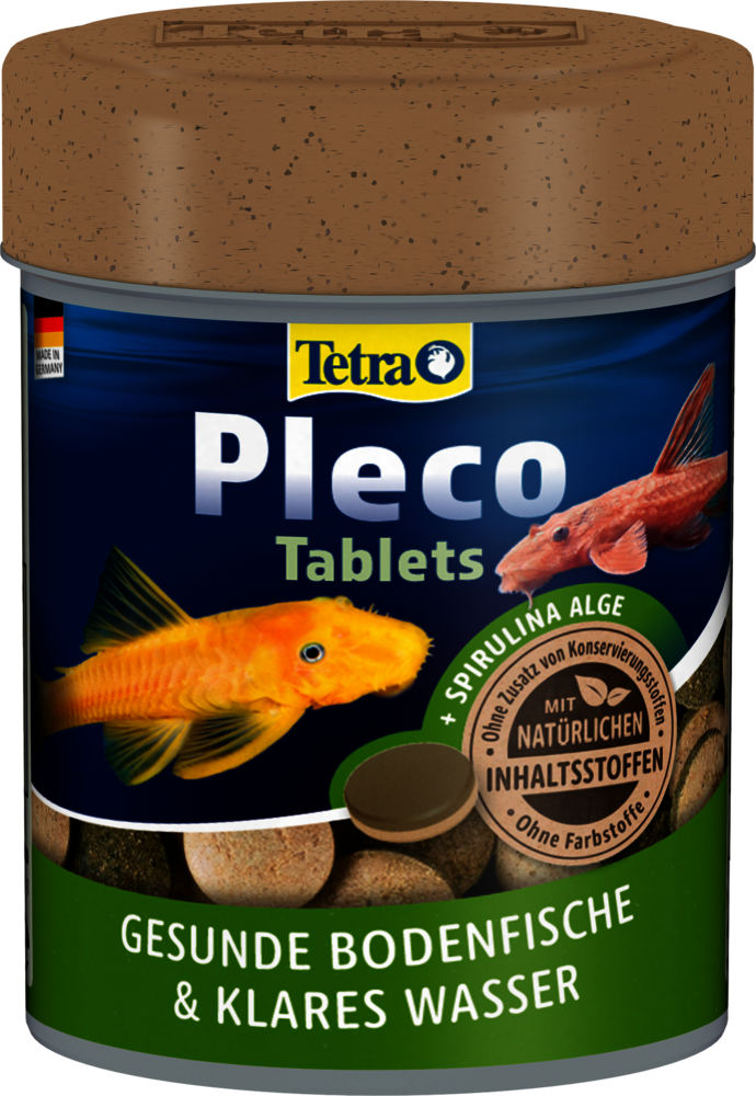 Las pastillas Tetra Pleco ofrecen una nutrición óptima y variada para peces herbívoros y que viven en el fondo, como los pequeños plecos, los comedores de algas siameses, los gobios y los siluros de cola látigo. La receta única de estas pastillas múltiples de dos colores favorece la buena salud, la vivacidad del color y la vitalidad sin añadir colorantes ni conservantes. Las proteínas vegetales contenidas contribuyen a satisfacer las necesidades nutricionales específicas de los peces herbívoros. Las pastillas Tetra Pleco se hunden rápidamente, mientras que el alimento se libera lentamente en el agua. Por lo tanto, las pastillas son el alimento perfecto para los peces más bien tímidos de su acuario. Además, la elevada proporción de alga espirulina favorece la vitalidad, mientras que los ácidos grasos omega-3 promueven un desarrollo sano. Además de su composición fácil de comer, las pastillas Tetra Pleco son altamente digestibles y, por tanto, ayudan a mantener el agua limpia y su calidad estable.