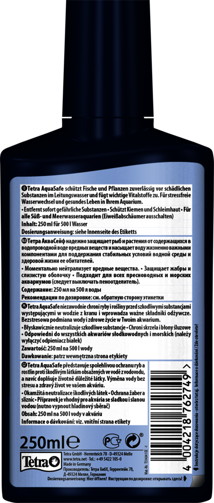Tetra AquaSafe to uzdatniacz wody wodociągowej. Sprawia, że woda wodociągowa staje się bezpieczna dla organizmów zamieszkujących akwarium. Działa natychmiast, nie powoduje zmętnienia wody i nie ma żadnych innych niepożądanych efektów.