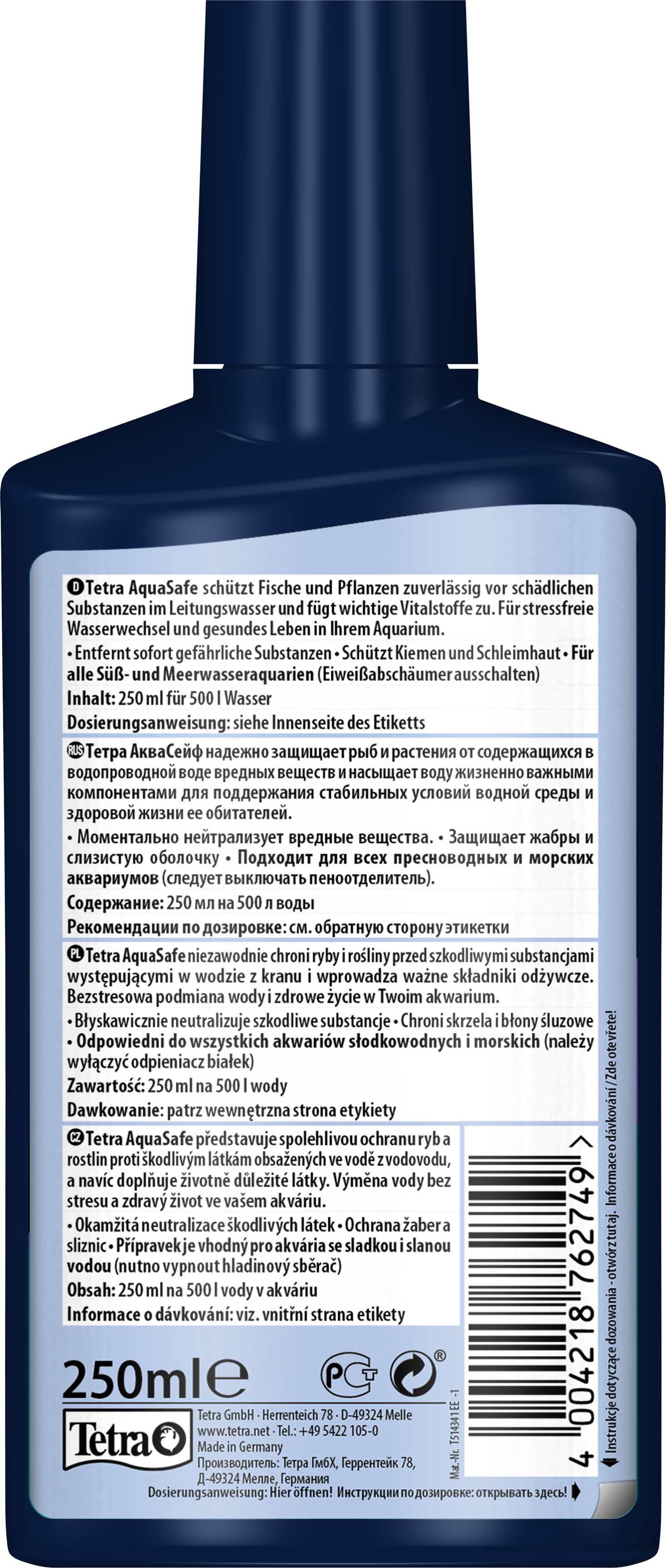 Tetra AquaSafe jest idealny podczas zmiany wody i przy zakładaniu nowego akwarium, gdyż zmienia wodę wodociągową w bezpieczną dla ryb w ciągu sekund: usuwa wszelkie niebezpieczne substancje, jak chlor, chloramina, miedź, cynk i ołów, błyskawicznie i dokładnie. Ponadto zawarta w tym preparacie mieszanka witamin B zmniejsza stres, jakiego mogą doświadczać ryby podczas wymiany wody. Produkt zawiera naturalne ekstrakty roślinne chroniące skrzela i błony śluzowe ryb, co sprzyja długofalowemu zapewnieniu zdrowia. Zoptymalizowana formuła pielęgnacyjna jest doskonale dostosowana do potrzeb związanych z pielęgnacją skóry i płetw ryb. Tetra AquaSafe zawiera ponadto inne niezbędne witaminy, jod i magnez. Jod poprawia żywotność, zaś magnez sprzyja wzrostowi i dobrostanowi ryb i roślin. Uzdatniacz wody stymuluje osadzanie się i bioaktywność użytecznych bakterii w akwarium, co z kolei zapewnia czystą i świeżą wodę. Tetra AquaSafe rozpuszcza się szybko w wodzie akwarium, zapewniając długofalowe korzyści zdrowotne wszystkim mieszkańcom akwarium. Jest odpowiedni do wszystkich akwariów słodkowodnych i morskich i zaleca się stosowanie go zawsze podczas zakładania nowego akwarium czy wykonywania zmiany wody. Tetra AquaSafe błyskawicznie zmienia wodę wodociągową w bezpieczną dla ryb i zapewnia idealne warunki dla zdrowego życia w akwarium. Przy stosowaniu Tetra AquaSafe w akwariach morskich należy jednak wyłączyć filtr białkowy w celu zapobiegania tworzenia się dużych ilości piany.