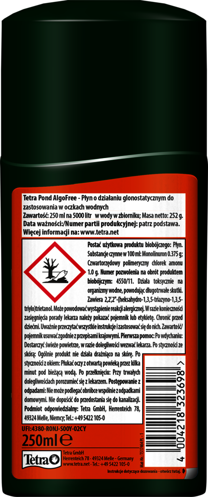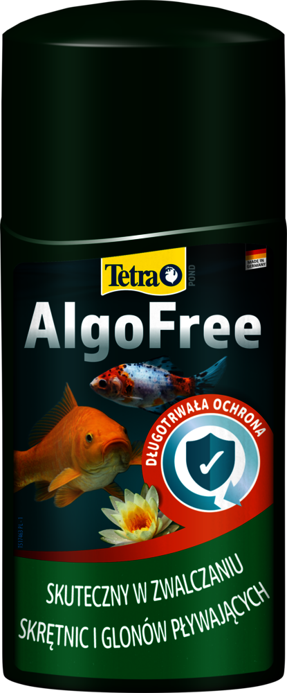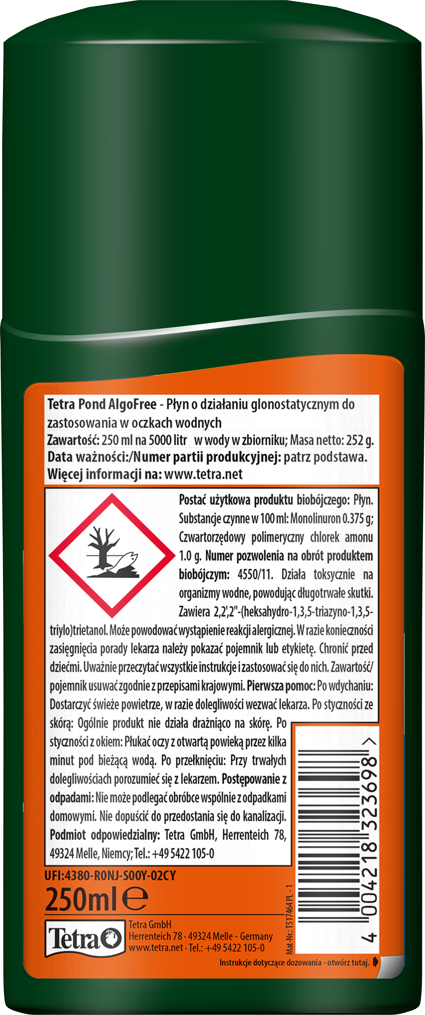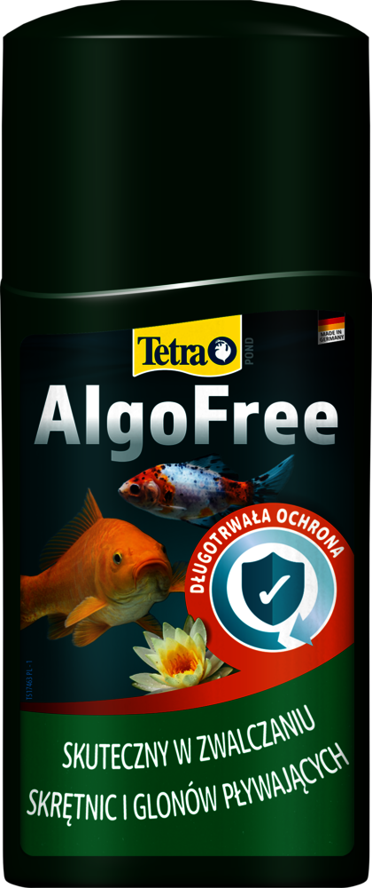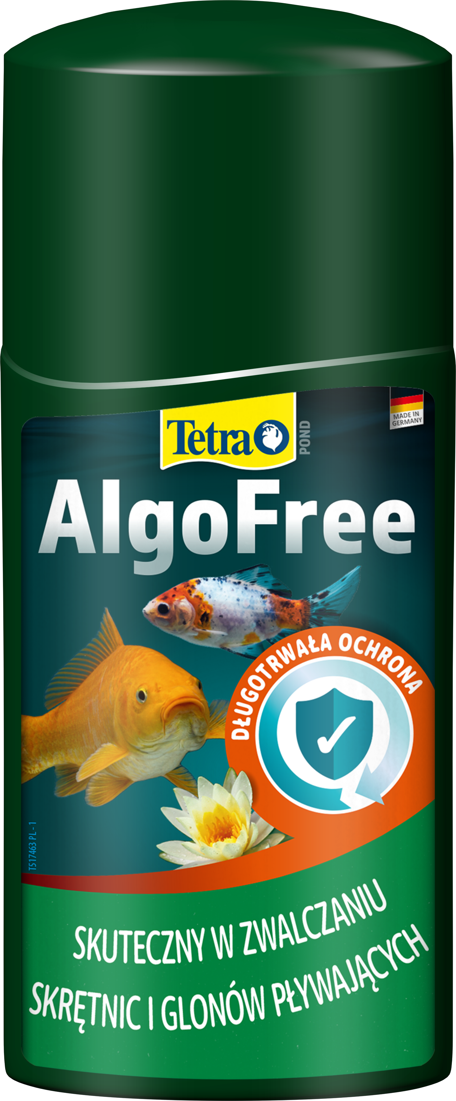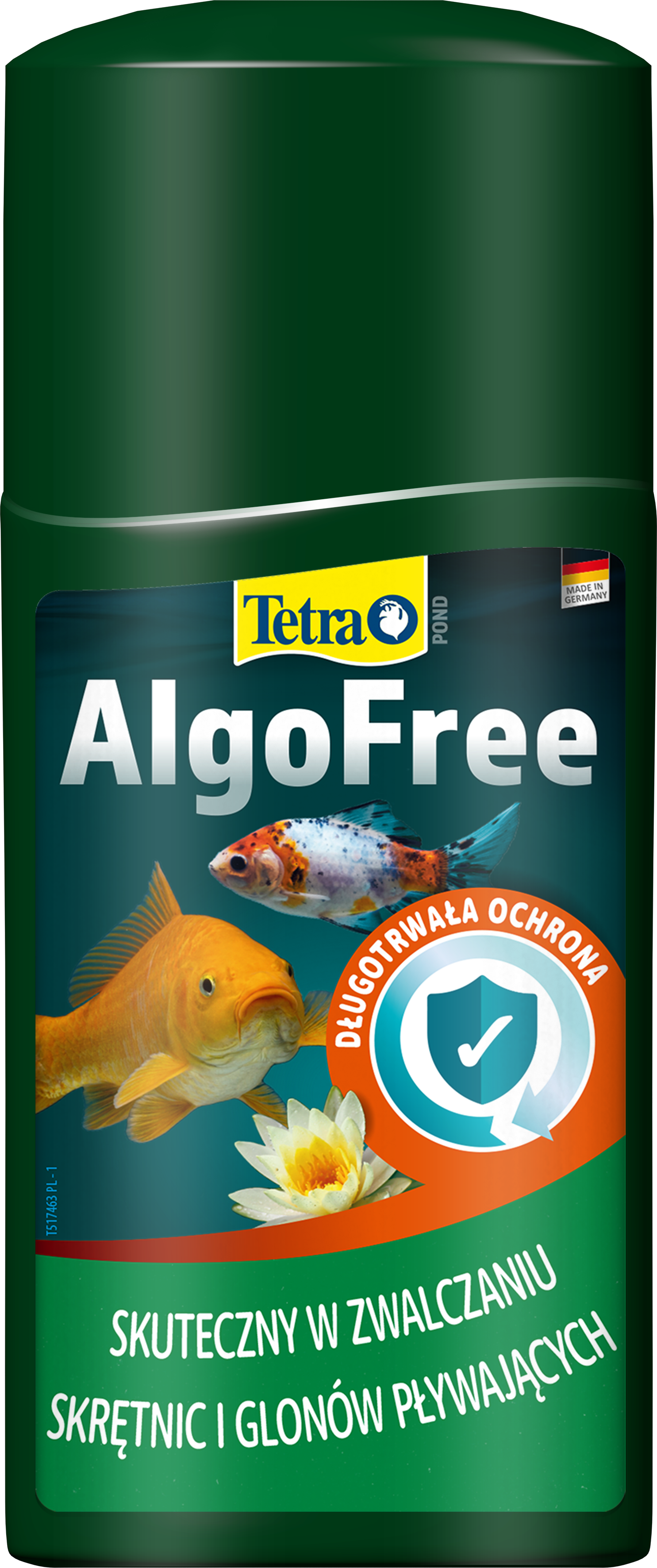 Tetra Pond AlgoFree* skutecznie eliminuje kilka gatunków glonów. Na dłuższą metę niszczy glony nitkowate występujące w oczku wodnym oraz zwalcza glony pływające, które są odpowiedzialne za zieloną wodę. Efekt zobaczysz niezawodnie w ciągu zaledwie kilku dni. Składniki preparatu Tetra Pond AlgoFree* niszczą ścianę komórkową glonów. Następnie szczątki są szybko rozkładane mikrobiologicznie. W wyniku tego procesu w oczku wodnym może wystąpić krótkotrwałe spienianie. Oprócz radykalnego zwalczania glonów, produkt ten jest szczególnie przydatny do zapobiegania zakwitowi glonów, szczególnie wiosną. Preparat Tetra Pond AlgoFree* może być również stosowany do zwalczania rozrostu glonów latem. Produkt nadaje się do oczek wodnych i nie szkodzi rybom, roślinom ani mikroorganizmom. Aby uzyskać najlepsze rezultaty, przed użyciem dobrze wstrząśnij preparat i postępuj zgodnie ze szczegółowymi instrukcjami. Dzięki dołączonej nasadce dozującej Tetra Pond AlgoFree* można dozować bardzo precyzyjnie. Użyj nasadki dozującej, dodając 25 ml na 1000 l wody w oczku, i równomiernie rozprowadź płyn w wodzie, na przykład za pomocą patyka. Zapewnij wystarczający dopływ tlenu podczas zabiegu i nie używaj sterylizatora UV ani węgla aktywnego przez co najmniej 7 dni. Ponadto po zabiegu nie należy dokonywać żadnych zmian wody przez 4 tygodnie. Aby zwalczyć masywny rozrost glonów, możesz powtórzyć zabieg przy użyciu połowy podanej ilości po 2 tygodniach. Aby szybciej przywrócić czystą wodę po zastosowaniu preparatu Tetra Pond AlgoFree*, zalecamy zastosowanie produktu Tetra Pond CrystalWater 4–5 dni po aplikacji preparatu Tetra Pond AlgoFree*. Pozostałości glonów można następnie łatwiej usunąć filtrem lub ręcznie (np. za pomocą Tetra Algae Net).