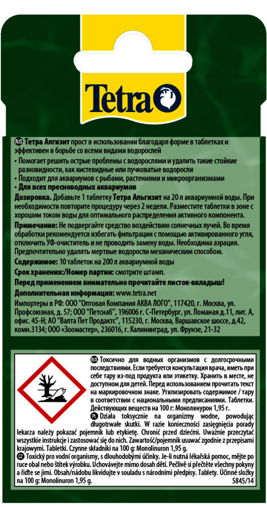 Tetra Algizit* ve formě tablet se snadno dávkuje a účinně bojuje proti všem druhům řas. Tablety se rychle rozpouštějí a uvolňují vysoce koncentrovanou účinnou látku.