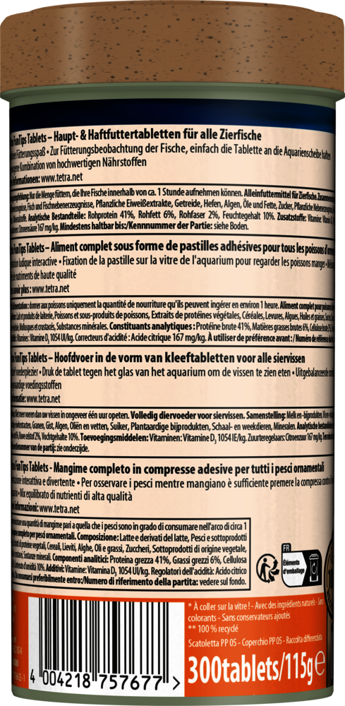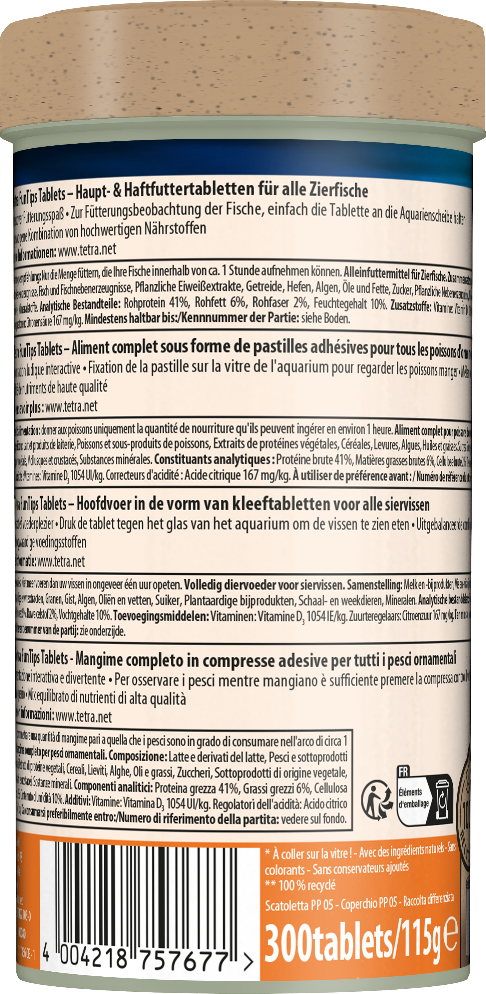 Tablety Tetra FunTips jsou díky svým nutričně vyváženým složkám ideálním pamlskem pro všechny tropické ryby. Dvoubarevné přilnavé tablety jsou pro vaše ryby dvojnásobně přínosné z hlediska výživy: oranžová strana obsahuje krevety a karotenoidy. Tato kombinace zvýrazňuje a oživuje zbarvení ryb. Zelená část obsahuje několik rostlinných složek a také prvotřídní tuky a oleje, které jsou nezbytné pro zdraví a vitalitu. Přilnavé tablety jsou více než jen zdravou pochoutkou pro vaše ryby. Díky své schopnosti přilnout na stěnu akvária nabízí skvělý způsob, jak sledovat ryby zblízka a pozorovat, jak se chovají. Tetra FunTips také usnadňují fotografování ryb – v některých případech dokonce i poměrně plachých druhů, které připlavou k přilepeným tabletám, aby se najedly. Další velkou výhodou je, že ryby plavou blízko skla: můžete je velmi pečlivě sledovat a odhalit případné nemoci. To vám v konečném důsledku umožní přijmout cílená opatření proti nemocem, ryby léčit a v ideálním případě i zabránit šíření nemocí. Celkově lze říci, že tablety Tetra FunTips nejen zpříjemňují a zpestřují čas krmení, ale také představují praktický způsob, jak zdravě zpestřit stravu vašich ryb. Díky snadno konzumovatelnému složení a vysoké stravitelnosti udržují všechny složky vodu v akváriu čistou se stabilními hodnotami. Přilnavé tablety neobsahují barviva ani přidané konzervační látky, čímž zajišťují optimální růst.