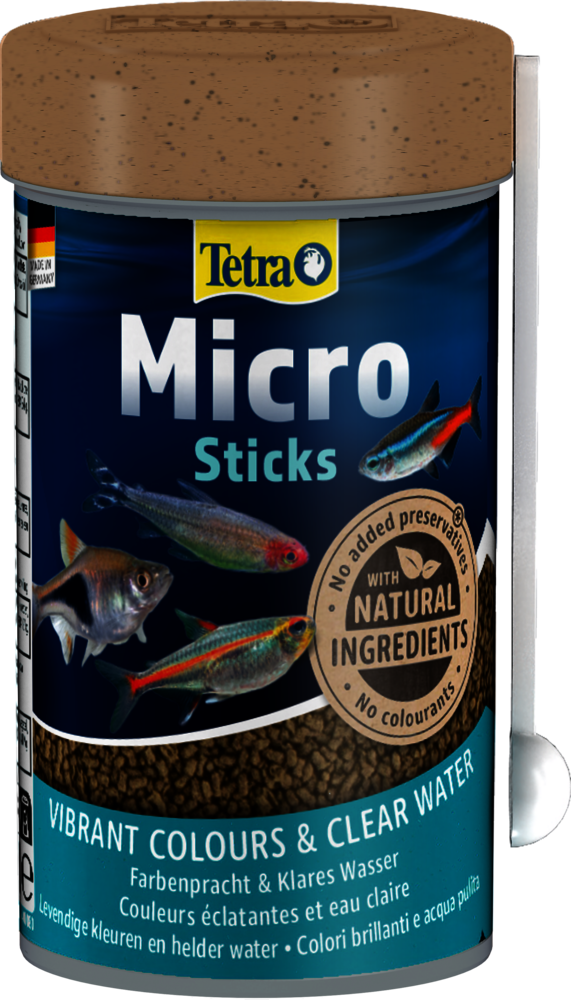 Tetra Micro Sticks je kompletní krmivo s velmi malými kousky tyčinek, které plavou na hladině a pak pomalu klesají ke dnu, speciálně vyvinuté pro okrasné ryby s malou tlamou.