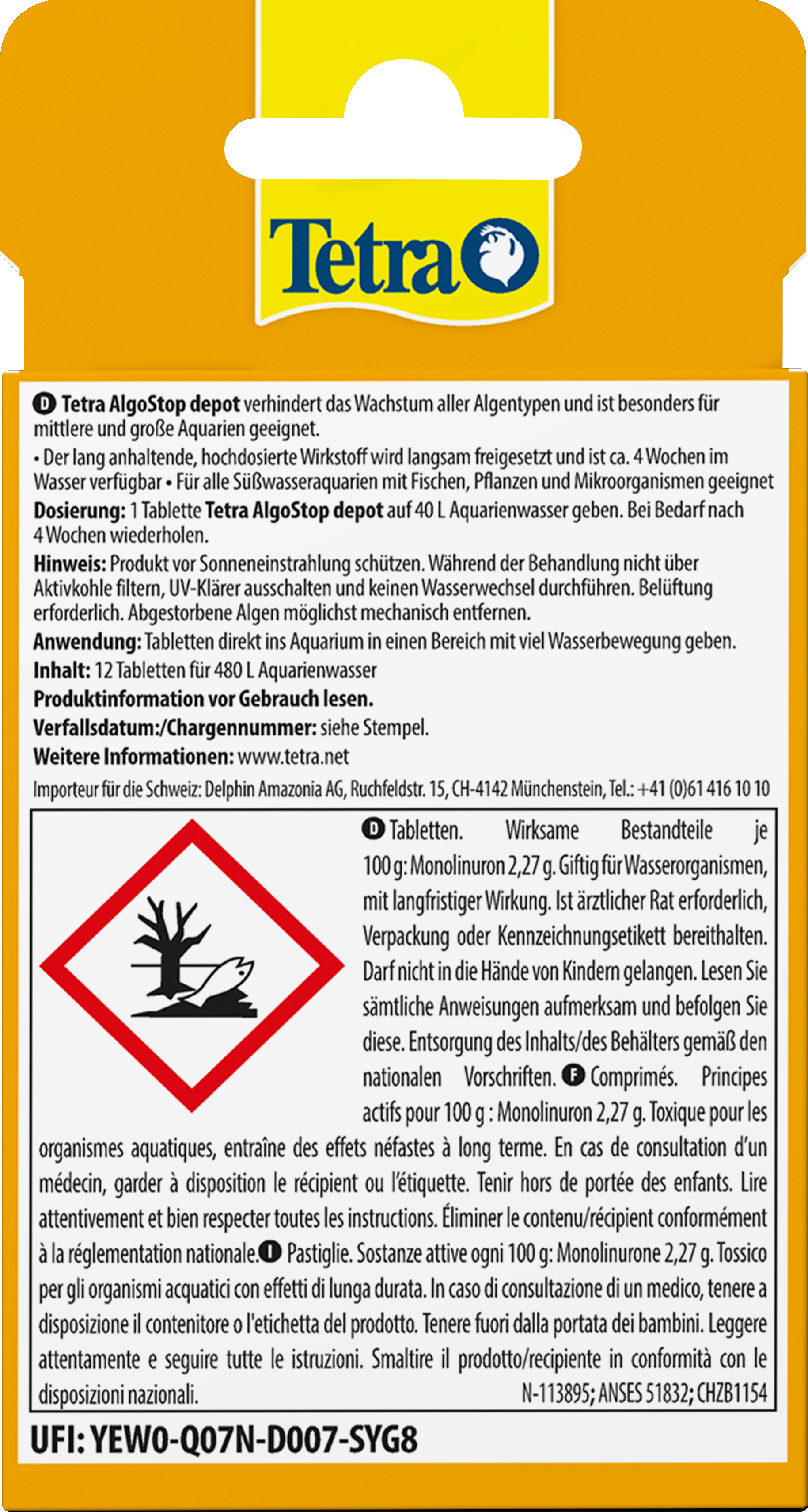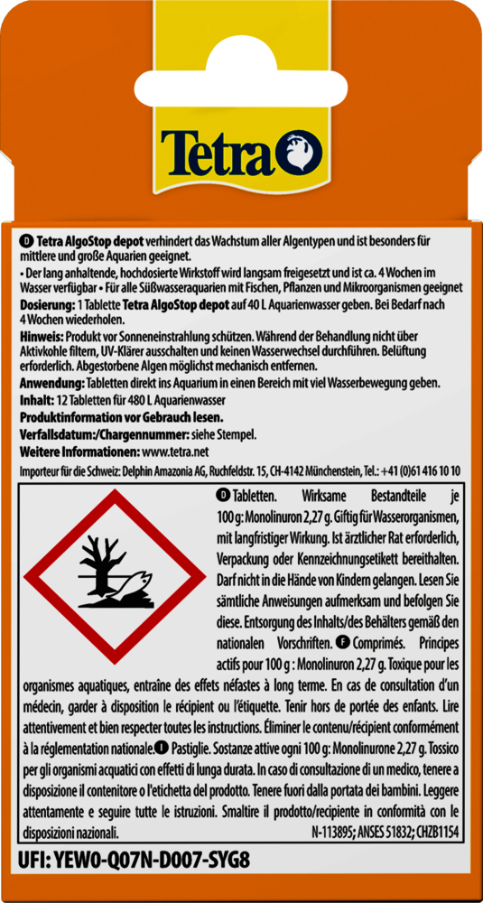 Tetra AlgoStop Depot* beugt Algen in Süßwasseraquarien mit 40 l oder mehr zuverlässig und langfristig vor, indem es einen hochdosierten Wirkstoff langsam über etwa vier Wochen freisetzt. Es greift in den Stoffwechsel der Algen ein, um bei allen Algenarten das Wachstum zu verhindern, ohne dabei das Wasser zu färben oder zu trüben. Tetra AlgoStop Depot* ist bei sachgemäßer Anwendung für Fische, Pflanzen und nützliche Mikroorganismen ungefährlich.