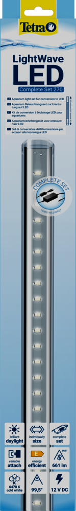 Mit Tetra LightWave steigen Sie einfach auf die moderne LED Technik um. Das Komplettset inklusive Netzteil und allen notwendigen Adaptern zur Anbringung ermöglicht eine sofortige Inbetriebnahme der Leuchte. Die hohe Lumenzahl der LED lässt ihr Aquarium in einem brillanten und naturnahen Tageslicht erstrahlen. Zudem regt das Lichtspektrum der Leuchte die Bildung von Chlorophyll an und fördert somit das Wachstum der Aquarienpflanzen.