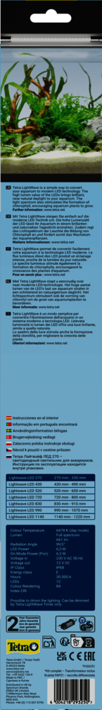 Wir gewähren 2 Jahre Garantie auf die Tetra LightWave-Leuchte. Die LEDs haben eine Lebensdauer von ca. 30.000 Betriebsstunden.