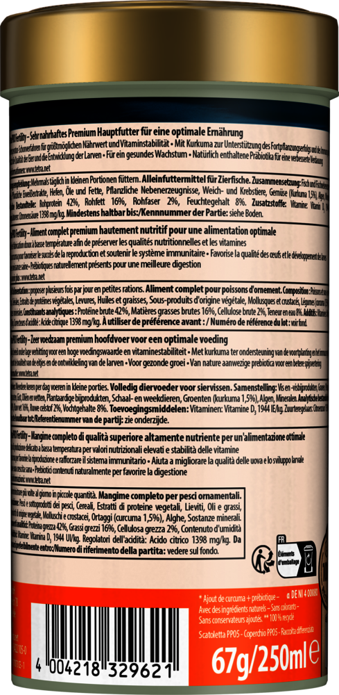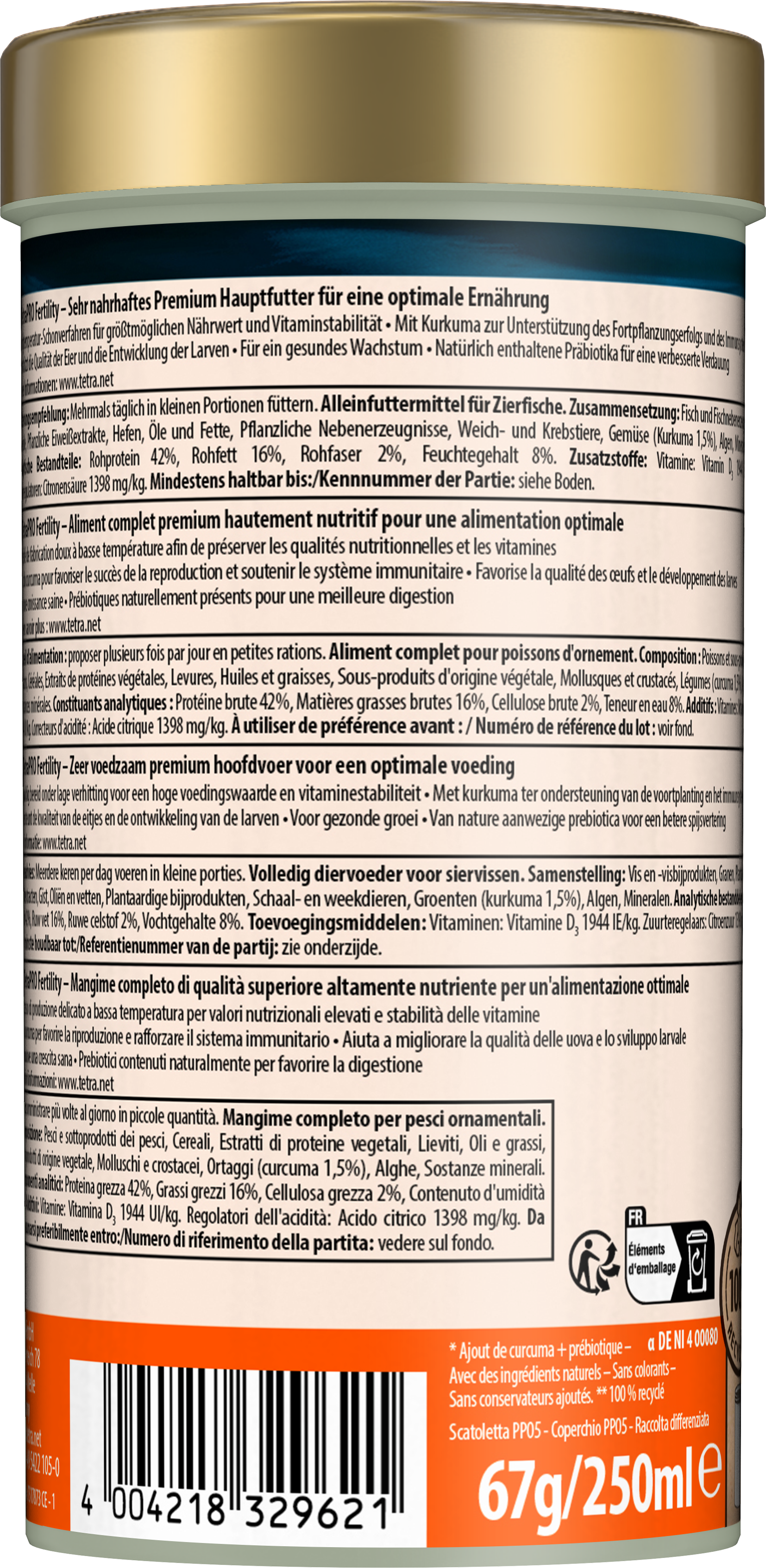 TetraPRO Fertility stellt eine Innovation im Bereich Fischfutter dar, da es den Zuchterfolg durch spezialisierte Ernährung unterstützt. Angereichert mit sorgfältig ausgewähltem Kurkuma stärkt dieses Premium-Hauptfuttermittel das Immunsystem und legt den Grundstein für eine hervorragende Eiqualität und kräftige Larvenentwicklung. Kurkuma wirkt sich unter anderem positiv auf die Produktion von Vitellogenin bei weiblichen Zierfischen aus. Dieses Protein wird in Dotterproteine umgewandelt, die im Fischei gespeichert werden und den Embryo ernähren und schützen. Die Multi-Crisps von TetraPRO Fertility werden in einem schonenden Niedrigtemperatur-Verfahren hergestellt und zeichnen sich durch einen besonders hohen Nährwert und eine hervorragende Vitaminstabilität aus. Multi-Crisps nehmen weniger Wasser auf als normales Flockenfutter, wodurch der Nährstoffgehalt erhöht wird. Gleichzeitig sorgt ein optimiertes Protein-Fett-Verhältnis dafür, dass das Protein gezielt für den Muskelaufbau genutzt wird, da es reichlich essentielle Fettsäuren für die Energiegewinnung liefert. TetraPRO Fertility bröckelt außerdem deutlich weniger als herkömmliche Flocken, wodurch die Menge an Futterstaub in der Dose erheblich reduziert wird. Darüber hinaus optimieren natürlich vorkommende Präbiotika die Verdauung, indem sie das Wachstum und den Stoffwechsel gesundheitsfördernder Bakterien im Verdauungstrakt der Fische unterstützen, während eine effiziente Futterverwertung die Wasserbelastung minimiert. Schließlich sorgt eine einzigartige Rezeptur aus hochwertigen Zutaten, völlig frei von Farbstoffen und zugesetzten Konservierungsstoffen, für optimales Wachstum – so, wie es Ihre Fische verdienen.