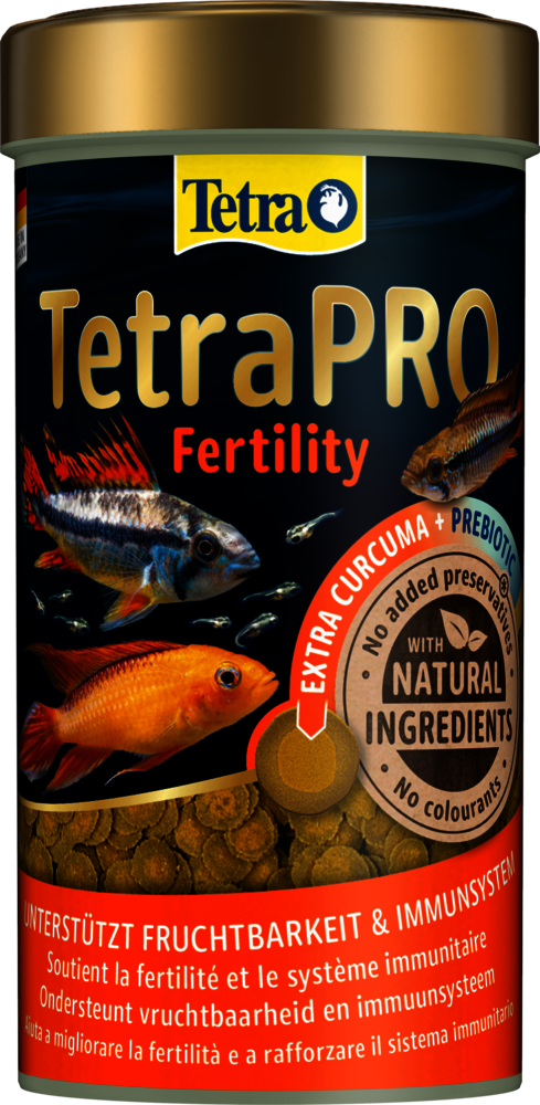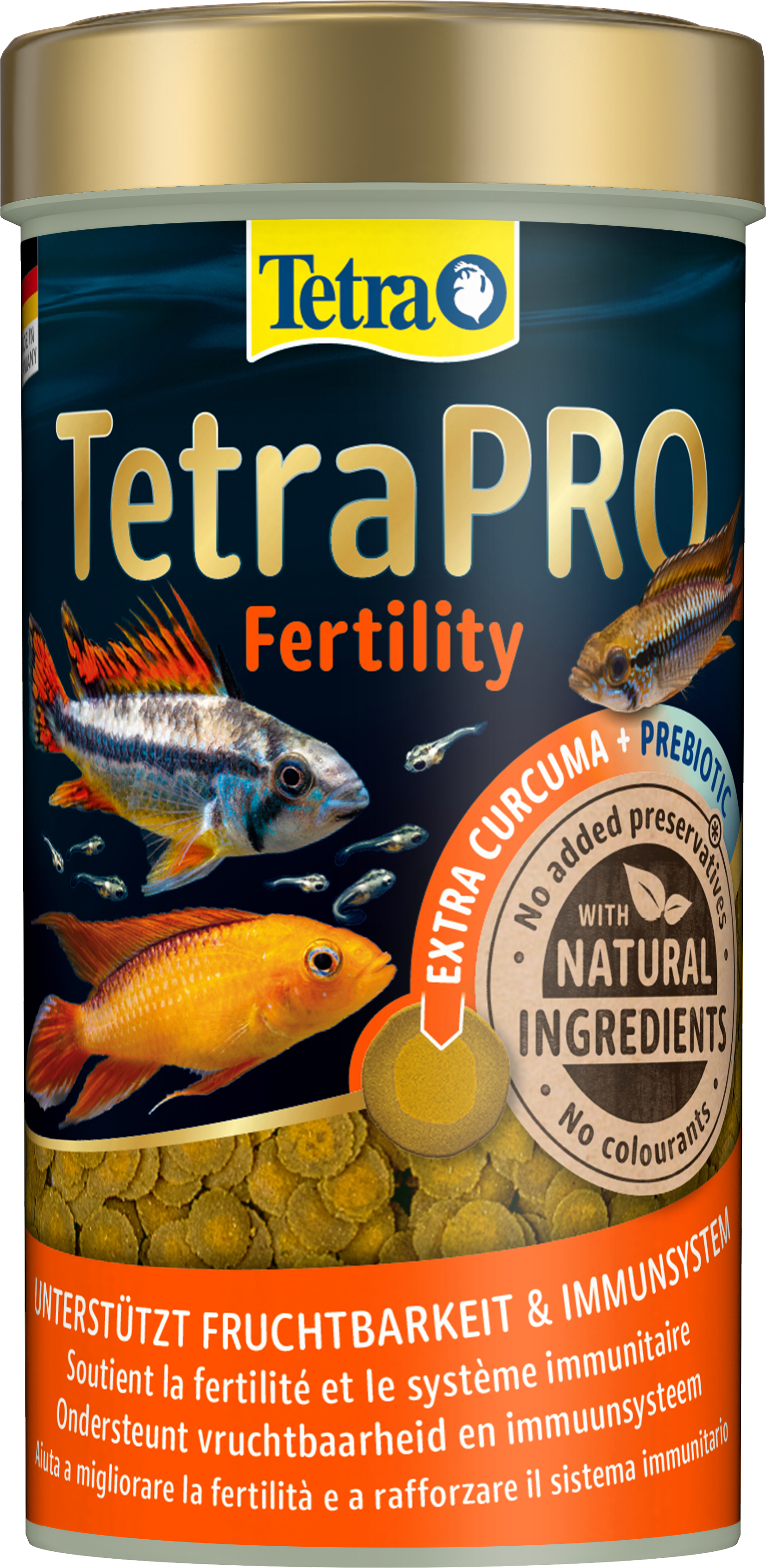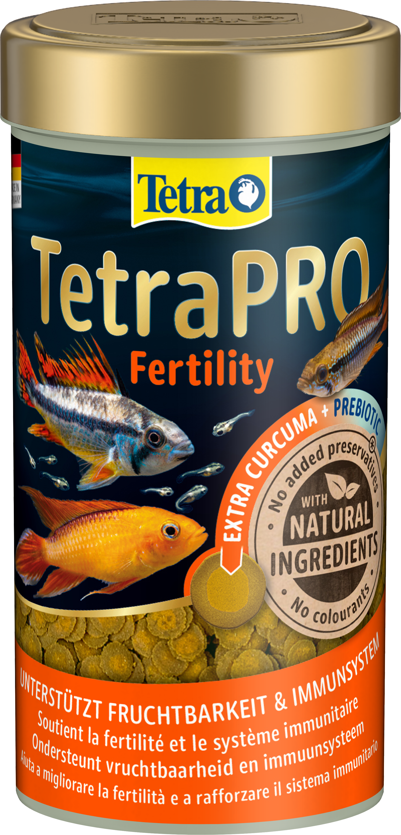 TetraPRO Fertility ist ein schonend hergestelltes und besonders nahrhaftes Premium-Hauptfutter mit Kurkuma zur Unterstützung des Zuchterfolgs, der Eiqualität und der Entwicklung der Larven.