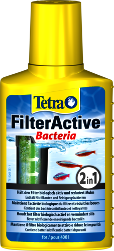 Tetra FilterActive hält den Filter biologisch aktiv und auf natürliche Weise länger sauber. Es enthält lebende Starterbakterien und Mulm abbauende Reinigungsbakterien, die den biologischen Abbau von Ammoniak, Nitrit, Fischkot, Mulm, Futter- und Pflanzenresten und Filterschlamm beschleunigen.