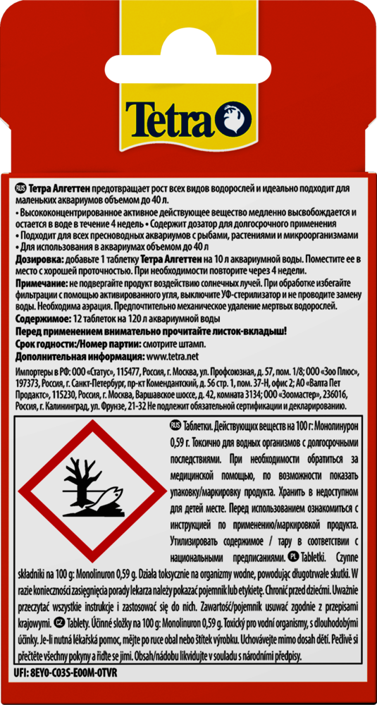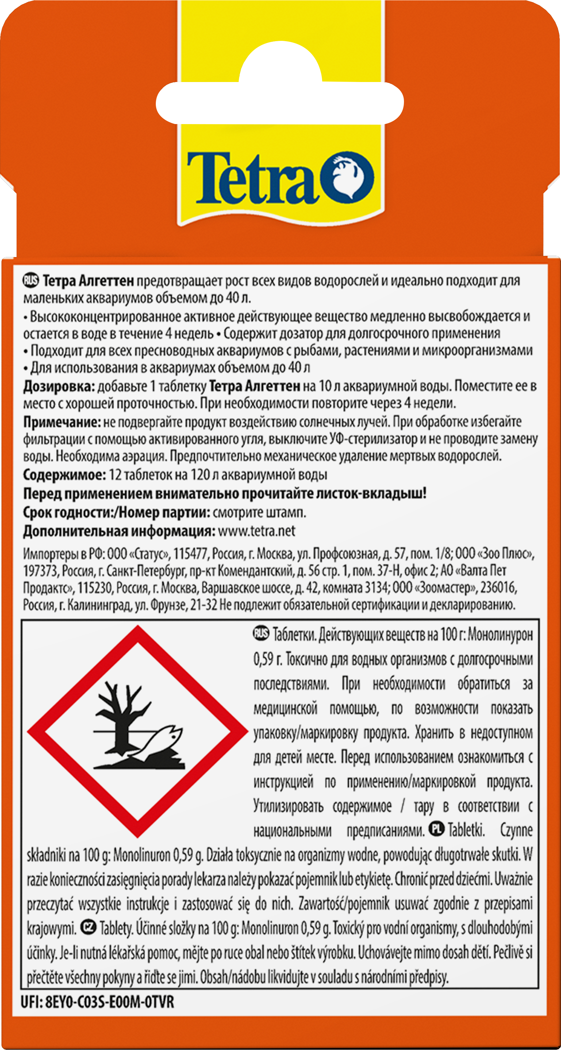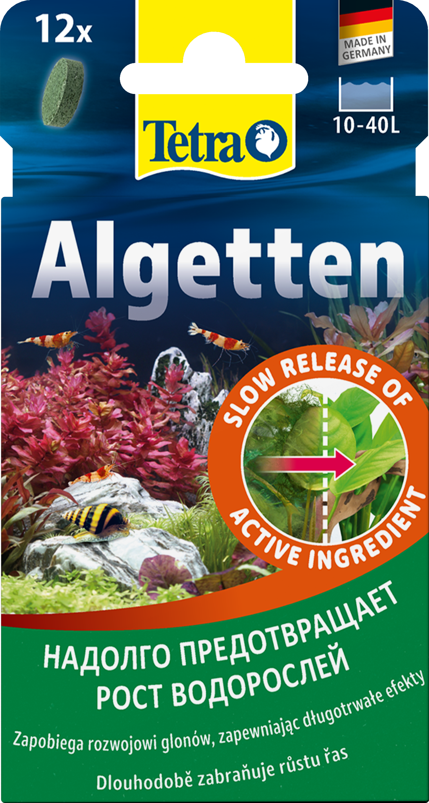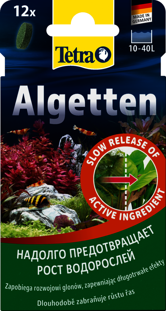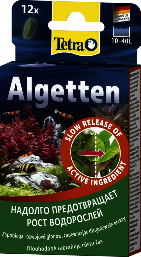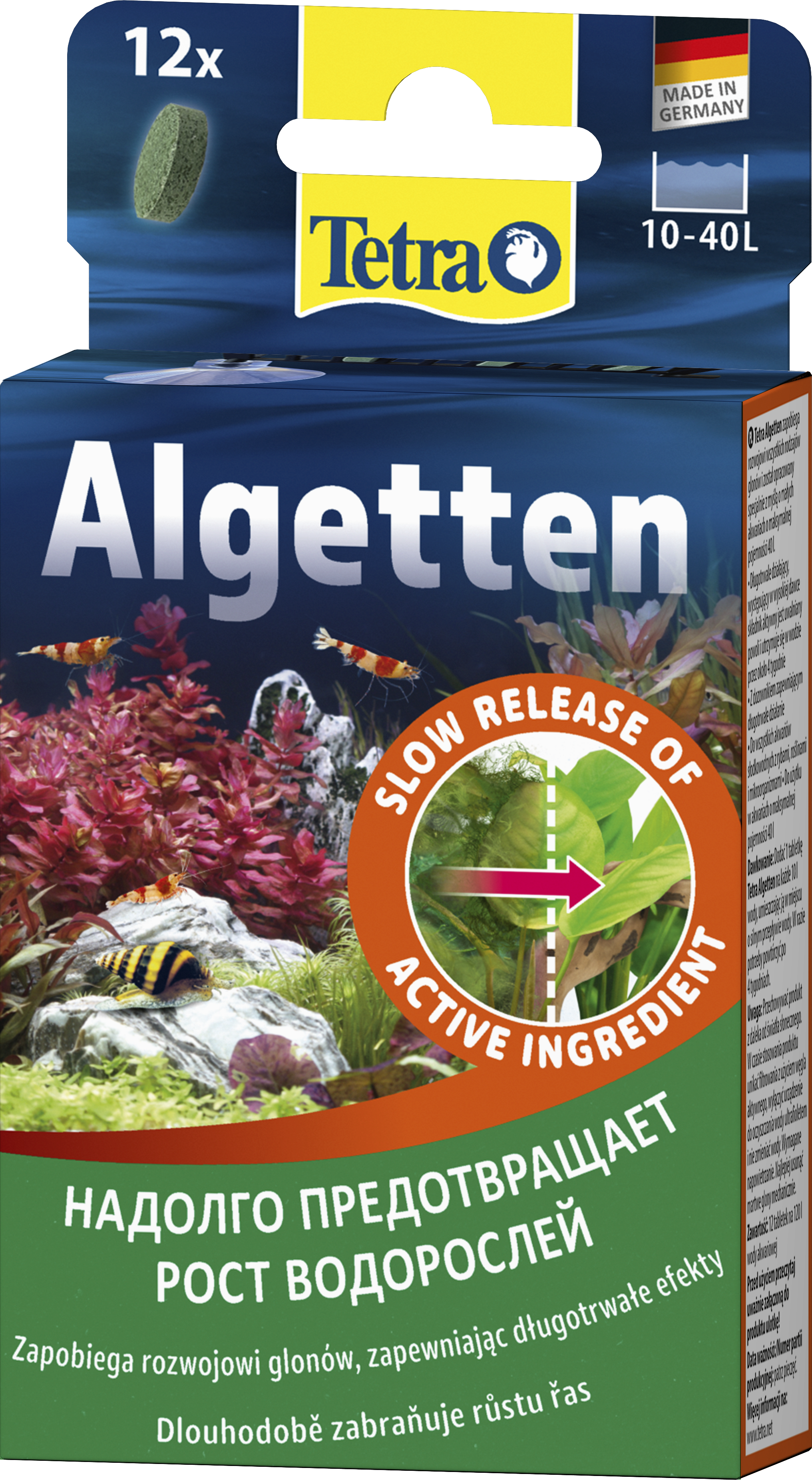 Τα Tetra Algetten* παρέχουν βέλτιστο έλεγχο της άλγης για ενυδρεία γλυκού νερού έως 40 L, αποτρέποντας την αντιαισθητική ανάπτυξη άλγης που μπορεί να εμποδίσει την ανάπτυξη των φυτών και να διαταράξει το οικοσύστημα του ενυδρείου σας. Το δραστικό συστατικό σε κάθε ταμπλέτα απελευθερώνεται αργά σε διάστημα τεσσάρων εβδομάδων, εξασφαλίζοντας συνεχή προστασία χωρίς να αποχρωματίζει το νερό. Απαλό για τα ψάρια, τα φυτά και τους μικροοργανισμούς, όταν χρησιμοποιείται σύμφωνα με τις οδηγίες, το Tetra Algetten* λειτουργεί διαταράσσοντας τον μεταβολισμό της άλγης, ενώ αφήνει την υδρόβια ζωή σας αλώβητη. Απλά προσθέστε ένα δισκίο ανά 10 L νερού ενυδρείου, τοποθετήστε το σε ένα μέρος όπου υπάρχει άφθονη κίνηση του νερού και επαναλάβετε μετά από τέσσερις εβδομάδες, εάν είναι απαραίτητο. Κατά τη διάρκεια της θεραπείας, διατηρήστε τον αερισμό (π.χ. με αεραντλία Tetra APS), απενεργοποιήστε τους διαυγαστήρες UV, αποφύγετε το φιλτράρισμα με ενεργό άνθρακα και αποφύγετε τις αλλαγές νερού. Απομακρύνετε μηχανικά τυχόν νεκρά φύκια για να διατηρήσετε την ποιότητα του νερού. Για μακροπρόθεσμη πρόληψη, ακολουθήστε τον έλεγχο των θρεπτικών συστατικών - όπως η μείωση των τιμών φωσφορικών και νιτρικών με το Tetra EasyBalance.