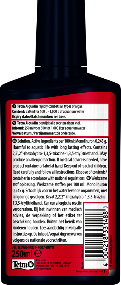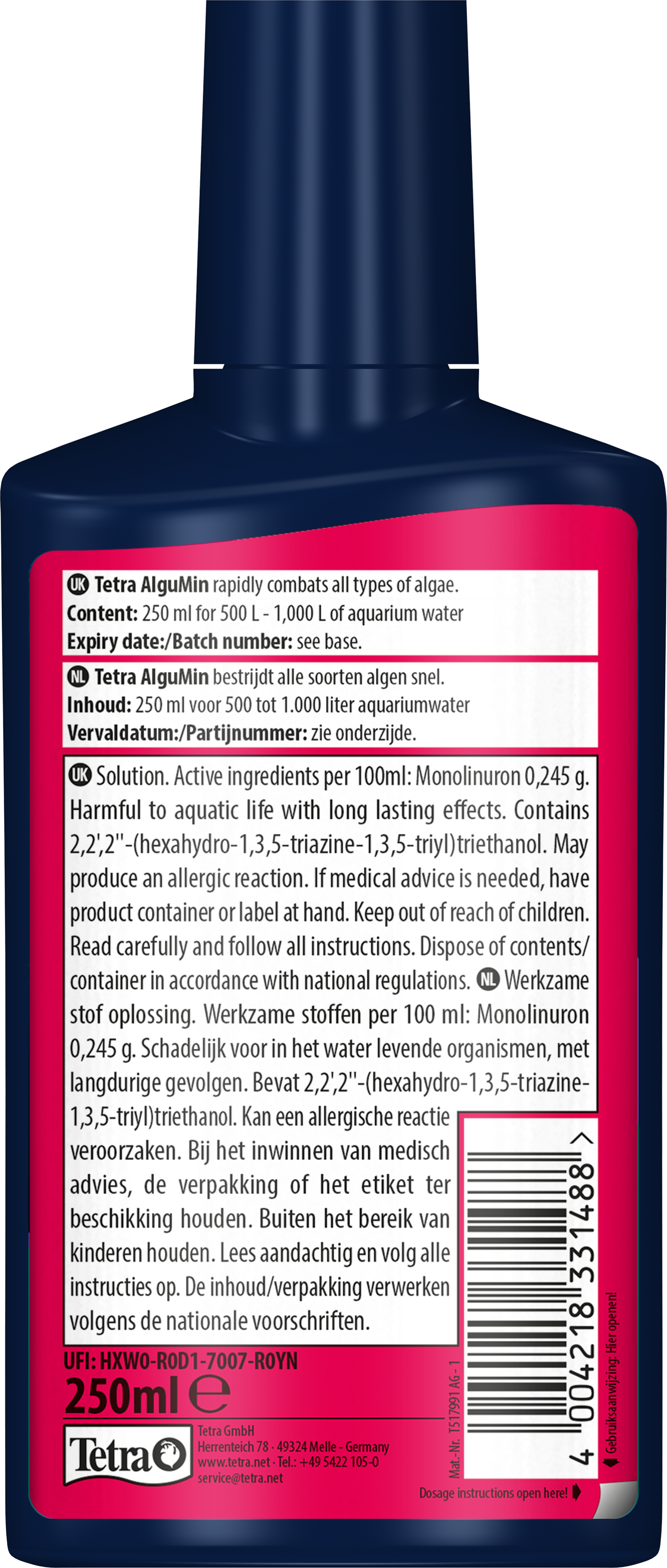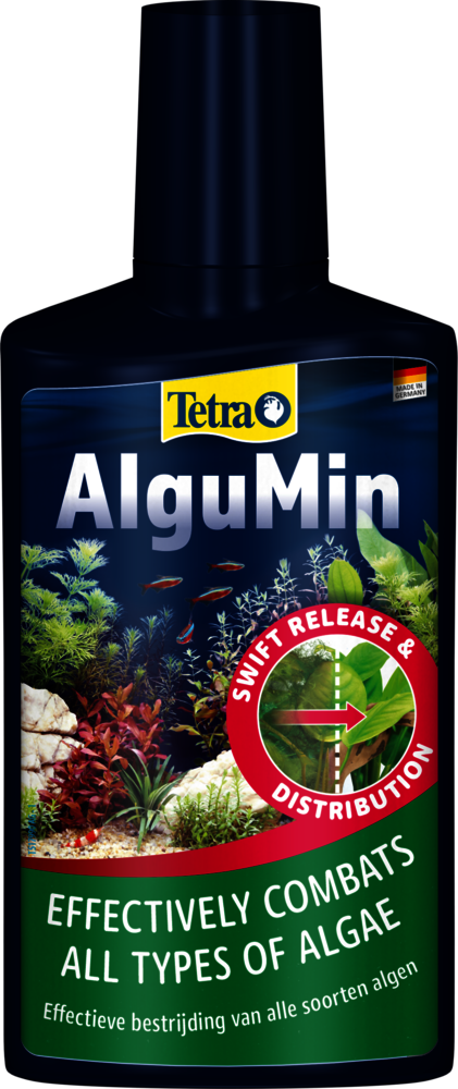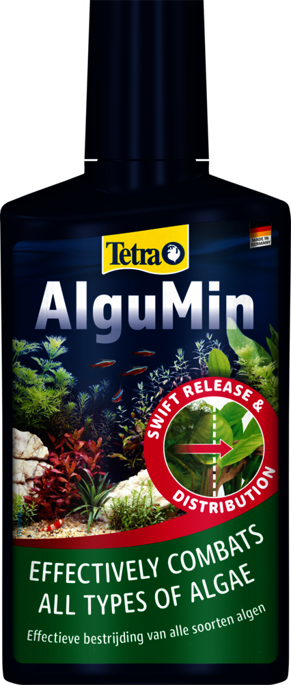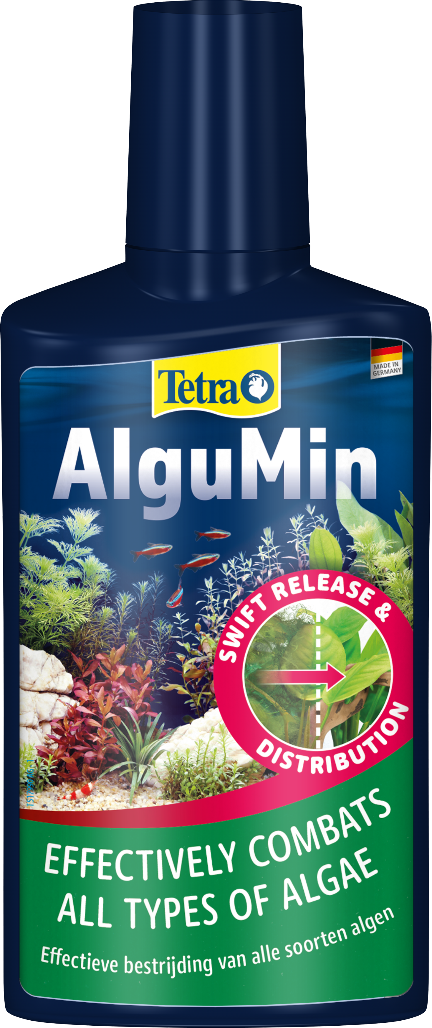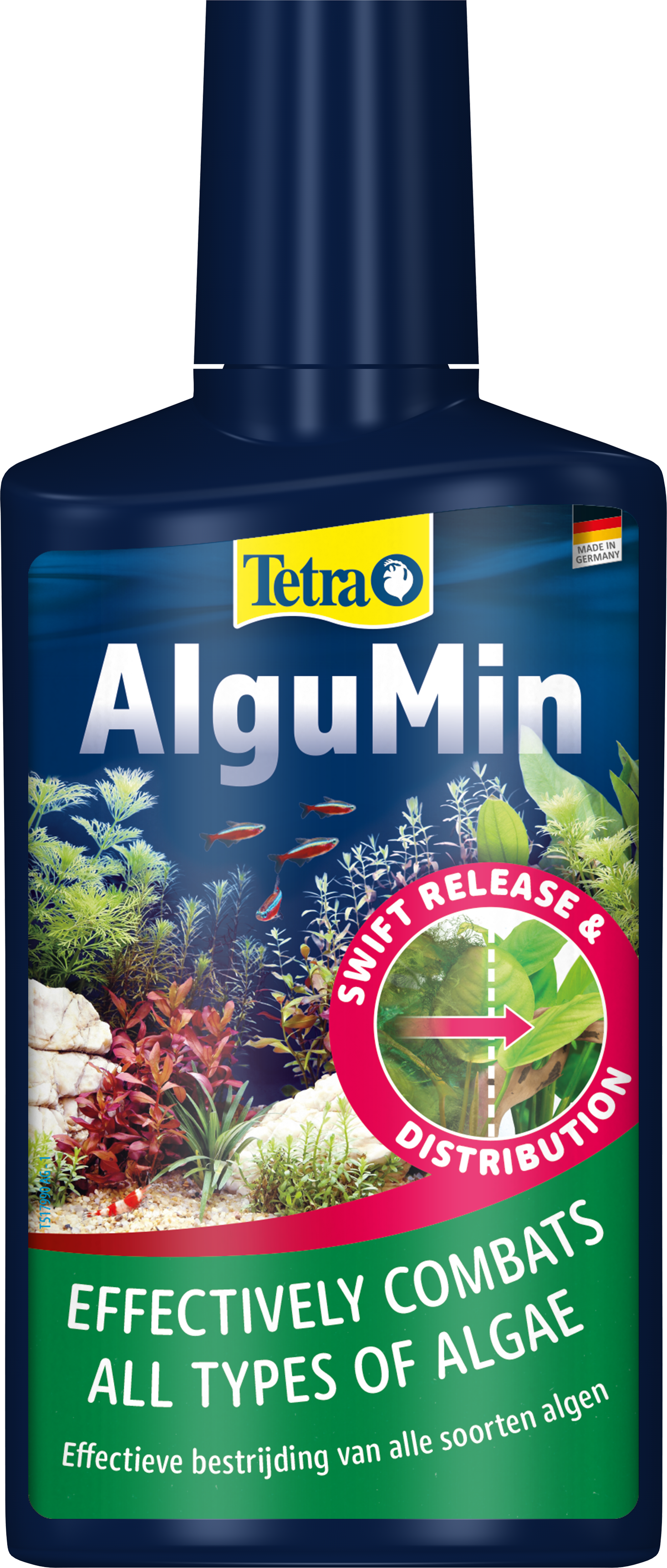 Το Tetra AlguMin* προσφέρει ταχεία ανακούφιση από όλους τους τύπους άλγης στα ενυδρεία γλυκού νερού, απελευθερώνοντας αμέσως το εξαιρετικά ενεργό συστατικό του. Η υγρή φόρμουλα επιτρέπει την ομοιόμορφη κατανομή στο νερό για να επιτεθεί στο μεταβολισμό της άλγης. Το Tetra AlguMin* δεν χρωματίζει ούτε θολώνει το νερό. Ανακινήστε καλά πριν από τη χρήση και προσθέστε 5 ml Tetra AlguMin* ανά 10 L νερού ενυδρείου σε χώρο με καλή κυκλοφορία. Εάν οι επίμονες εστίες επιμένουν, επαναλάβετε κάθε δύο εβδομάδες με τη μισή δόση. Διατηρείτε πάντα το προϊόν μακριά από το άμεσο ηλιακό φως. Κατά τη διάρκεια της θεραπείας απενεργοποιήστε τους διαυγαστήρες UV, αποφύγετε τη διήθηση με ενεργό– άνθρακα και αποφύγετε τις αλλαγές νερού, ενώ παράλληλα εξασφαλίστε επαρκή αερισμό (π.χ. με αεραντλία Tetra APS) και απομακρύνετε μηχανικά τυχόν νεκρά φύκια για να διατηρήσετε την ποιότητα του νερού. Για να αποφύγετε νέες εστίες, μειώστε την περίσσεια θρεπτικών συστατικών - όπως φωσφορικά και νιτρικά - για παράδειγμα με το Tetra EasyBalance, και εξετάστε το ενδεχόμενο τακτικής χρήσης προϊόντων βραδείας– αποδέσμευσης, όπως το Tetra Algetten* για ενυδρεία έως 40 L ή το Tetra AlgoStop depot* για μεγαλύτερα σύνολα.
