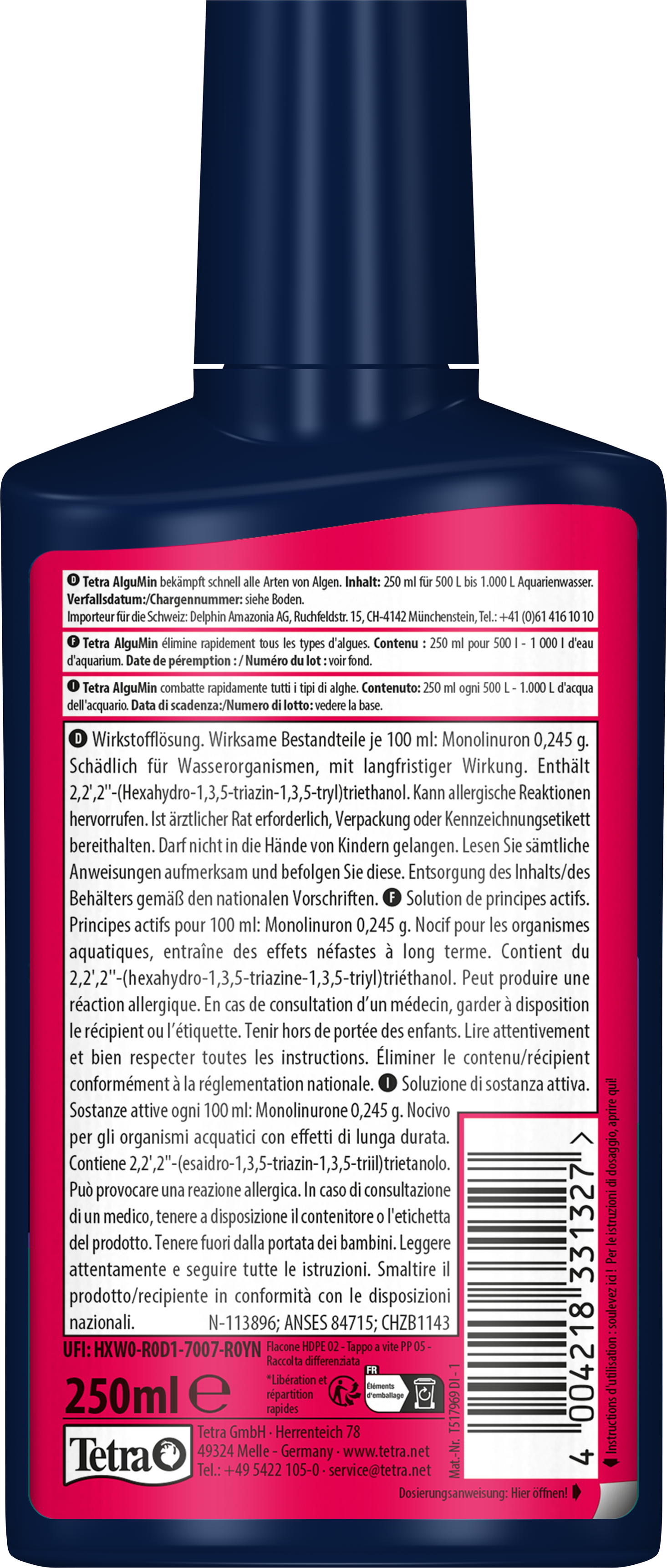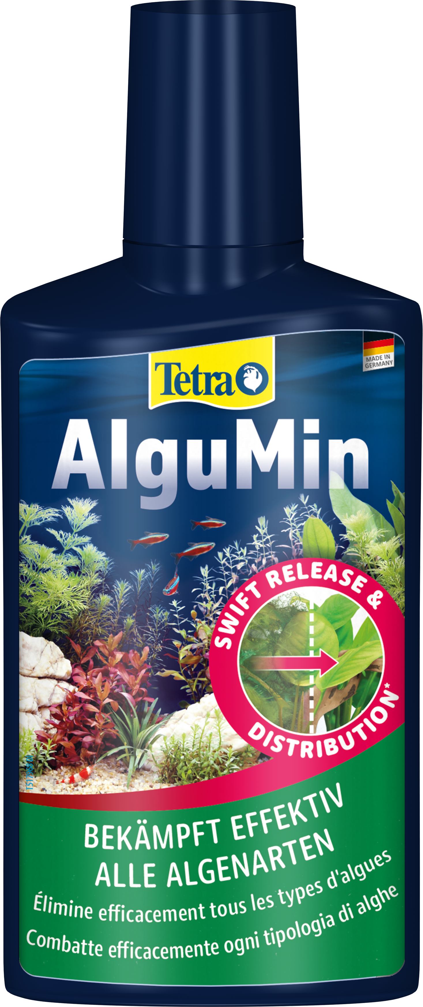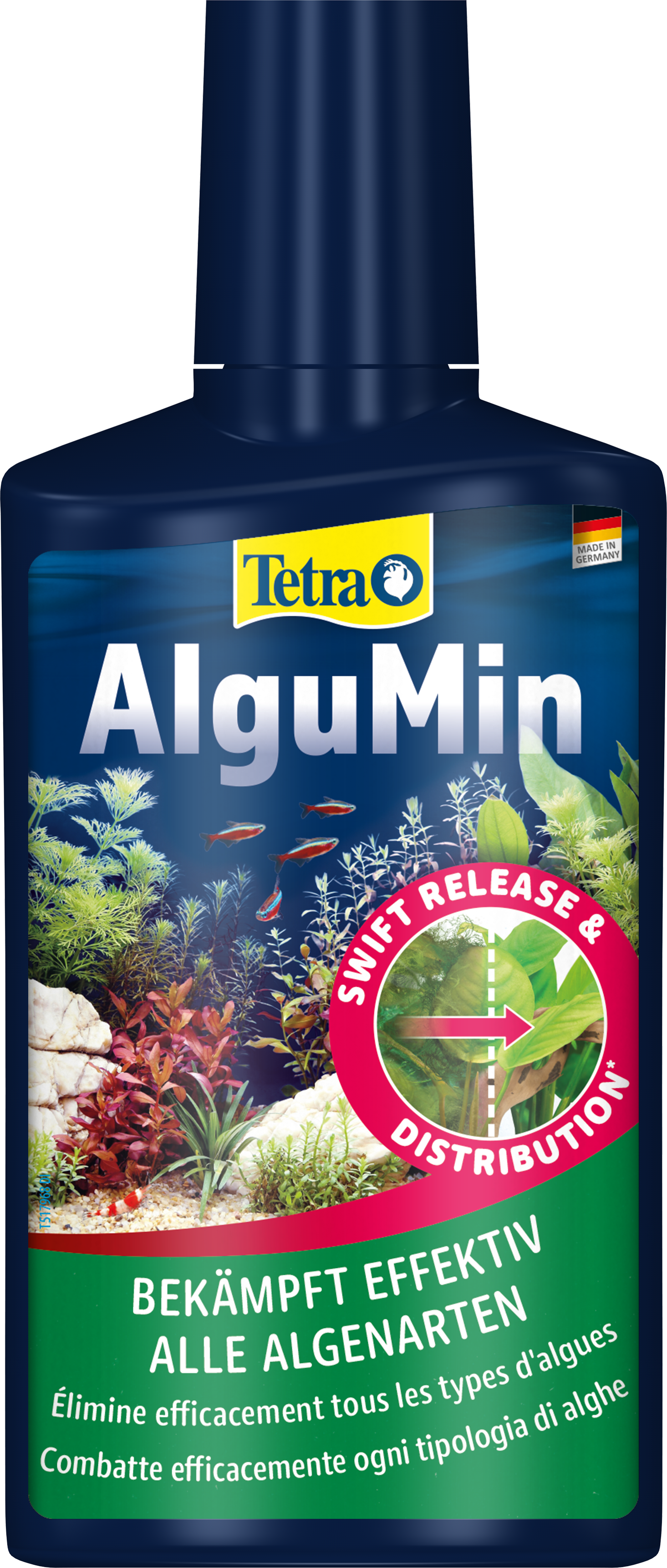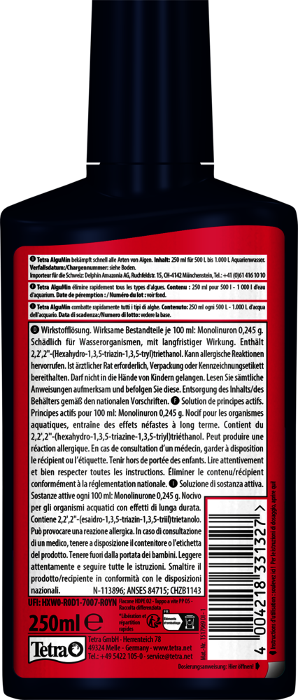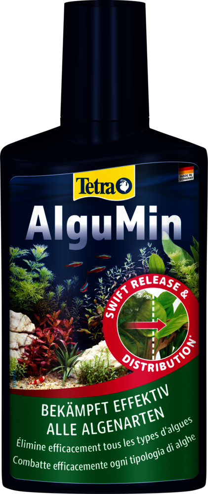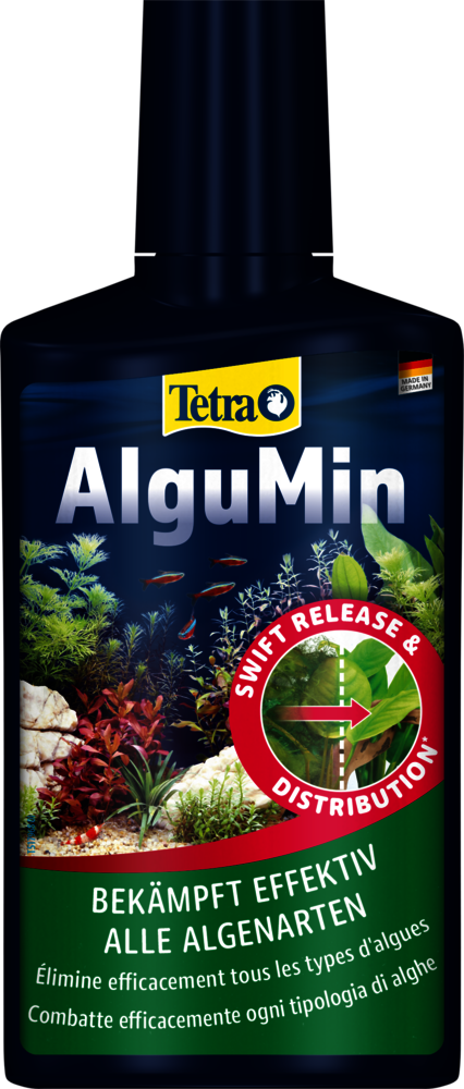 Tetra AlguMin* offers rapid relief from all types of algae in freshwater aquariums by releasing its highly active ingredient immediately. The liquid formula allows for even distribution in the water to attack algae metabolism. Tetra AlguMin* does not colour or cloud the water.