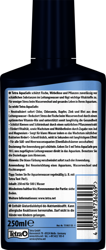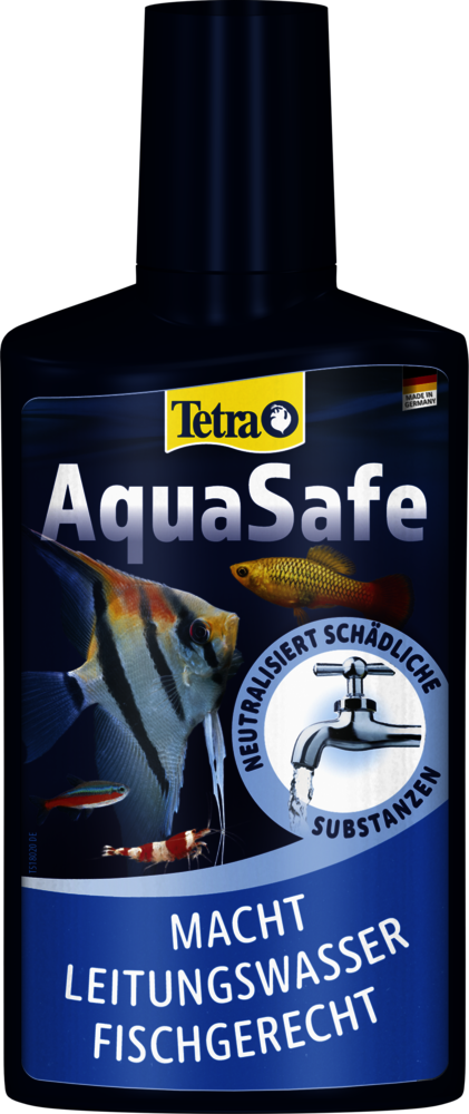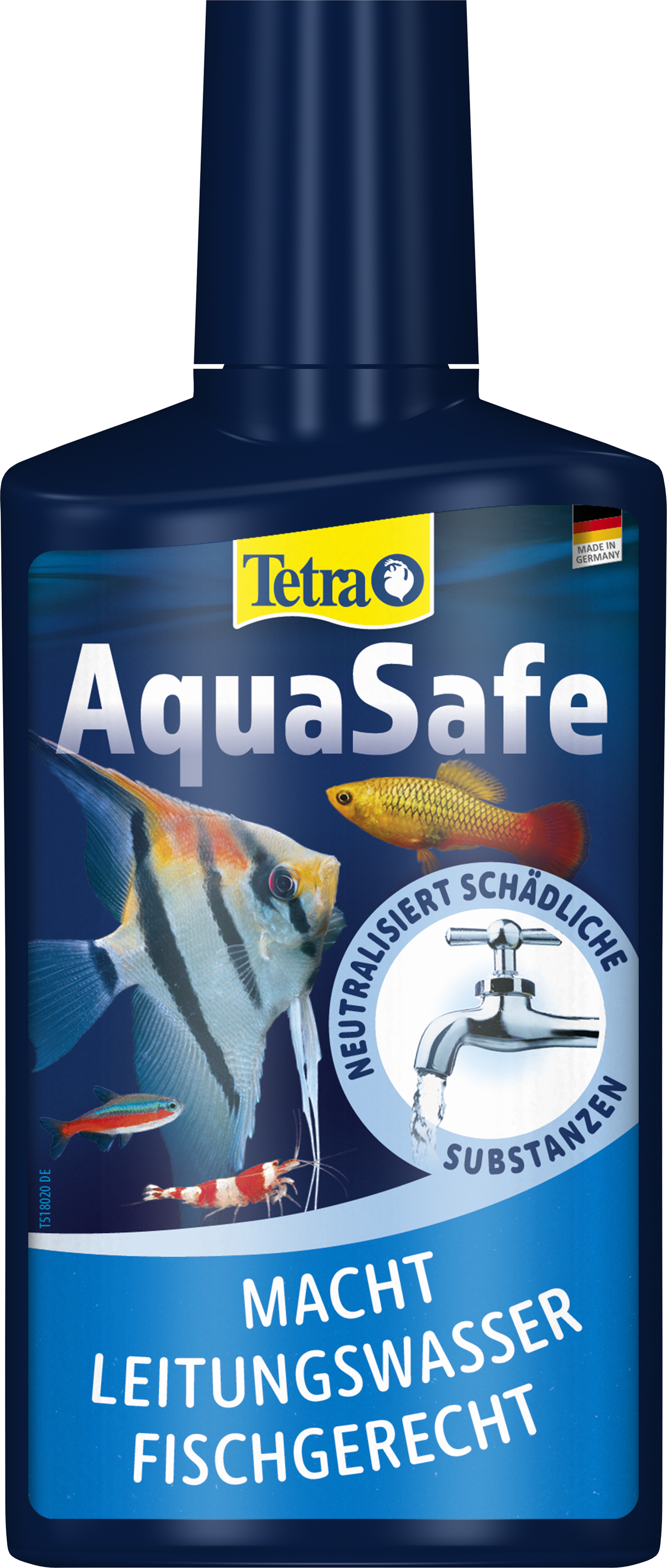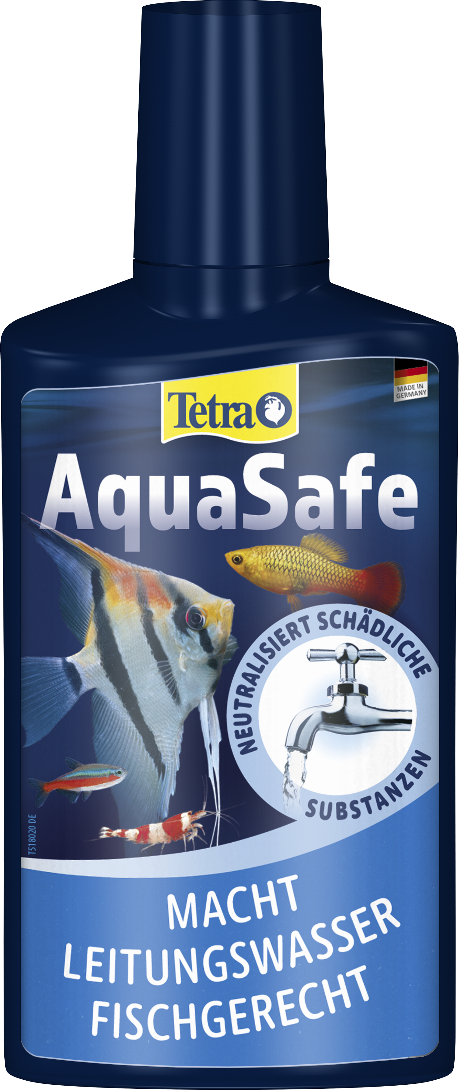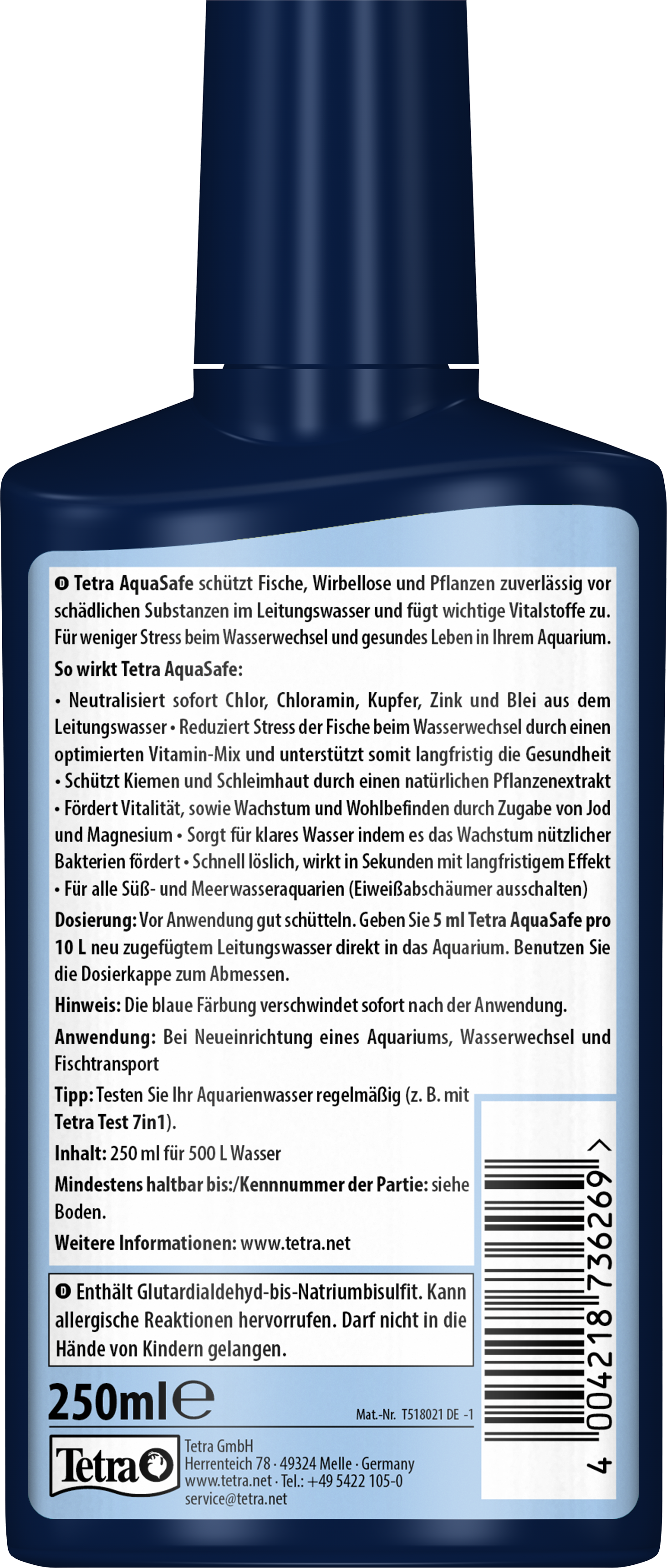 Tap water is not suitable for ornamental fish - but with Tetra AquaSafe, it becomes a safe and supportive environment in seconds. Whether you're setting up a new aquarium or performing a routine water change, AquaSafe instantly neutralises harmful substances like chlorine, chloramine, copper, zinc, and lead, making tap water safe for all freshwater and marine fish. But Tetra AquaSafe does more than just protect. A specially tailored blend of vitamin B helps to reduce stress during water changes, while natural plant extracts shield sensitive gills and mucous membranes. Its optimised care formula is specially developed to nourish fish skin and fins, while added iodine boosts vitality and magnesium encourages strong growth in both fish and aquatic plants. Tetra AquaSafe also promotes the growth of beneficial bacteria, helping to maintain clean, biologically balanced water. Tip: Test your aquarium water regularly – for example, with Tetra Test 7in1 – to monitor water quality and maintain a healthy aquatic environment. Fast-dissolving and easy to use, AquaSafe is suitable for all freshwater and marine aquariums. For marine tanks, simply switch off the protein skimmer during application to prevent excess foaming. To ensure the best results, shake well before use. Add 5 ml of Tetra AquaSafe for every 10 L of newly added tap water directly into the aquarium. The blue colouration of the liquid disappears immediately after application. Choose Tetra AquaSafe for a safe aquarium.