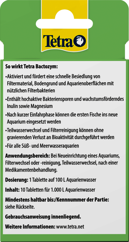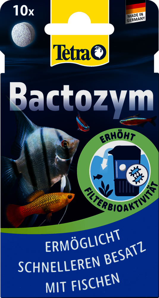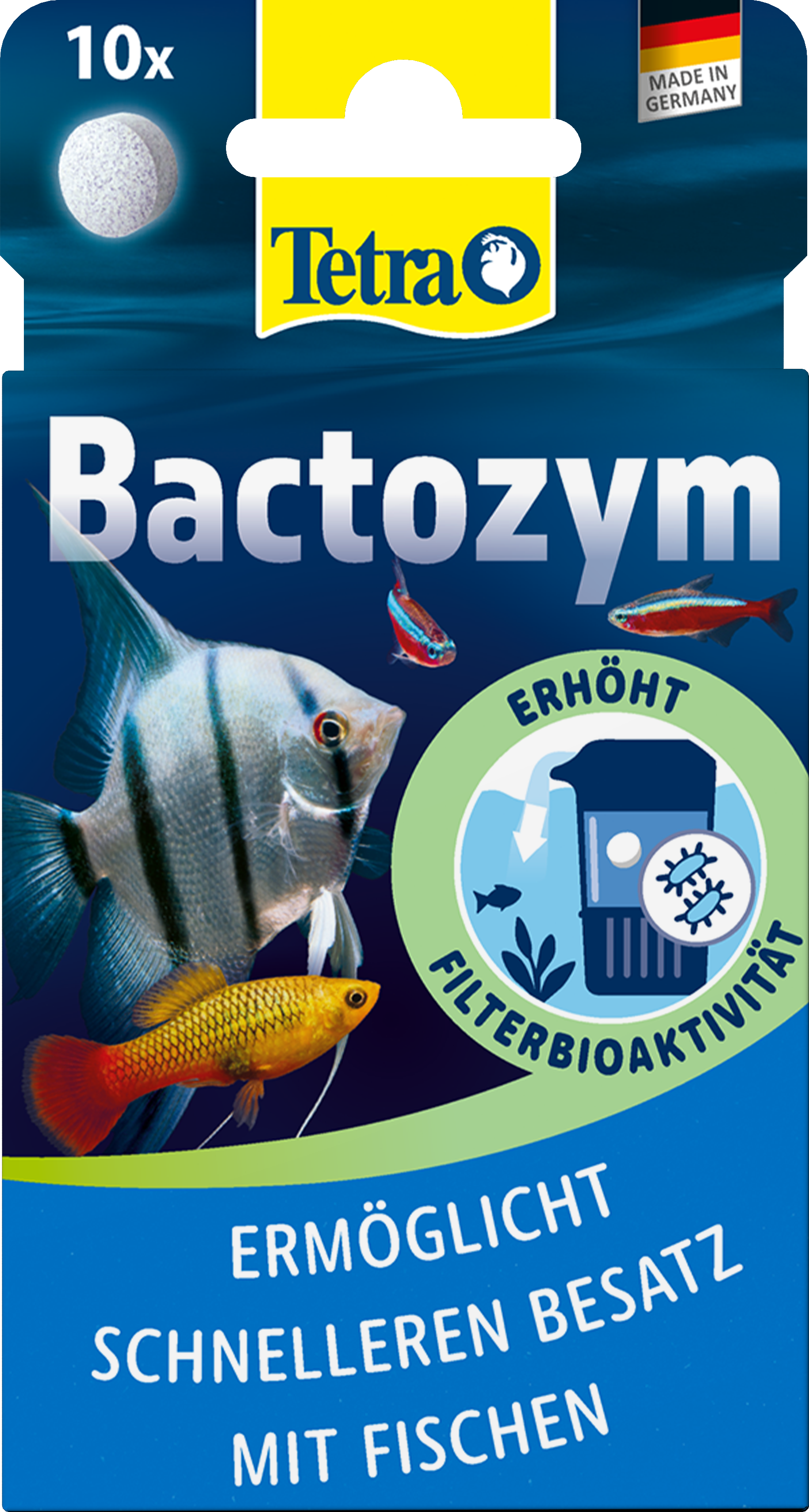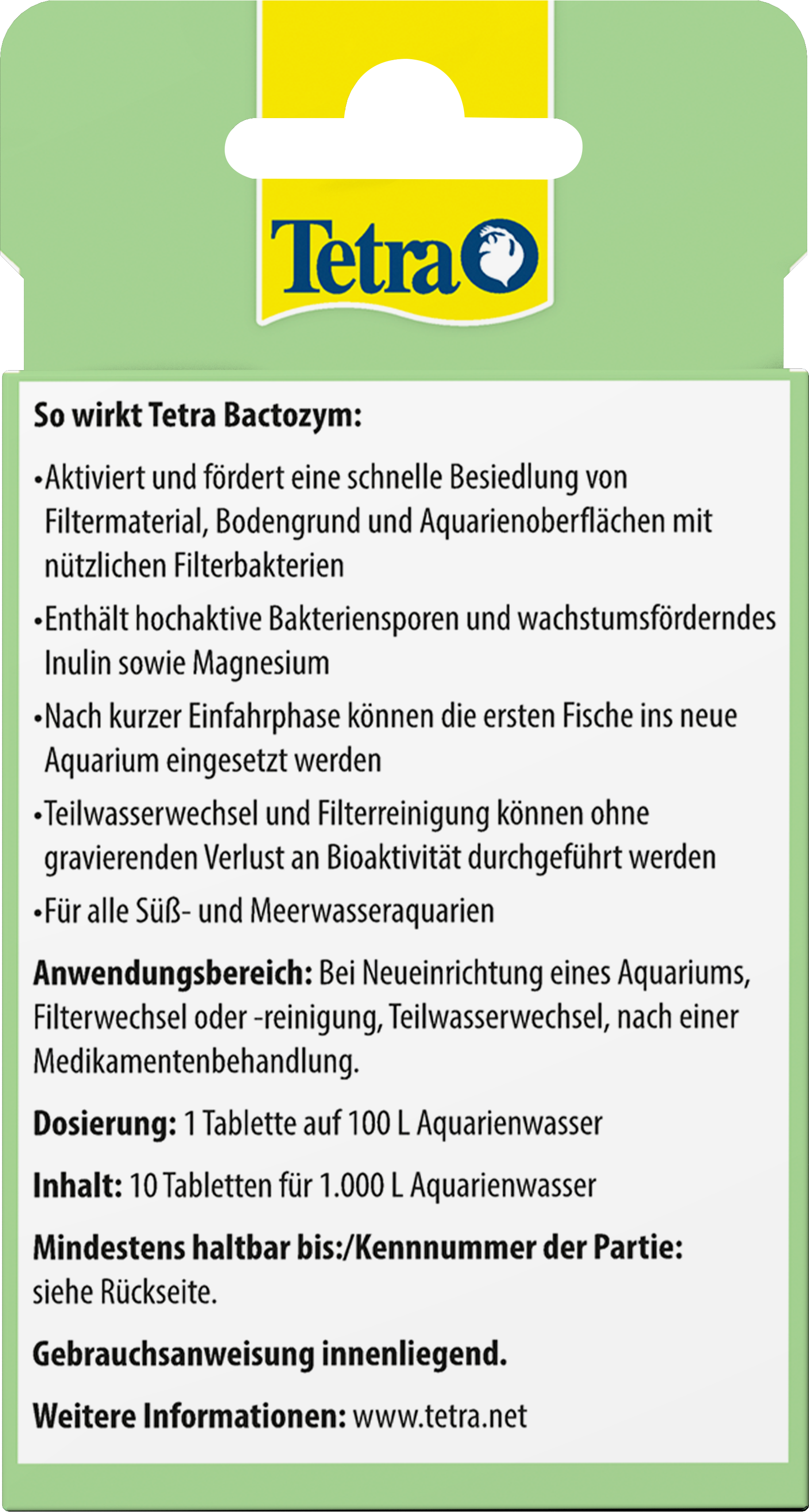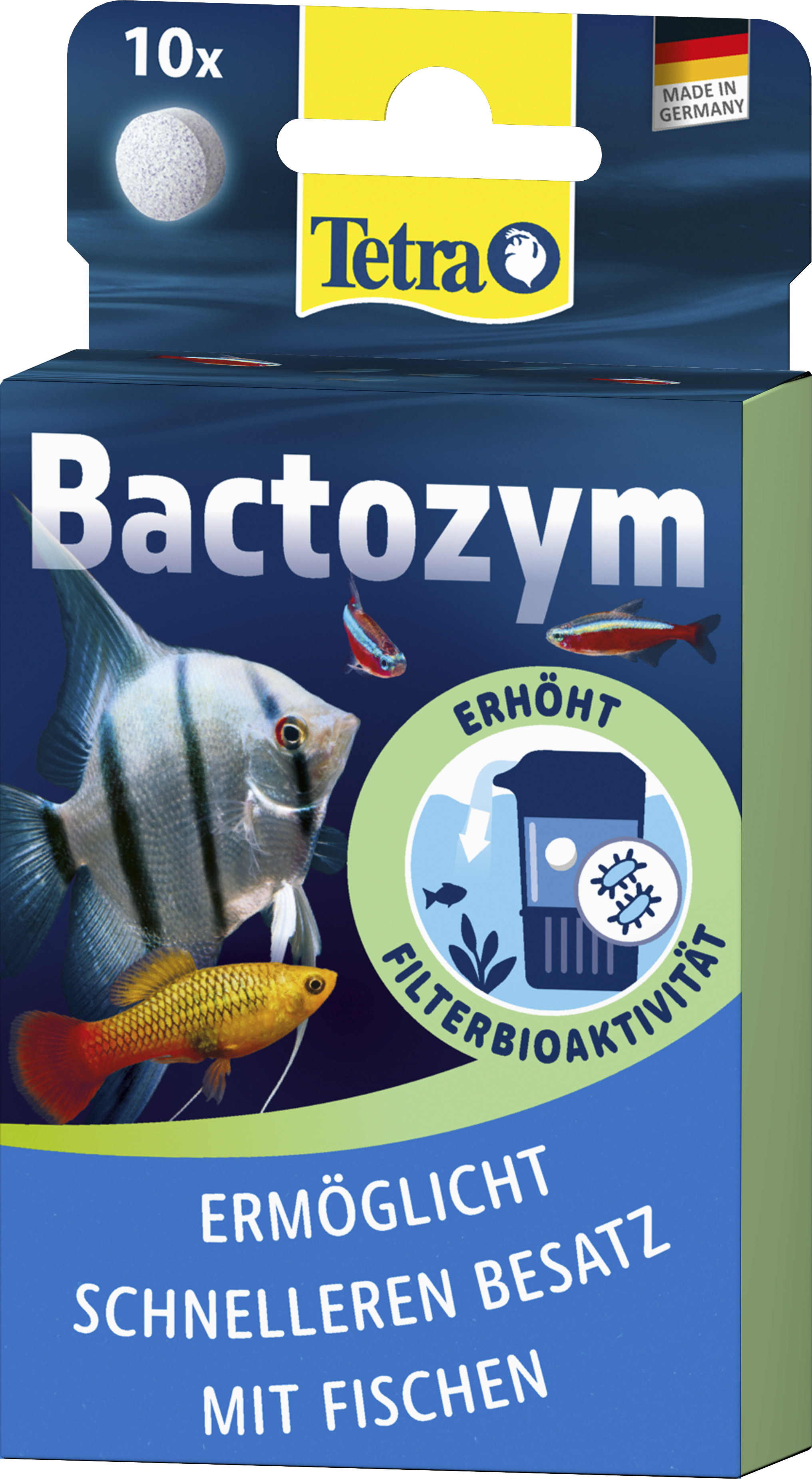 Tetra Bactozym is a fast and reliable solution in tablet format to establish and maintain biological activity in your aquarium and accelerate the running-in phase. Its formula contains an optimised mix of bacterial spores, magnesium and inulin, to ensure that beneficial bacteria quickly colonise primarily filter media. They naturally form a biofilm that provides the perfect environment for bacteria to settle and thrive, supporting the breakdown of harmful substances such as ammonia and nitrite right from the start. By accelerating the settling of nitrifying bacteria, Tetra Bactozym makes it possible to introduce the first fish just 24 hours after setting up a new aquarium. It also promotes the effective breakdown of organic impurities, helping to create a stable and healthy environment for fish and plants. One of the key advantages of Tetra Bactozym is that essential bioactivity remains intact even after cleaning the filter, partial water changes or medication treatments, meaning you can carry out necessary maintenance without compromising the stability of your aquarium. This makes it an indispensable aid for reducing stress during routine care while keeping water values consistently safe. Application is simple and convenient: one tablet is sufficient for 100 L of aquarium water. Tetra Bactozym is suitable for both freshwater and marine aquariums, making it a versatile and effective choice for aquarists who want to support a strong biological balance.