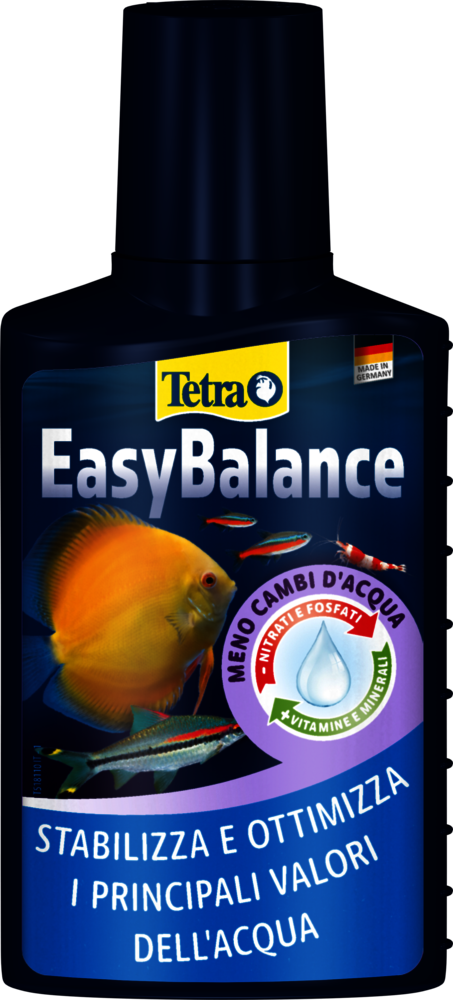 Tetra EasyBalance is a unique water care solution that keeps your aquarium healthy and in balance with minimal effort. No matter if you are a beginner or an advanced aquarist: By reliably stabilising important water values such as carbonate hardness (KH) and pH, Tetra EasyBalance makes caring for your aquarium much easier. Aquariums with soft water, such as those housing sensitive species like discus fish, particularly benefit from the KH-stabilising effect, as it ensures stable and safe conditions over time. Reducing substances like nitrate and phosphate not only prevents algae growth but also protects fish and plants from stress, ensuring they can thrive in a stable, natural environment. Weekly use of Tetra EasyBalance reduces the number of partial water changes needed. This way, Tetra EasyBalance makes your hobby less time-consuming and helps to save tap water, contributing to more environmentally friendly fishkeeping. Additionally, the product enriches the aquarium water with essential vitamins, trace elements and minerals that fish, invertebrates and plants need for a healthy life. For best results, Tetra EasyBalance should be shaken well before use and added once a week at a dosage of 2.5 ml per 10 L of aquarium water. A sufficient oxygen supply should be ensured, for example by using the Tetra APS air pumps. Within the liquid, pale granules may be visible; they sink to the bottom of the aquarium and are completely harmless to fish and invertebrates, even if ingested. It is important to note that Tetra EasyBalance is not a tap water conditioner and therefore should always be used alongside Tetra AquaSafe whenever new tap water is added. Check the water values in your aquarium regularly with the Tetra Test 7in1.