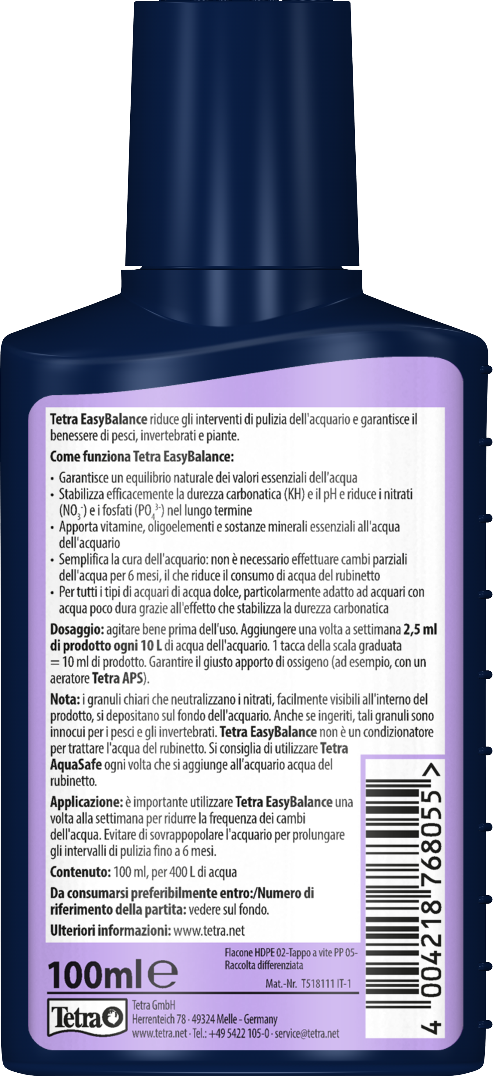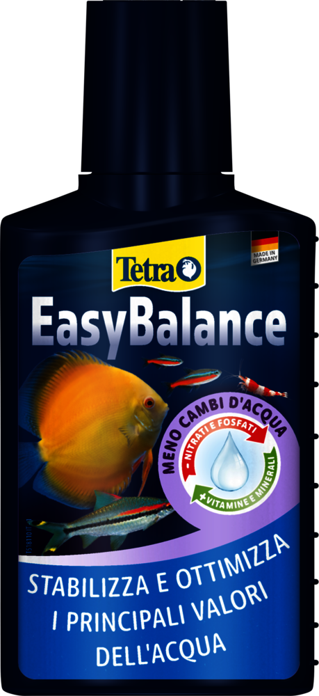 Tetra EasyBalance is a unique water care liquid that keeps your aquarium in balance with minimal effort. It stabilises the pH and carbonate hardness (KH) while reducing nitrate and phosphate in a biological way to extend cleaning intervals. At the same time, the product enriches the aquarium water with essential vitamins, trace elements and minerals that fish and plants need for a healthy life.