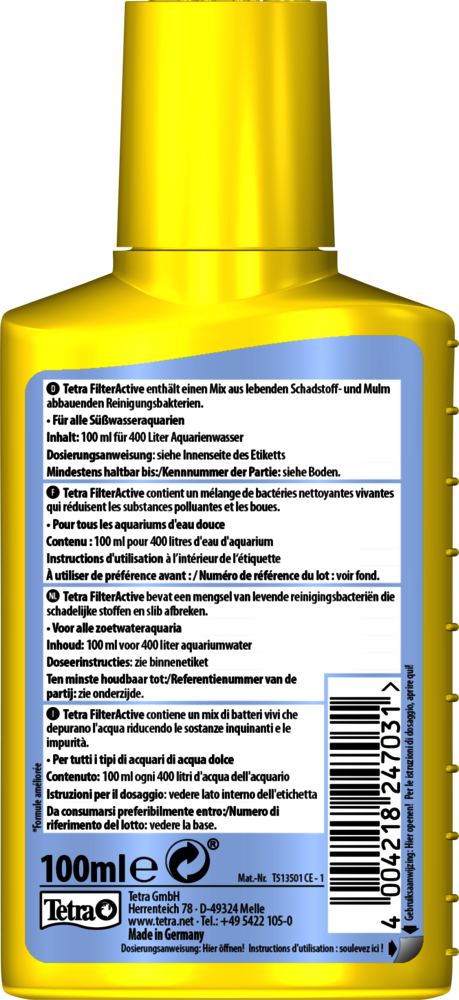 Tetra FilterActive contains a mix of living starter and sludge-reducing cleaning bacteria. Some important bacteria are lost through the regular cleaning an aquarium requires. Tetra FilterActive rebalances bacteria lost when the water is changed or the filter is cleaned. Tetra FilterActive contains living starter bacteria that settle in the filter on the filter material and maintain the biological balance in the aquarium. These nitrifiers are important for breaking down nitrite and ammonia, which are harmful to fish. This product provides immediate support for the biological activity in the aquarium. Tetra FilterActive also contains sludge-reducing cleaning bacteria that keep the filter cleaner for longer with their natural action. They accelerate the biological decomposition of organic pollutants such as fish waste, built-up sludge, food remains and dead plant materials. This improves the filter’s performance and extends the intervals between cleaning. It also promotes bioactivity in the substrate and prevents decay. This helps to keep the aquarium inhabitants happy and healthy and reduces the maintenance the aquarium needs. Tetra FilterActive contains natural bacterial cultures and is 100% biological. Its liquid formula is very easy to use and does not cloud the water. It can also be used to support the biological activity in the aquarium when new fish are added or the water is heavily contaminated due to a large number of fish.