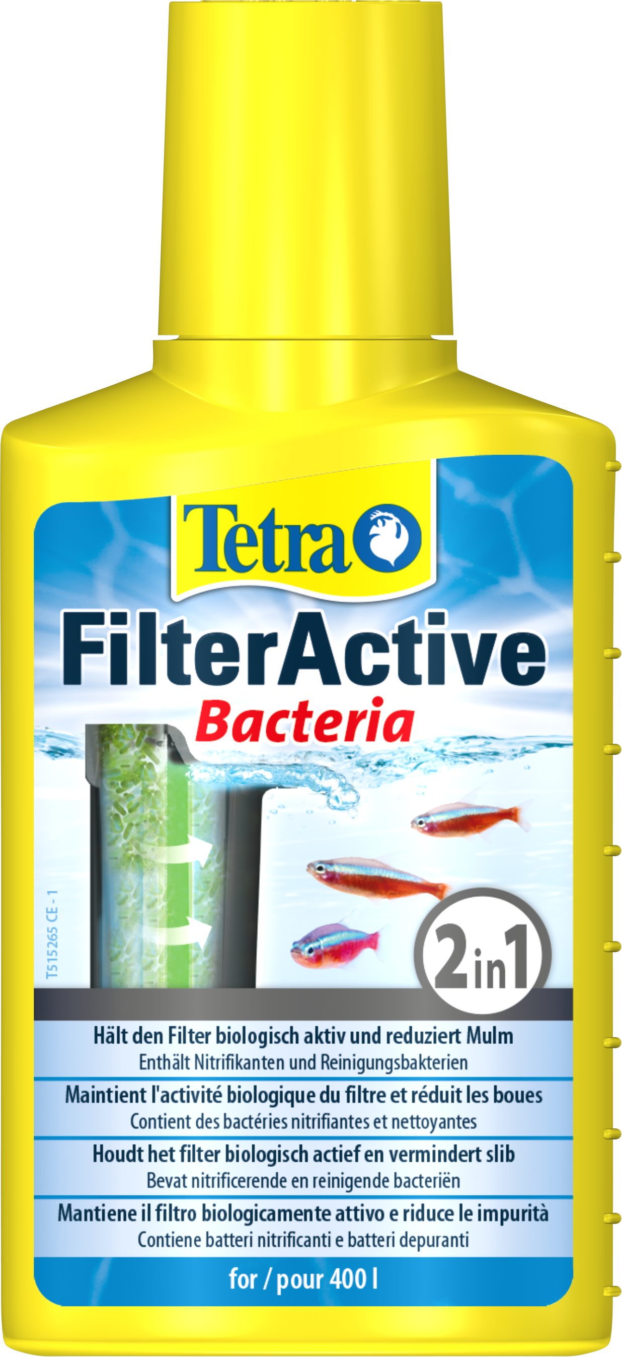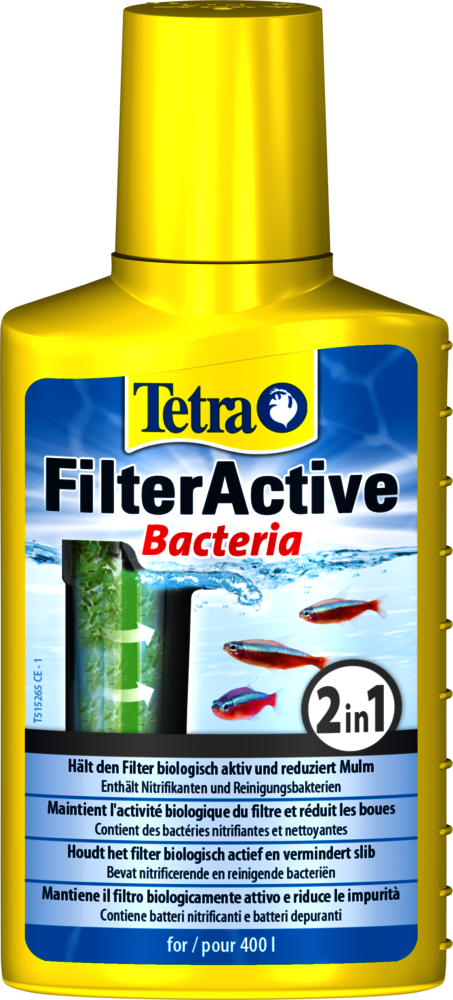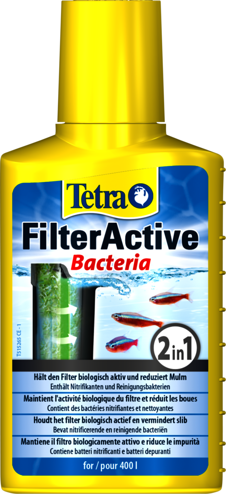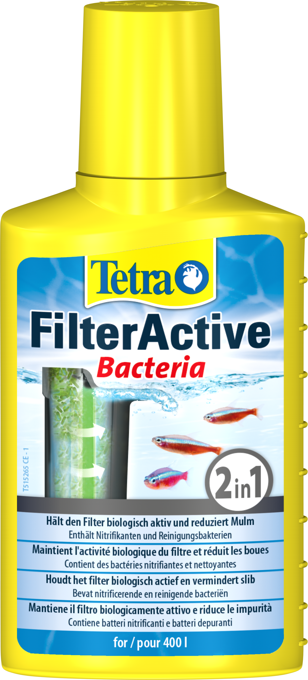 Tetra FilterActive also provides these live, nitrifying bacteria. But its new 2in1 formula also contains sediment-reducing cleaning bacteria. The new formula reduces cleaning effort because sediment does not need to be removed from the filter as often. Tetra FilterActive also replenishes the nitrifiers lost after cleaning the filter, changing the water or medical treatment and re-establishes biological activity in the aquarium. Tetra FilterActive can also be used when new fish are added to the aquarium to prevent potential fluctuations in the biological balance. The new 2in1 formula can also be used if high stocking density leads to a build-up of sludge and sediment. In this case, weekly use is recommended.