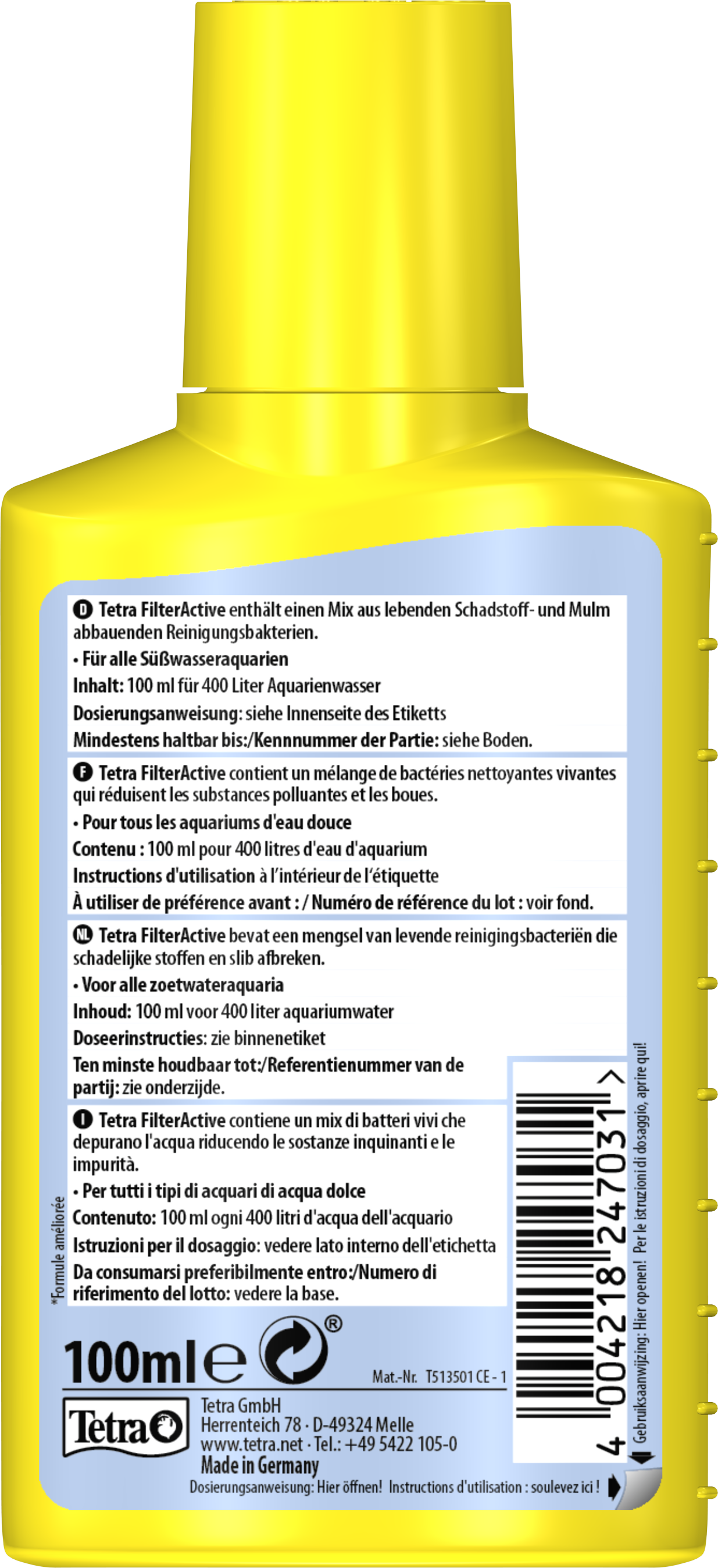 Tetra FilterActive keeps the filter biologically active and keeps it cleaner for longer with its natural action. It contains live starter bacteria and sludge-reducing cleaning bacteria that accelerate the biological degradation of ammonia, nitrite, fish waste, sludge, food and plant remains and filter mud.
