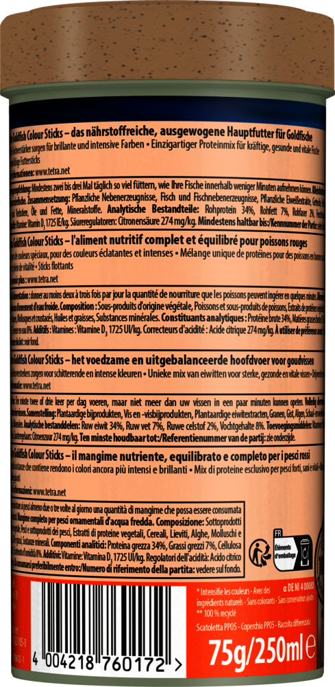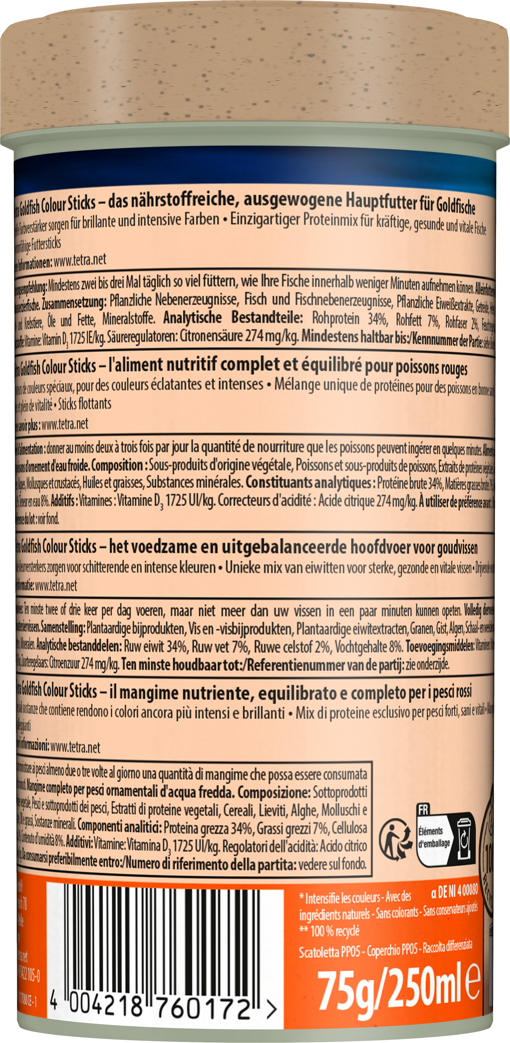 Tetra Goldfish Colour Sticks is a nutritious, balanced complete food for goldfish with colour enhancers. The optimal quality of the balanced diet supports the health and well-being of the fish. The food contains colour enhancers that ensure brilliant and intense colours. The floatable food sticks minimise waste and water pollution thanks to their high digestibility. The unique recipe, which is with high-quality natural ingredients, without colourants and added preservatives, and the optimally tailored protein-mix promote optimal growth, vitality and increased resilience. With Tetra Goldfish Colours Sticks, your goldfish will thrive, and your aquarium water will stay clean and clear.