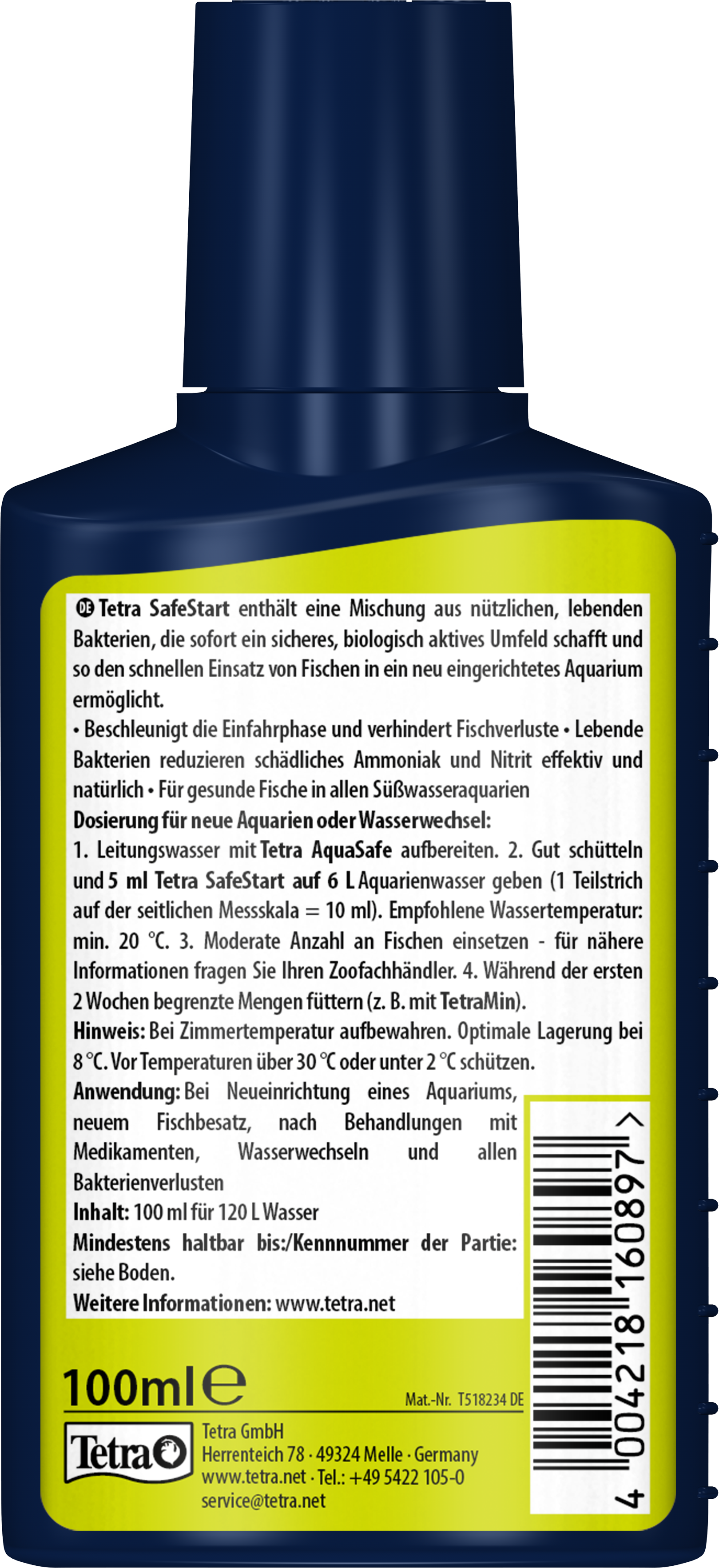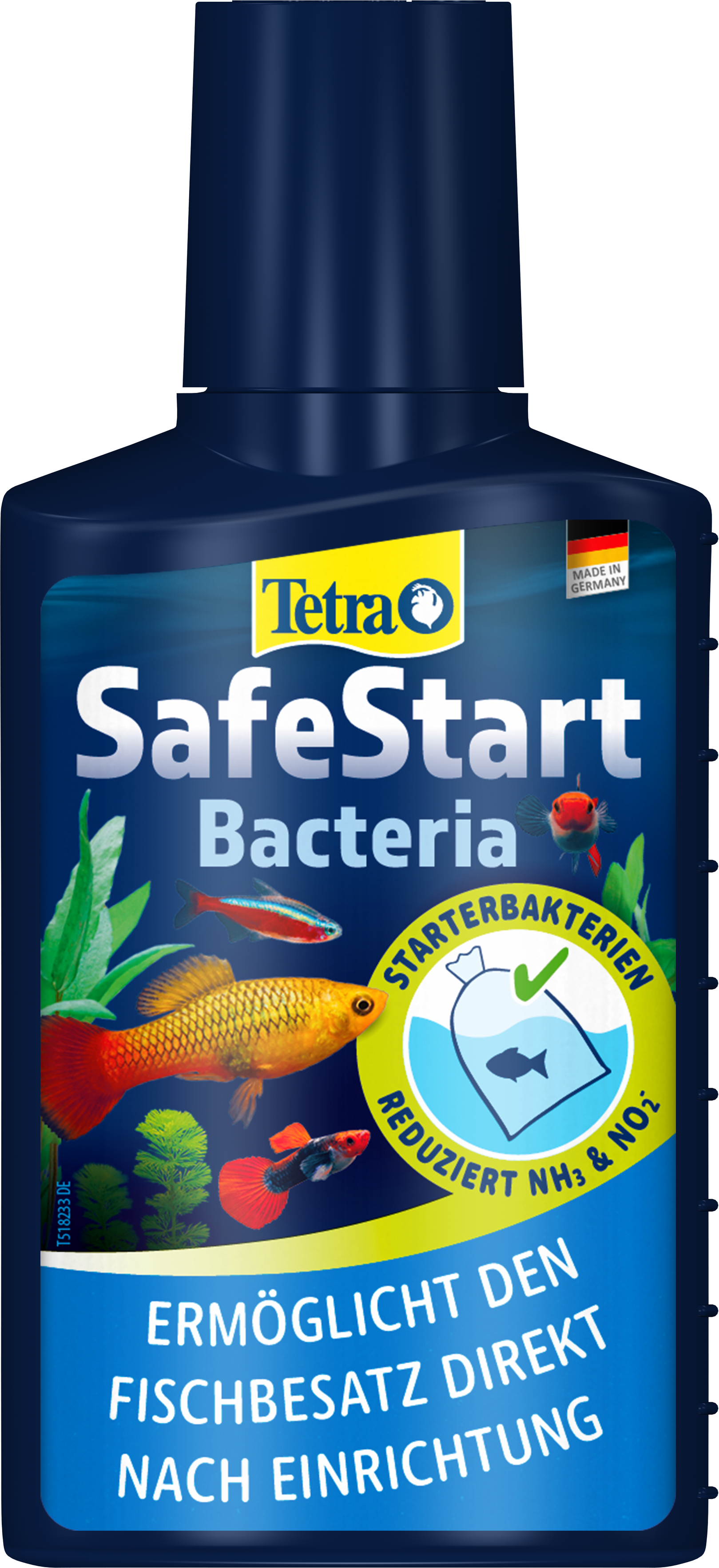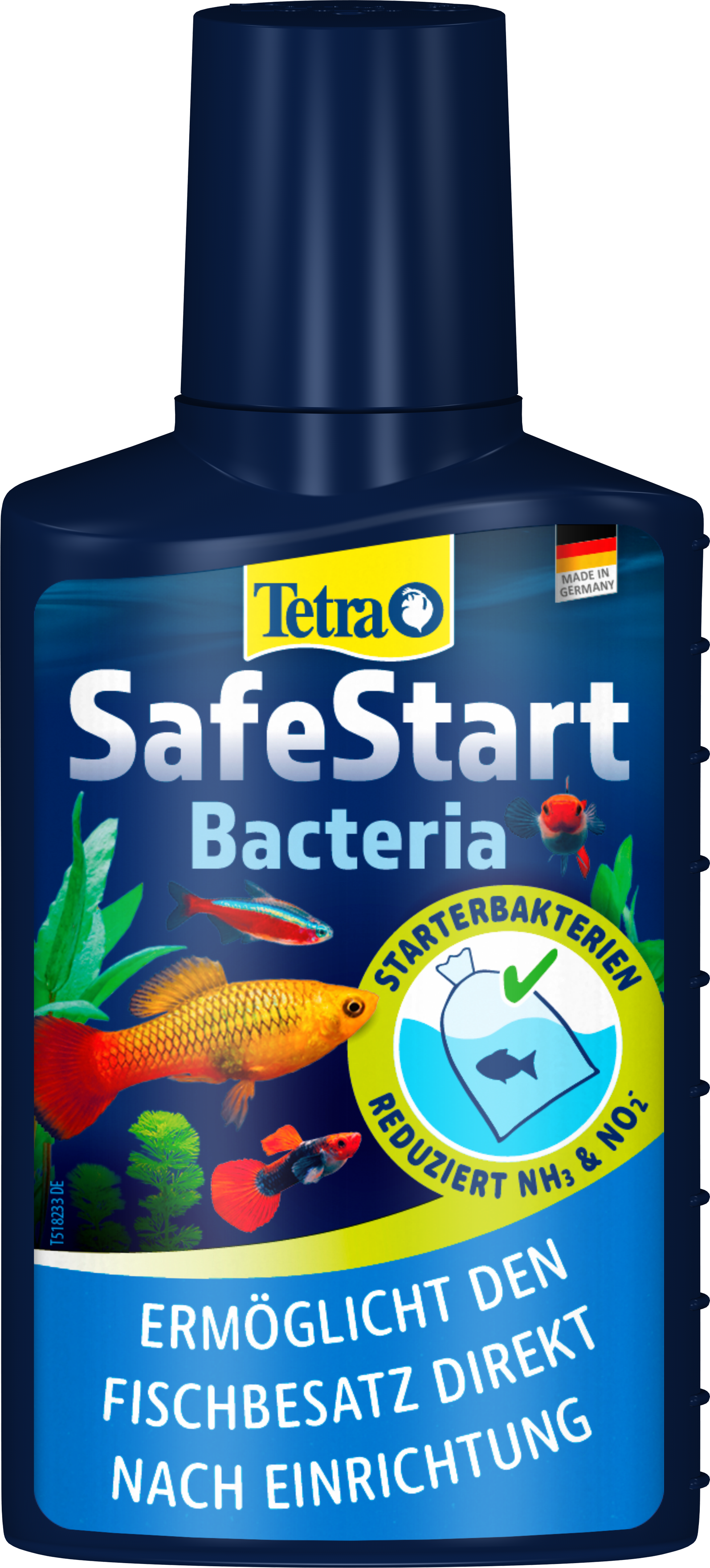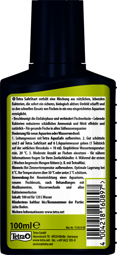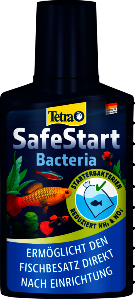 Tetra SafeStart enables you to introduce tropical fish into a new aquarium straight away, without the usual long running-in phase. Its unique mix of living bacteria creates a safe and biologically active environment, acting as a fast and effective “aquarium starter”. By quickly establishing the biological balance, Tetra SafeStart prevents dangerous nitrite peaks, which often occur in freshly set-up tanks and which can lead to fish losses if toxic nitrite cannot be broken down in time. The live bacteria in Tetra SafeStart naturally reduce harmful ammonia and nitrite levels, ensuring that fish are protected from stress and disease right from the beginning. Tetra SafeStart is not only recommended for setting up a brand-new aquarium, but also for situations where the bacterial balance may be disturbed, such as after using medications, following water changes, or whenever bacterial cultures in the filter have been lost. In all these cases, Tetra SafeStart helps to restore a safe biological environment quickly and reliably. Application is simple: Shake the bottle well before use and add 5 ml of Tetra SafeStart per 6 L of aquarium water. The recommended minimum water temperature for the application is 20 °C. A moderate number of fish can then be introduced, and feeding should be limited during the first two weeks, for example with TetraMin. Always apply Tetra AquaSafe to neutralise harmful substances like chlorine, copper and others often contained in tap water. For best results, Tetra SafeStart should be stored at room temperature, ideally at around 8 °C. Avoid exposing the product to temperatures above 30 °C or below 2 °C to preserve the effectiveness of the living bacteria.