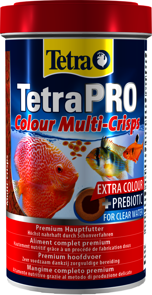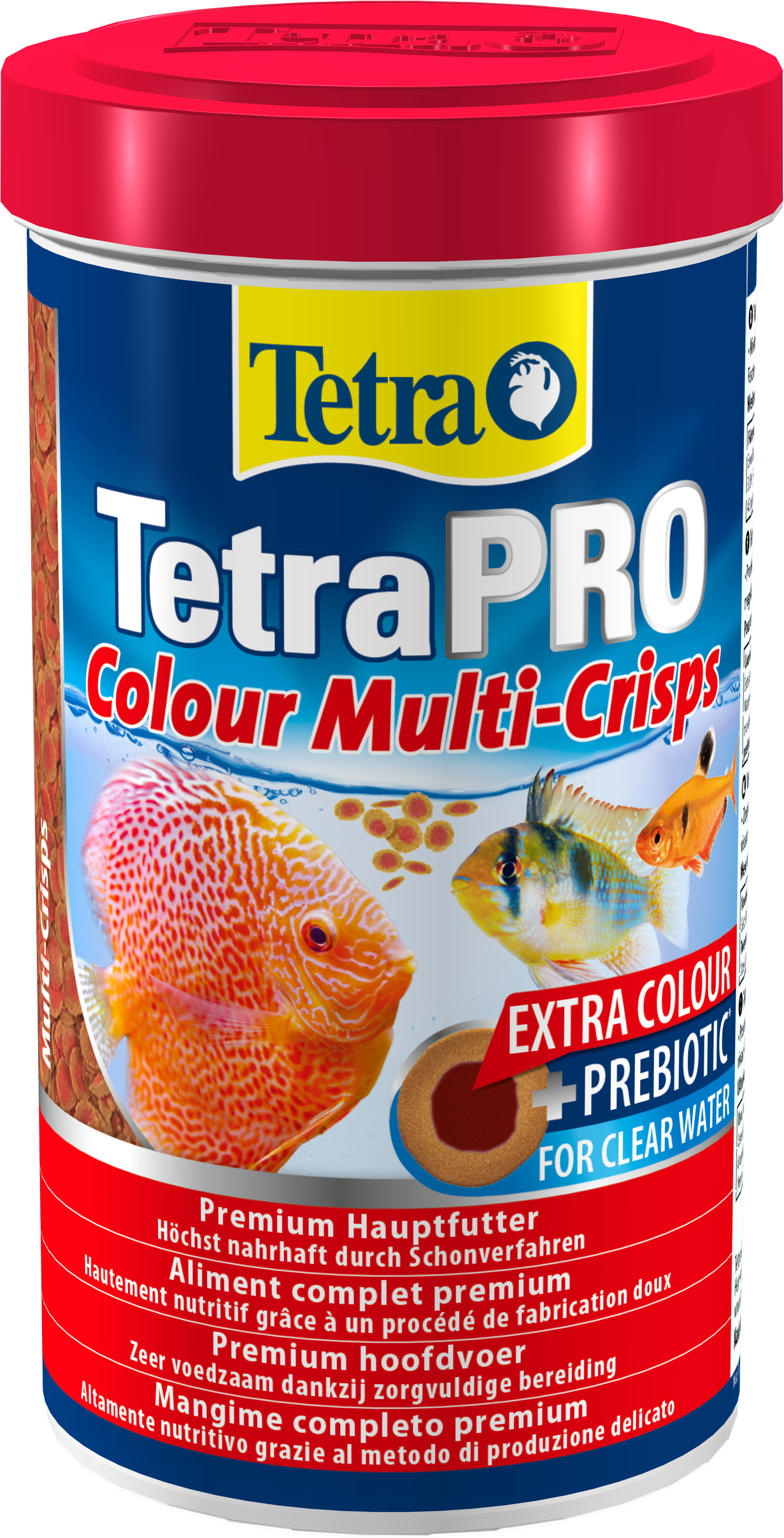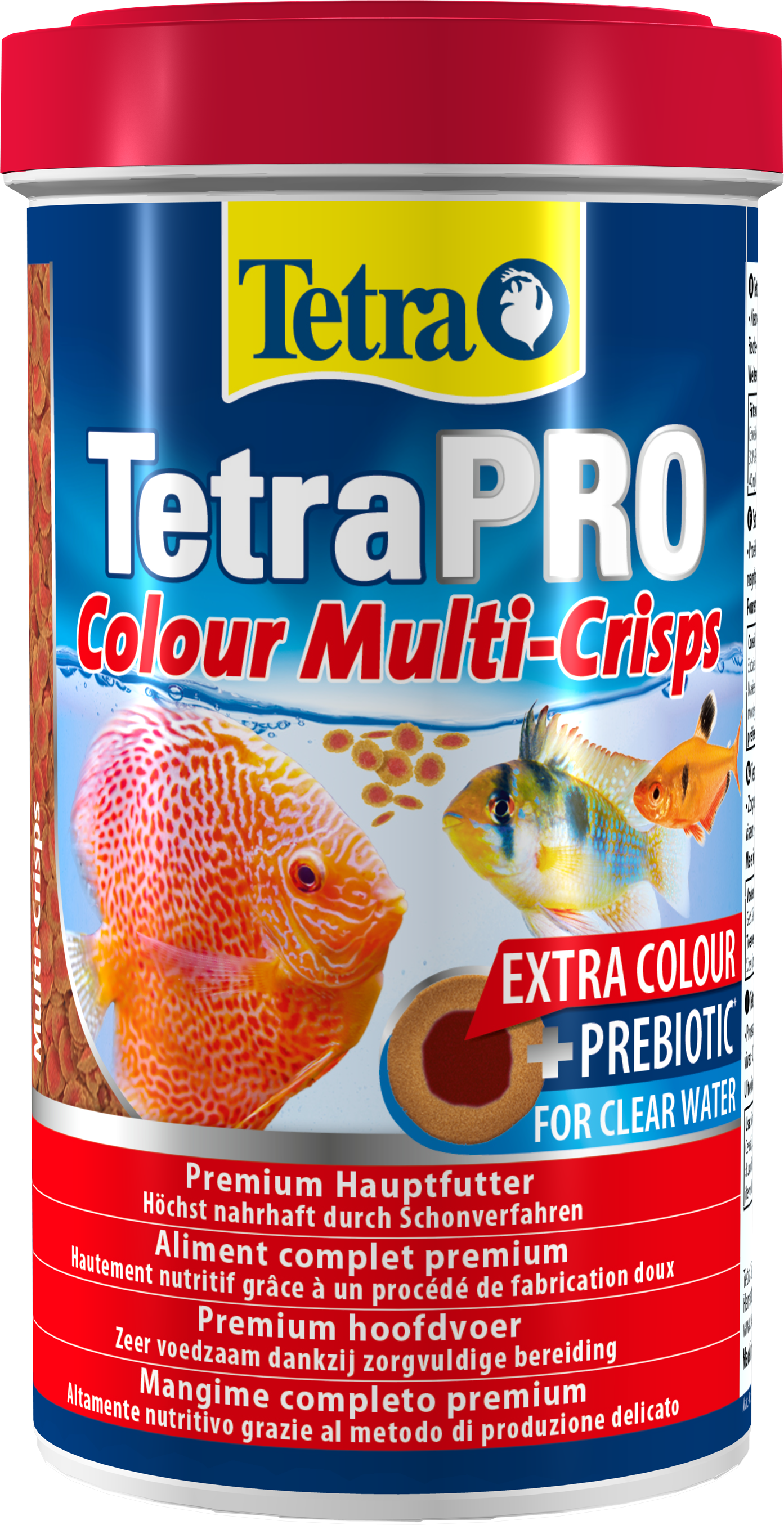 TetraPRO has set a new standard in fish nutrition. The premium complete food is manufactured using a gentle, low-heat process. This special manufacturing method gives TetraPRO Colour Multi-Crisps a very high nutritional value. The multi-crisps also absorb less water than normal flake food. This increases the nutrient content per volume. All TetraPRO foods offer also an optimised protein-fat ratio. This ensures that the fish can use the protein specifically to build muscle by providing plenty of essential fatty acids for energy generation. The additional colour concentrate in the multi-crisps, made from carotenoids, improves natural colouration. The innovative 2-colour technology visually represents these additional benefits. The multi-crisps also crumble much less than normal flakes, significantly reducing the amount of food dust in the containers. The high-quality prebiotics specifically stimulate growth and the metabolism of health-promoting bacteria in the intestinal tract by acting as a preferred source of food for useful bacteria. This minimises water pollution.