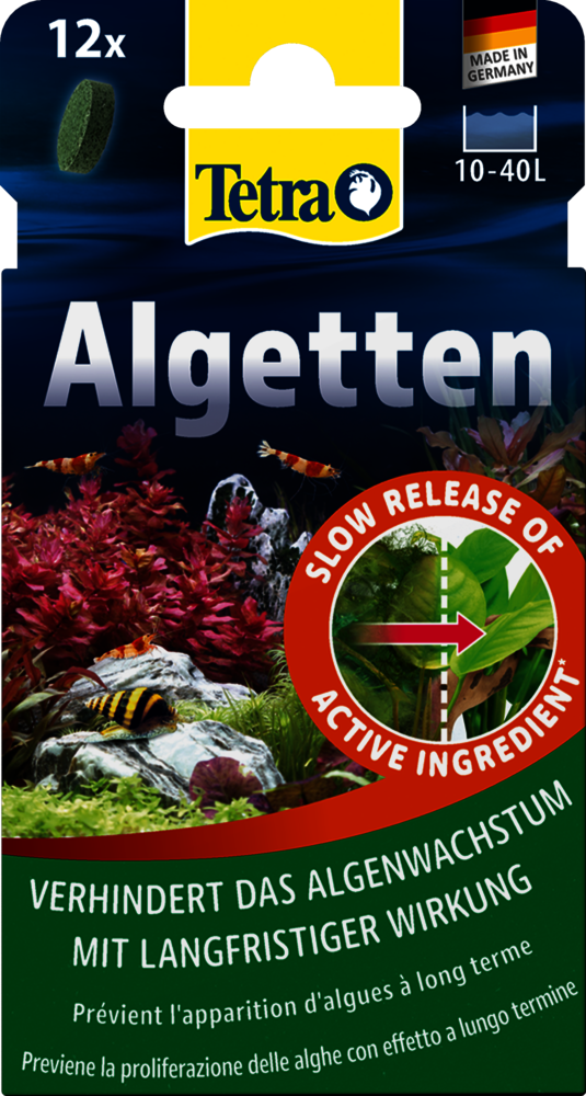 Tetra Algetten* provide optimum algae control for freshwater aquariums up to 40 L, preventing unsightly algae growth that can inhibit plant growth and unbalance the ecosystem in your aquarium. The active ingredient in each tablet is released slowly over four weeks, ensuring continuous protection without discolouring the water. Gentle on fish, plants and microorganisms when used as directed, Tetra Algetten* work by disrupting the algae’s metabolism while leaving your aquatic life unharmed. Simply add one tablet per 10 L of aquarium water, position it in a place where there is plenty of water movement and repeat after four weeks if necessary. During treatment, maintain aeration (for example with a Tetra APS air pump), switch off UV clarifiers, avoid activated carbon filtration and refrain from water changes. Remove any dead algae mechanically to preserve water quality. For long‑term prevention, follow up with nutrient control - such as reducing phosphate and nitrate values with Tetra EasyBalance.
