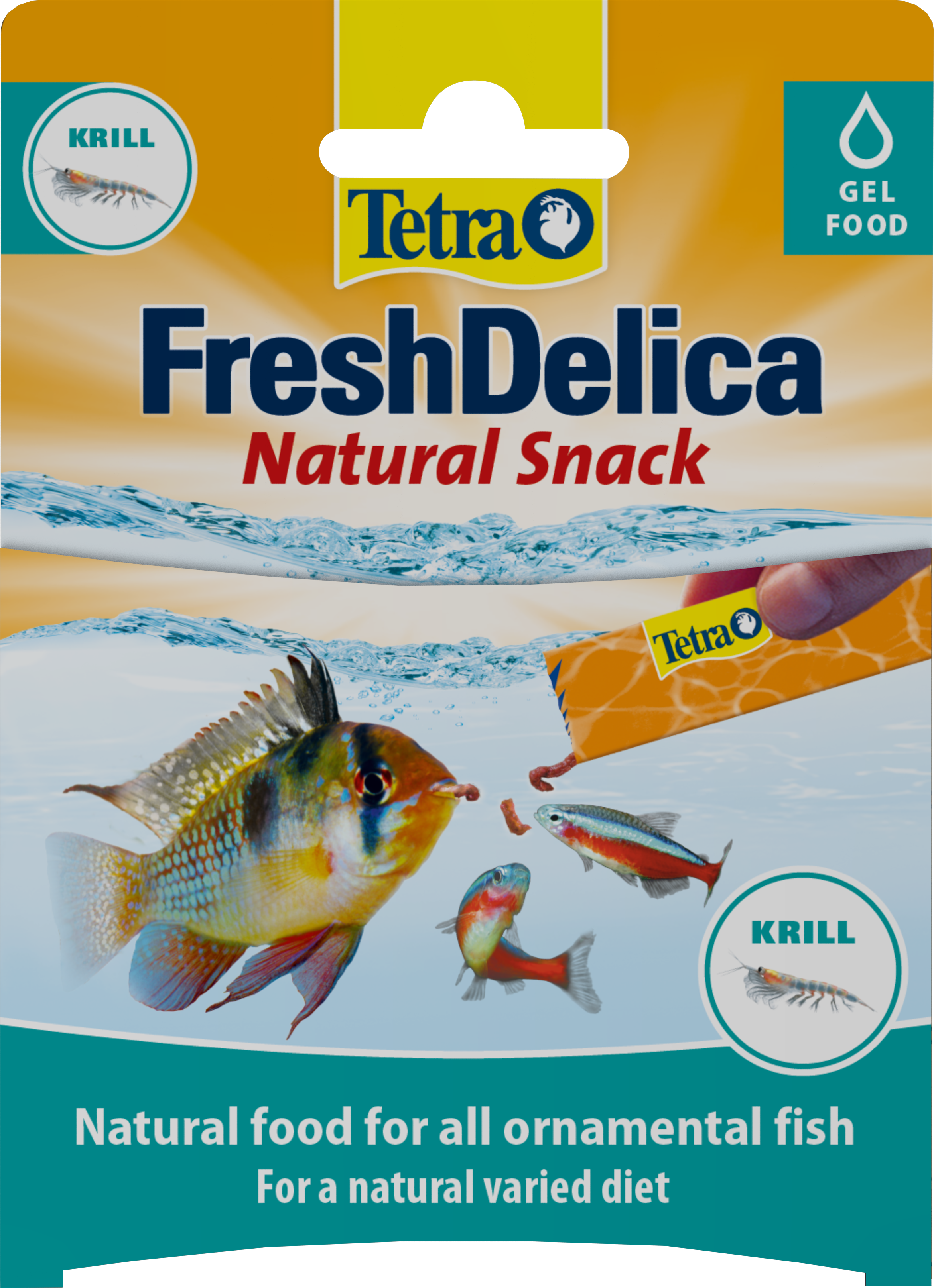 Tetra FreshDelica gel food is the perfect snack for in between meals as it ensures a lot of interaction and feeding fun with the fishes. As well as being a healthy natural food for all ornamental fish, this nutrient-rich gel also encourages a whole new type of interaction with the fish: The gel can be easily and accurately dispensed thanks to the handy tubes and sachets and the worm-like appearance in the water immitates natural circumstances. The natural varieties consisting of four different types of aquatics animals (bloodworms, brine shrimps, daphnia and krill) are readily accepted and eagerly eaten by the fish. Tetra FreshDelica comes in two portion sizes: the 3g sachet is ideal for aquarists who want to give their fish a little treat every now and again, whereas the large 80g tube allows aquarists to spend a lot of time dealing intensively with the fish without using up the gel food too fast. The sterile, germ-free packaging also ensures that the food remains fresh for a long time. Tetra FreshDelica can be kept for three years without refrigeration and makes an ideal dietary supplement to the TetraMin staple food.