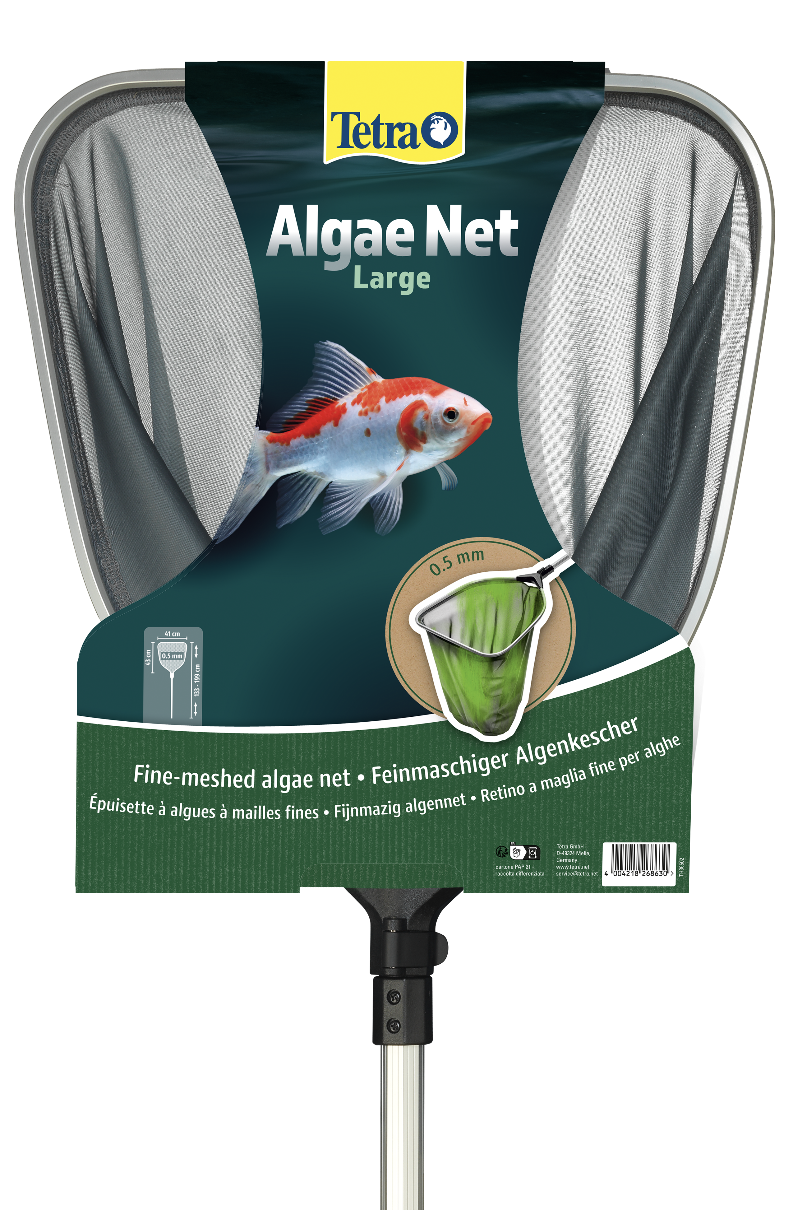The Tetra Pond Algae Net with telescopic handle is ideal for removing algae, leaves, insects, plants and plant matter from ponds. To match any pond it is available in two sizes. With an extremely fine mesh of just 0.5 millimetres, it can easily catch even the smallest particles in the water to reliably remove all contaminants from the pond. After all, autumn and winter are the times of year when it is particularly important to remove as many contaminants as possible from ponds in order to prevent poor water parameters and algae. Thanks to its telescopic yet extremely sturdy aluminium handle, the net is also ideal for getting to the less accessible pond areas. Even with deeper ponds, the adjustable handle length (small net with 123-189 cm; large net with 133-199 cm) enables you to effortlessly reach all areas that you want to clean, while the practical rubber handle prevents the net from slipping out of your hands. The Tetra Pond Algae Net features a trapezoid shaped net head enabling you to catch even larger amounts of dirt. Additionally, a robust aluminium frame protects the mesh itself from damages. With its light weight, the Tetra Pond Algae Net is an indispensable tool for maintaining and cleaning your garden pond.