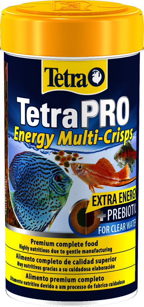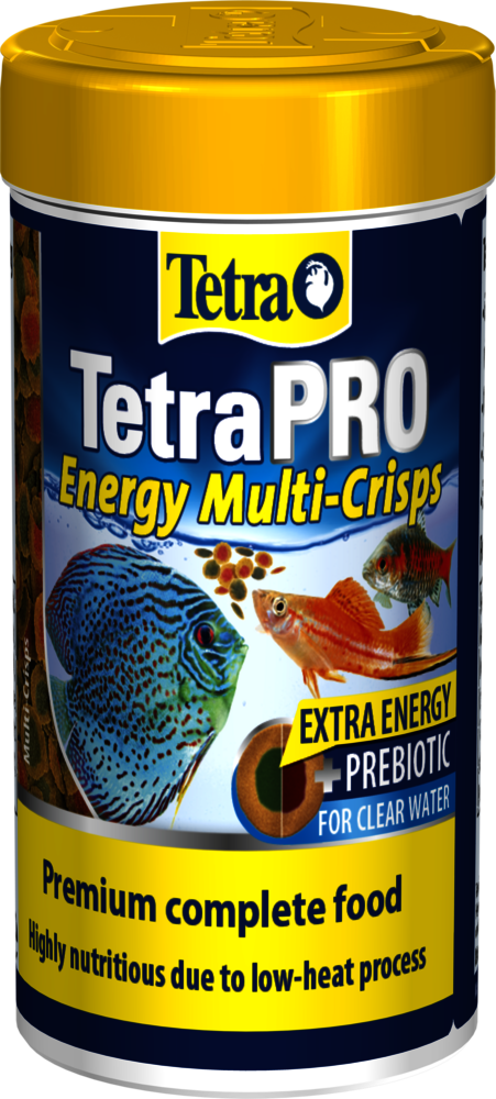 TetraPRO has set a new standard in fish nutrition. The premium complete food is manufactured using a gentle, low-heat process. This special manufacturing method gives TetraPRO Energy Multi-Crisps a very high nutritional value. The multi-crisps also absorb less water than normal flake food. This increases the nutrient content per volume. All TetraPRO foods offer an optimised protein-fat ratio. This ensures that the fish can use the protein specifically to build muscle by providing plenty of essential fatty acids for energy generation. The additional energy concentrate in the multi-crisps contains high-quality oils to improve fish vitality. The innovative 2-colour technology visually represents these additional benefits. The multi-crisps also crumble much less than normal flakes, significantly reducing the amount of food dust in the containers. The high-quality prebiotics specifically stimulate growth and the metabolism of health-promoting bacteria in the intestinal tract by acting as a preferred source of food for useful bacteria. This minimises water pollution.