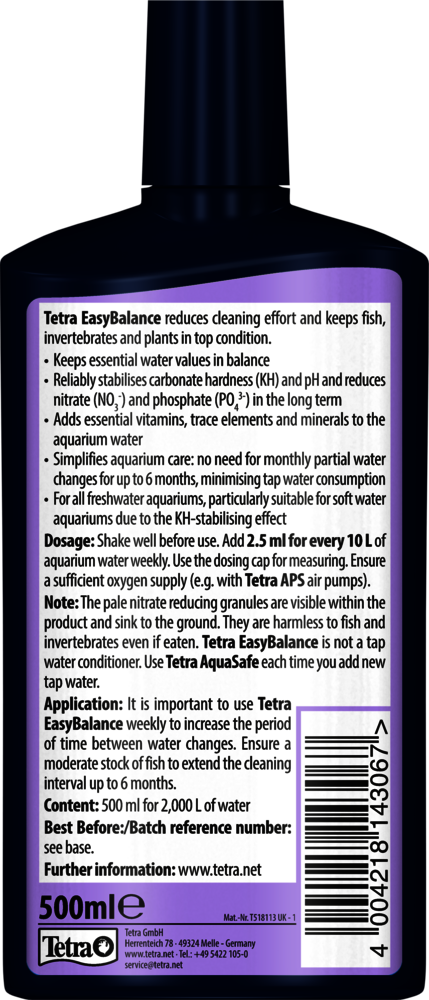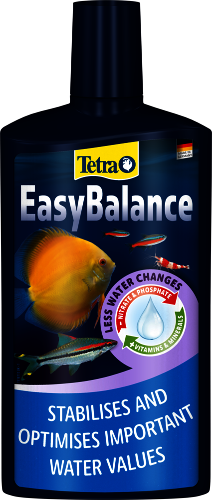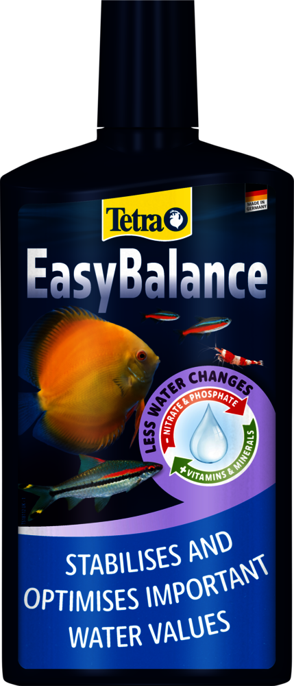 Tetra EasyBalance is a unique water care solution that keeps your aquarium healthy and in balance with minimal effort. No matter if you are a beginner or an advanced aquarist: By reliably stabilising important water values such as carbonate hardness (KH) and pH, Tetra EasyBalance makes caring for your aquarium much easier. Aquariums with soft water, such as those housing sensitive species like discus fish, particularly benefit from the KH-stabilising effect, as it ensures stable and safe conditions over time. Reducing substances like nitrate and phosphate not only prevents algae growth but also protects fish and plants from stress, ensuring they can thrive in a stable, natural environment. Weekly use of Tetra EasyBalance reduces the number of partial water changes needed. This way, Tetra EasyBalance makes your hobby less time-consuming and helps to save tap water, contributing to more environmentally friendly fishkeeping. Additionally, the product enriches the aquarium water with essential vitamins, trace elements and minerals that fish, invertebrates and plants need for a healthy life. For best results, Tetra EasyBalance should be shaken well before use and added once a week at a dosage of 2.5 ml per 10 L of aquarium water. A sufficient oxygen supply should be ensured, for example by using the Tetra APS air pumps. Within the liquid, pale granules may be visible; they sink to the bottom of the aquarium and are completely harmless to fish and invertebrates, even if ingested. It is important to note that Tetra EasyBalance is not a tap water conditioner and therefore should always be used alongside Tetra AquaSafe whenever new tap water is added. Check the water values in your aquarium regularly with the Tetra Test 7in1.