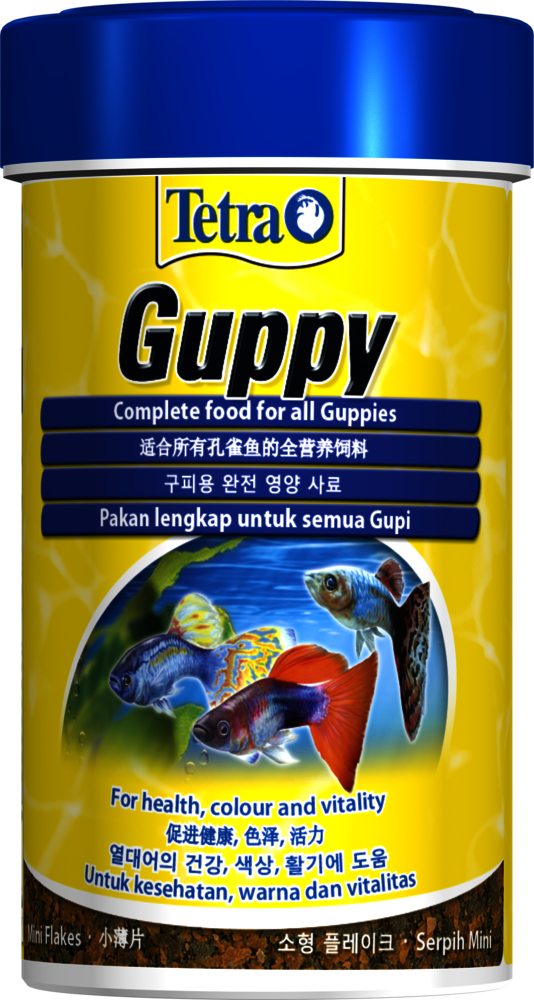 Tetra Guppy Mini Flakes have been specially developed for the nutritional needs of guppies and other live-bearing toothcarps such as platies, mollies and swordtails. The balanced complete food is ideal for daily feeding of these fish types. The mini flakes float on the surface for a short time before slowly sinking, making them ideal for fish that feed in the top region of the water. The flake size is designed to suit the small mouths of the fish, making it easier for them to feed. The special combination of nutrients ensures that your fish are getting everything they need. The food is rich in plant ingredients and contains added minerals. This means it is more readily accepted by fish and promotes growth. Meanwhile, the colour enhancers increase colouration. The BioActive formula promotes a healthy immune system. Tetra Guppy Mini Flakes increase vitality and help keep the water clear.