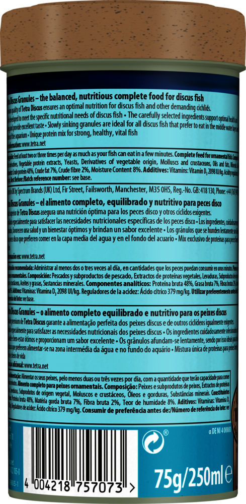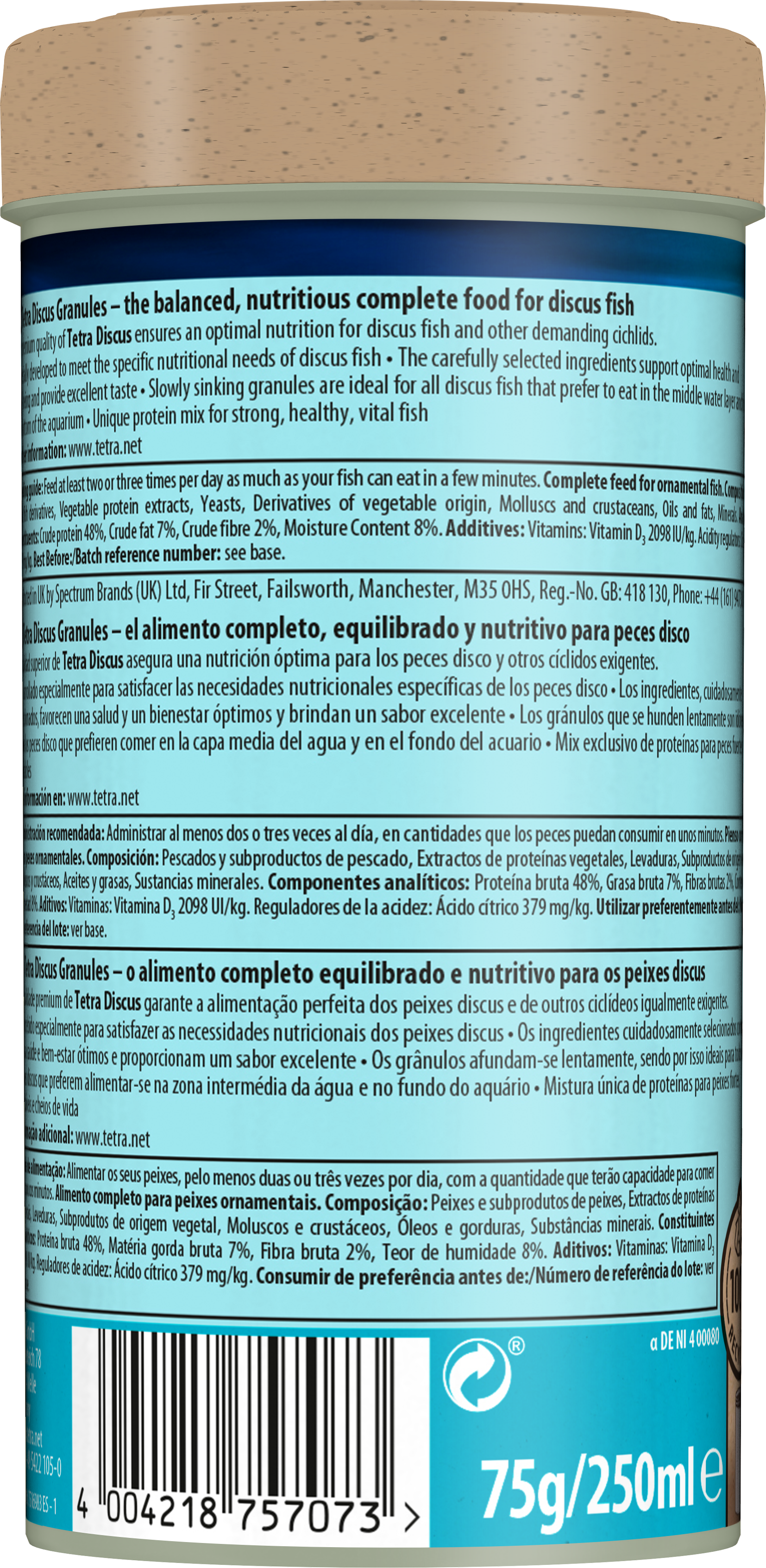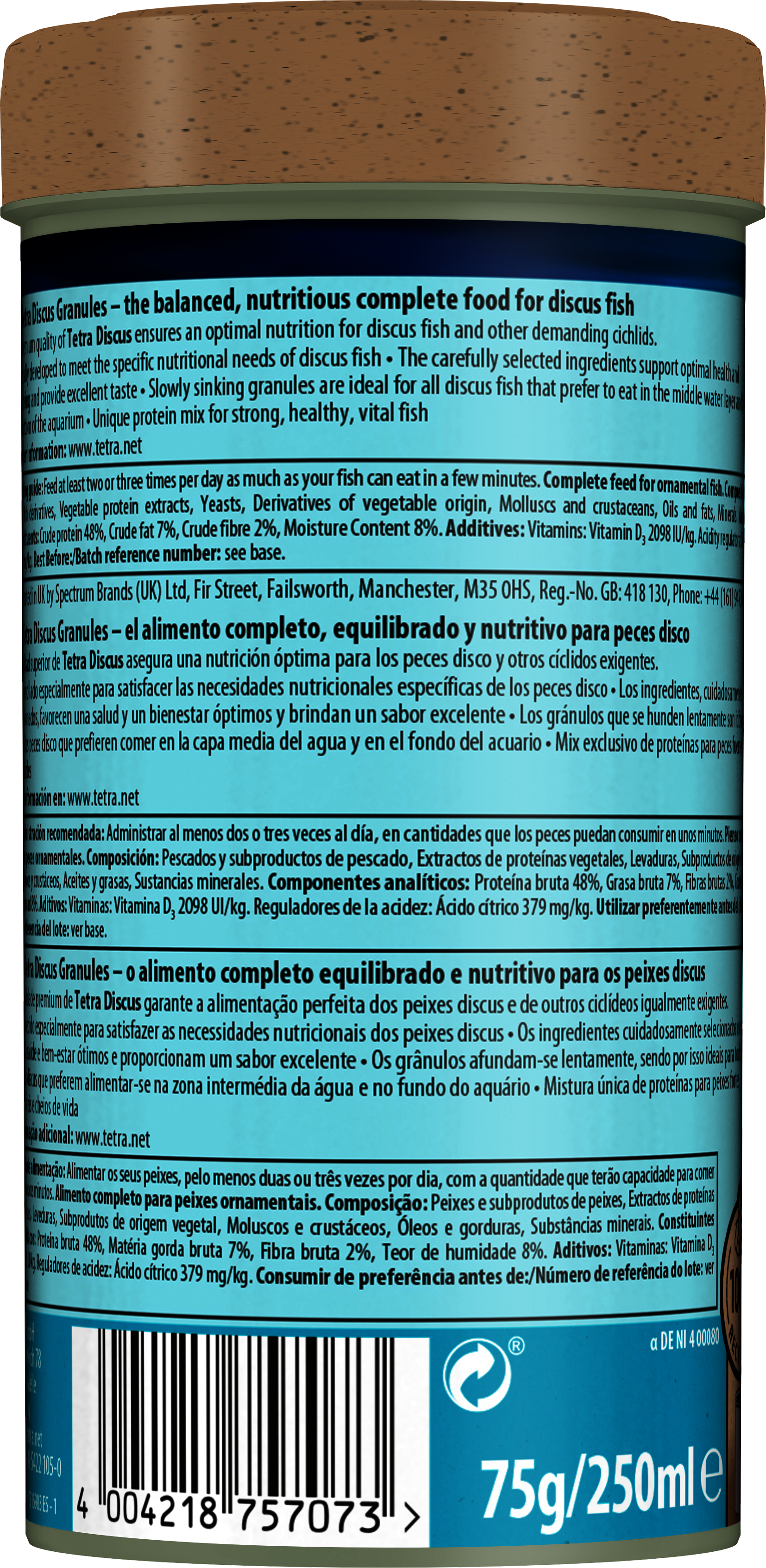 Los Gránulos Tetra Discus son un alimento completo, equilibrado y nutritivo, especialmente elaborado para satisfacer las necesidades nutricionales específicas de los peces disco. Sus ingredientes cuidadosamente seleccionados favorecen una salud y un bienestar inigualables, además de aportar un excelente sabor. Gracias a su lenta velocidad de hundimiento, son la elección perfecta para los peces disco que prefieren alimentarse en la capa media y el fondo del acuario, ajustándose a sus hábitos alimenticios. Con su fórmula única, elaborada con ingredientes naturales de alta calidad, sin colorantes ni conservantes añadidos, junto con una mezcla de proteínas adecuada, promueve un crecimiento óptimo y una mayor resistencia. Los Gránulos Tetra Discus garantizan el desarrollo saludable de tus peces disco y mantienen el agua del acuario limpia y clara.