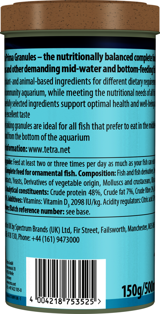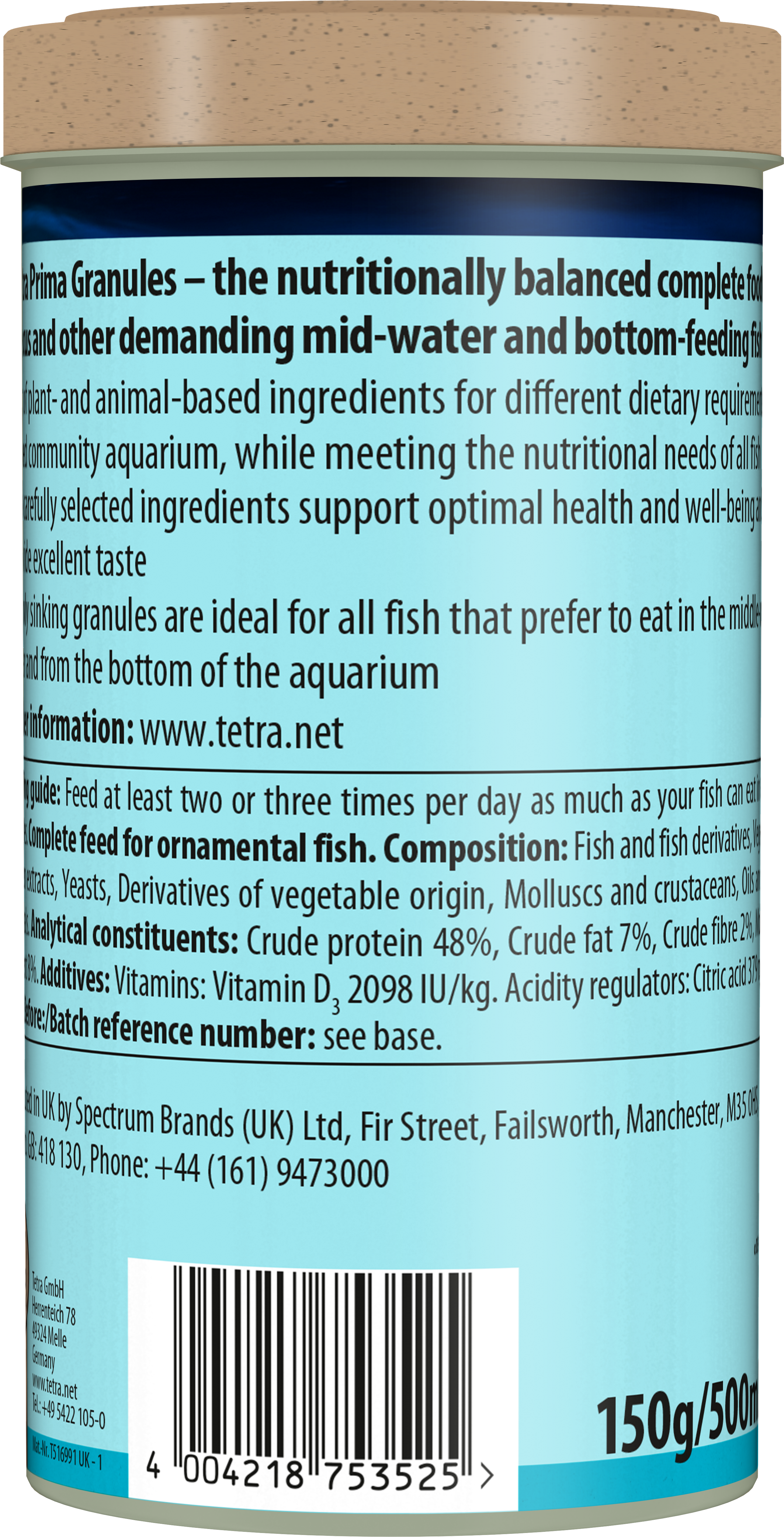 Los Gránulos Tetra Prima son un alimento completo y equilibrado en forma de gránulos, diseñado específicamente para peces disco y otros peces exigentes que se alimentan en la capa media y en el fondo del acuario. Al ablandarse y hundirse rápidamente, son ideales para los peces que prefieren alimentarse en estas áreas. Este alimento combina ingredientes vegetales y animales para satisfacer las diversas necesidades dietéticas en un acuario con diferentes especies, asegurando una nutrición completa para todos los peces. Los ingredientes cuidadosamente seleccionados favorecen una salud y un bienestar inigualables, además de aportar un excelente sabor. Con su fórmula única, elaborada con ingredientes naturales de alta calidad, sin colorantes ni conservantes añadidos, promueve un crecimiento óptimo y una mayor resistencia. Con los Gránulos Tetra Prima, tus peces ornamentales tendrán un desarrollo saludable y el agua del acuario se mantendrá limpia y clara.