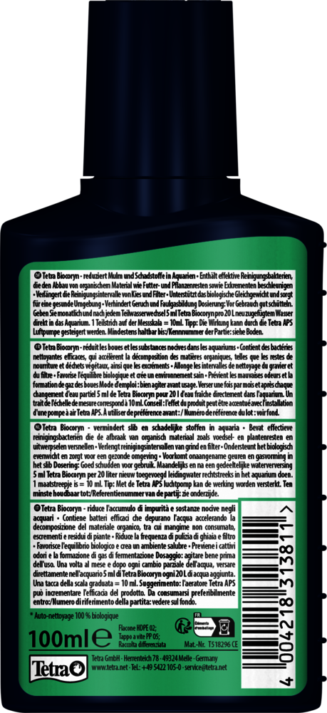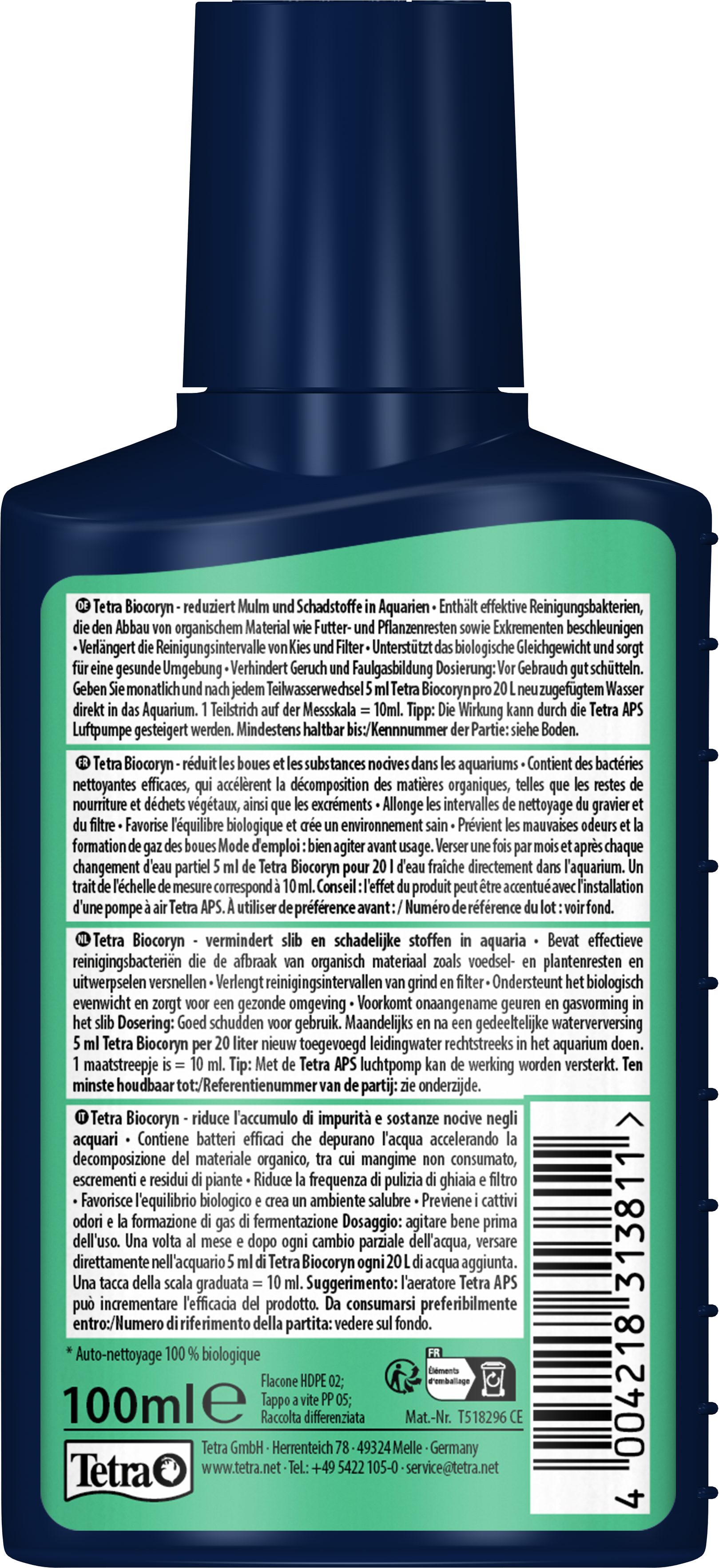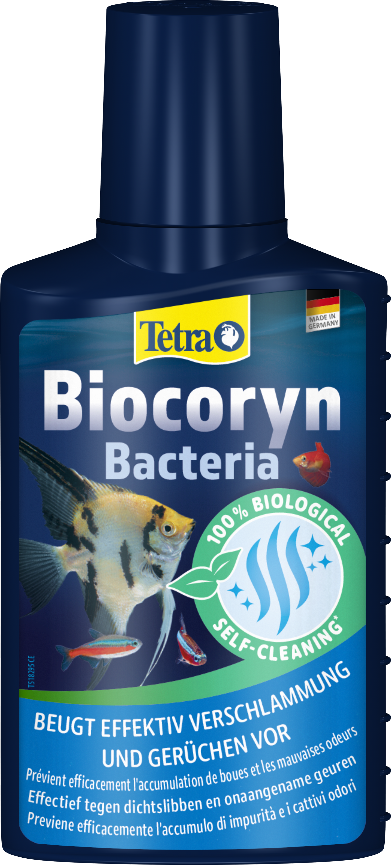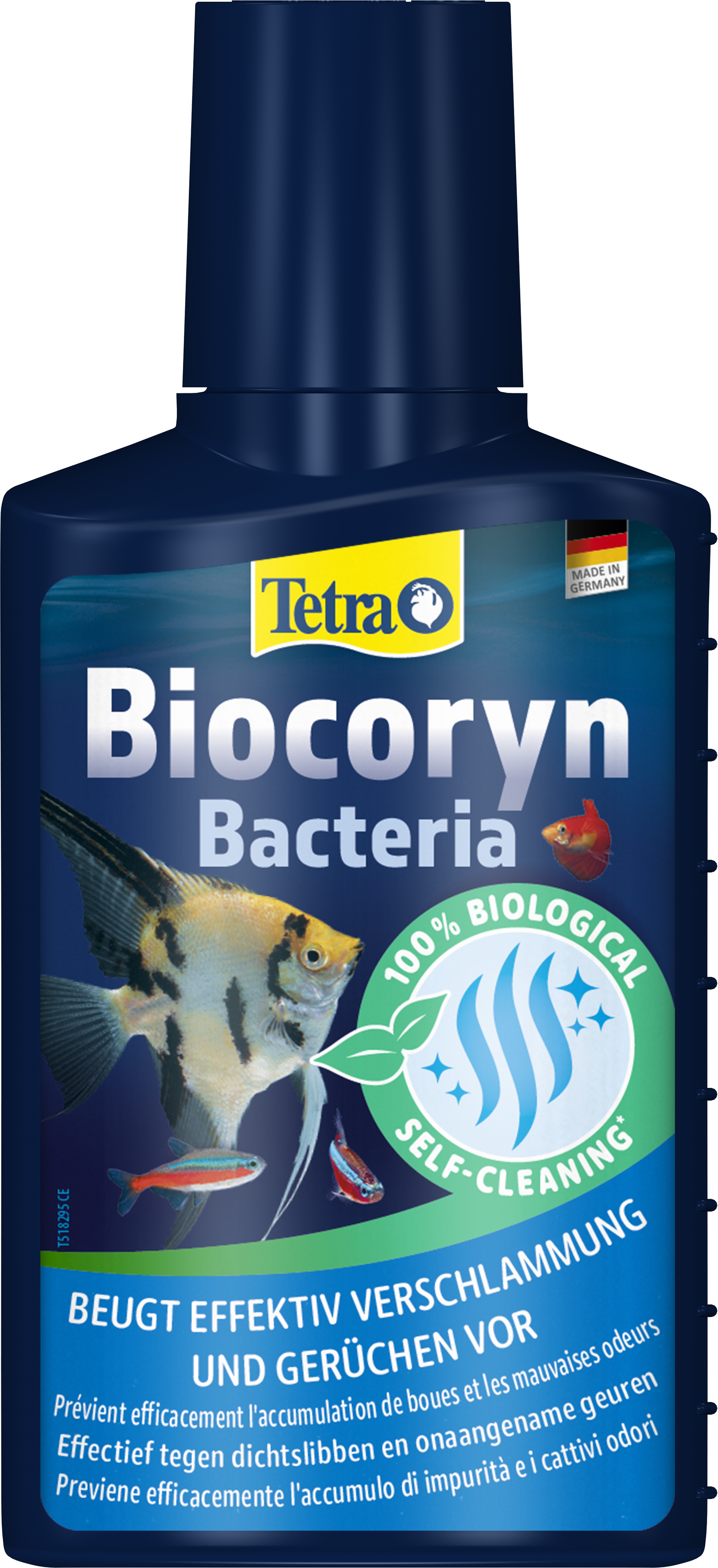 Tetra Biocoryn ofrece una forma natural y eficaz de mantener su acuario más limpio durante más tiempo. Este producto para el cuidado del agua reduce los olores desagradables, la acumulación de lodo y la formación de contaminantes. Su fórmula líquida contiene bacterias limpiadoras vivas muy eficaces que aceleran la descomposición de materia orgánica, como restos de comida, residuos vegetales y residuos de los peces. Al descomponer rápidamente estas sustancias, Tetra Biocoryn ayuda a mantener el agua limpia y favorece un entorno saludable y equilibrado tanto en acuarios de agua dulce como de agua salada. Una de sus principales ventajas es la posibilidad de prolongar los intervalos de limpieza de la grava y los materiales filtrantes. Esto facilita el mantenimiento y mantiene el acuario limpio y bonito. Las bacterias utilizadas en Tetra Biocoryn son esporas no patógenas del género Bacillus, que se encuentran de forma natural en el suelo, en la materia vegetal en descomposición y en las masas de agua. Seleccionadas por su probada capacidad para degradar sustancias orgánicas de forma eficaz, actúan rápidamente y de forma totalmente biológica para restablecer el equilibrio de los sistemas acuáticos. Cada envase de 100 ml contiene más de 10 mil millones de esporas bacterianas activas, lo que garantiza una eficacia potente y duradera. Basta con agitar bien antes de usar y añadir 5 ml por cada 20 l de agua una vez al mes y después de cada cambio parcial de agua. Una sección de la escala de dosificación equivale a 10 ml. Para obtener un efecto óptimo, Tetra recomienda el uso de una bomba de aire Tetra APS.
