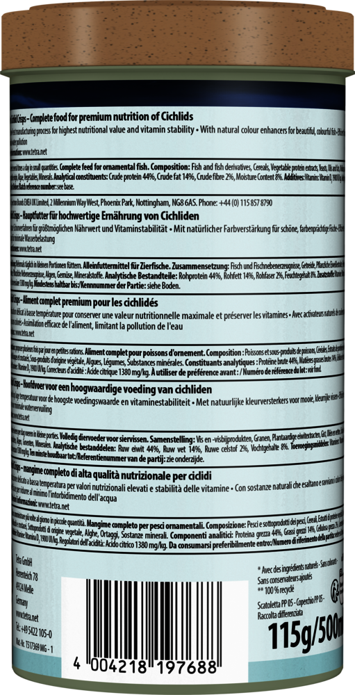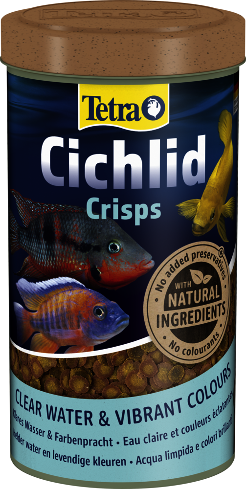 Los crisps Tetra para cíclidos son un alimento completo de primera calidad, rico en nutrientes y cuidadosamente formulado para satisfacer sus necesidades específicas, con el objetivo de potenciar sus colores brillantes y mantener un sistema inmune sano.