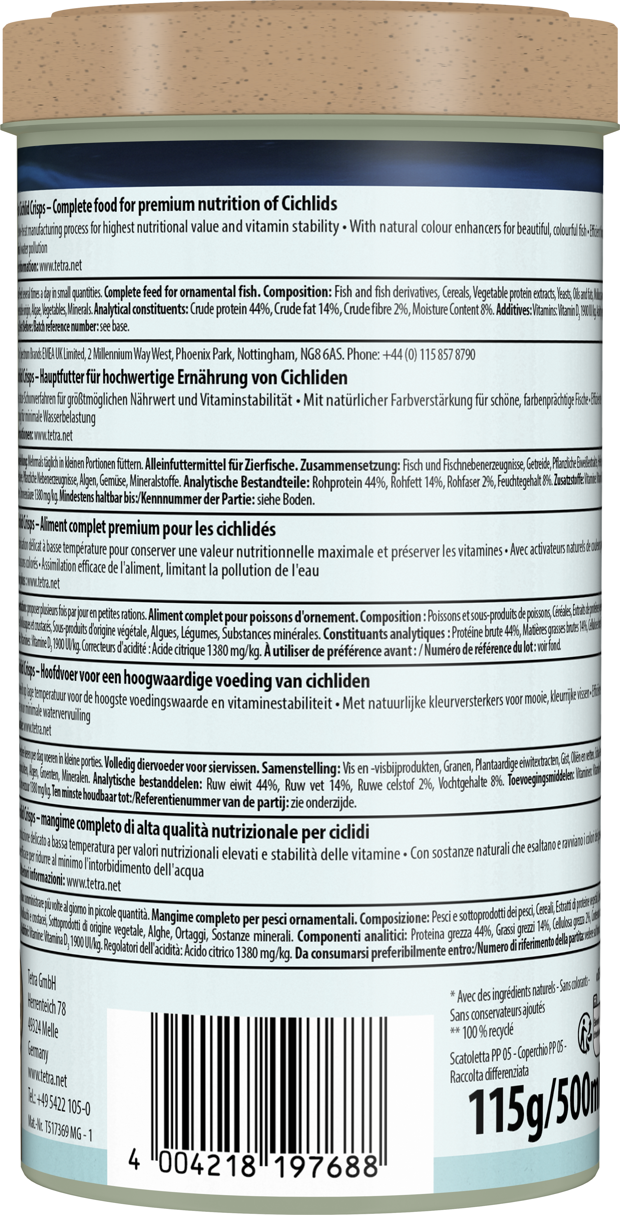 Los crisps Tetra para cíclidos son un alimento completo, formulado especialmente para adaptarse a sus necesidades gracias a un delicado proceso de fabricación a baja temperatura. Este método especial confiere a todos los crisps de Tetra un valor nutricional muy alto y una excelente estabilidad vitamínica. También absorben menos agua que los alimentos en escamas convencionales, lo que aumenta el contenido de nutrientes por volumen. Los crisps Tetra para cíclidos aportan la cantidad justa de proteínas y grasas. Esta ratio asegura que los peces puedan utilizar la proteína específicamente para desarrollar músculo mientras proporciona una gran cantidad de ácidos grasos esenciales para la generación de energía. Incluyen potenciadores del color de origen natural que realzan su belleza y hacen que sus colores luzcan más vivos. Además, al deshacerse menos que las escamas convencionales, apenas generan polvo en el envase. Por otra parte, los prebióticos presentes de forma natural actúan en el tracto intestinal de los peces para estimular específicamente el crecimiento y el metabolismo de bacterias beneficiosas para la salud. Gracias a su palatabilidad y alta digestibilidad, los crisps Tetra para cíclidos mantienen el agua del acuario limpia. Este producto ha sido elaborado con ingredientes de alta calidad y no contiene colorantes ni conservantes añadidos.