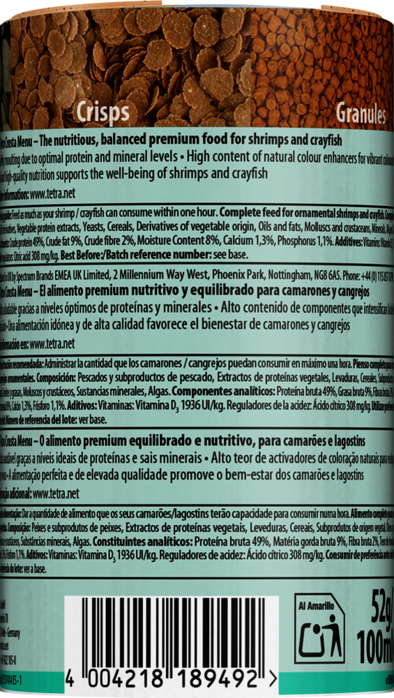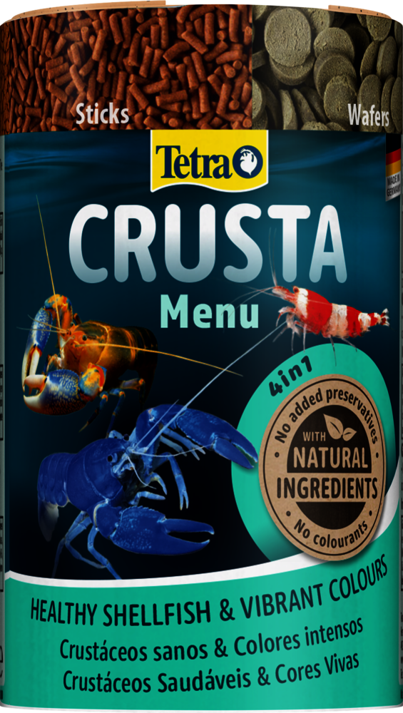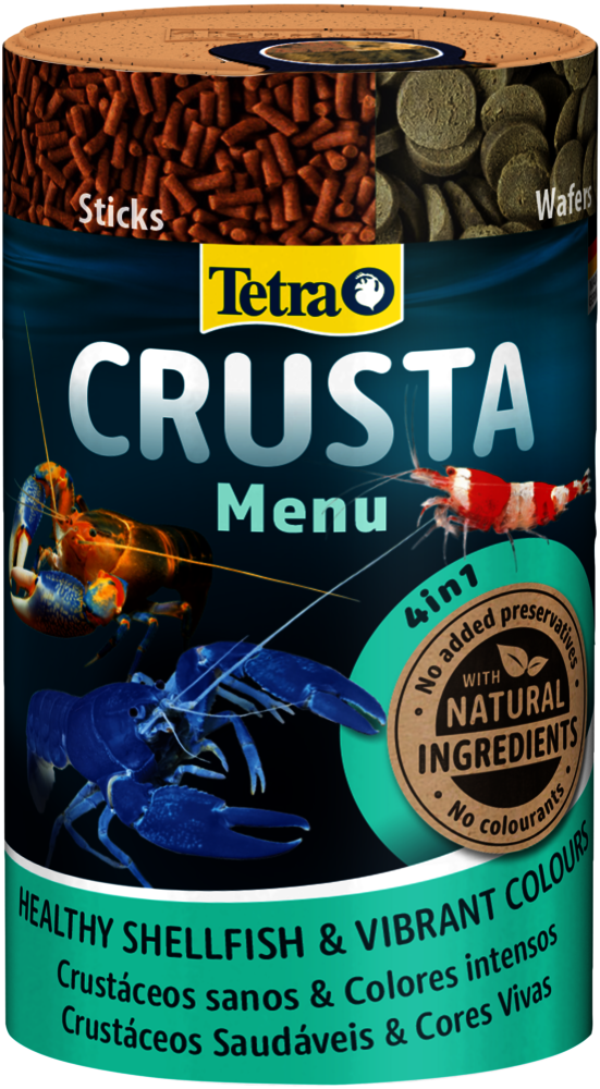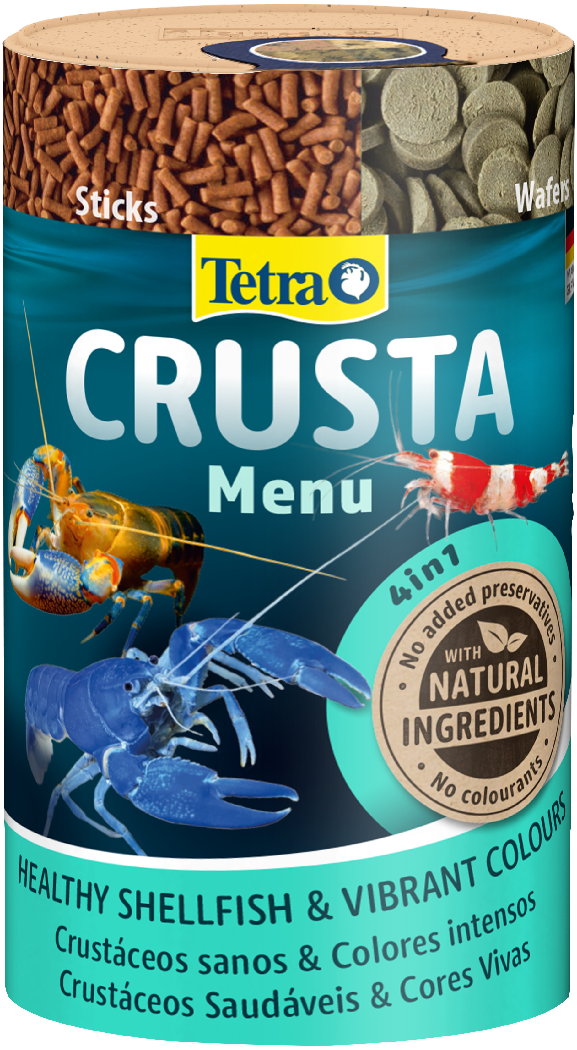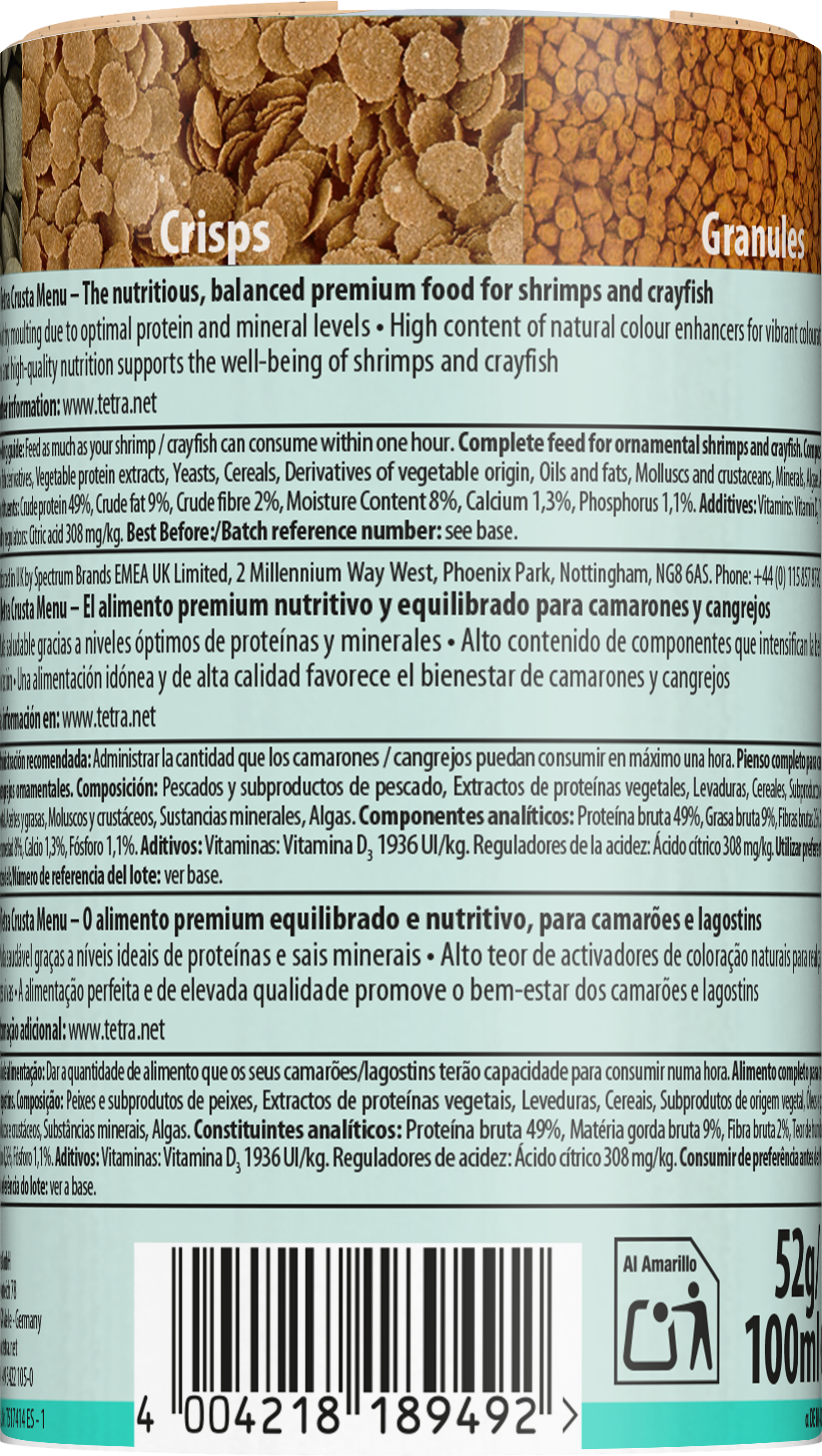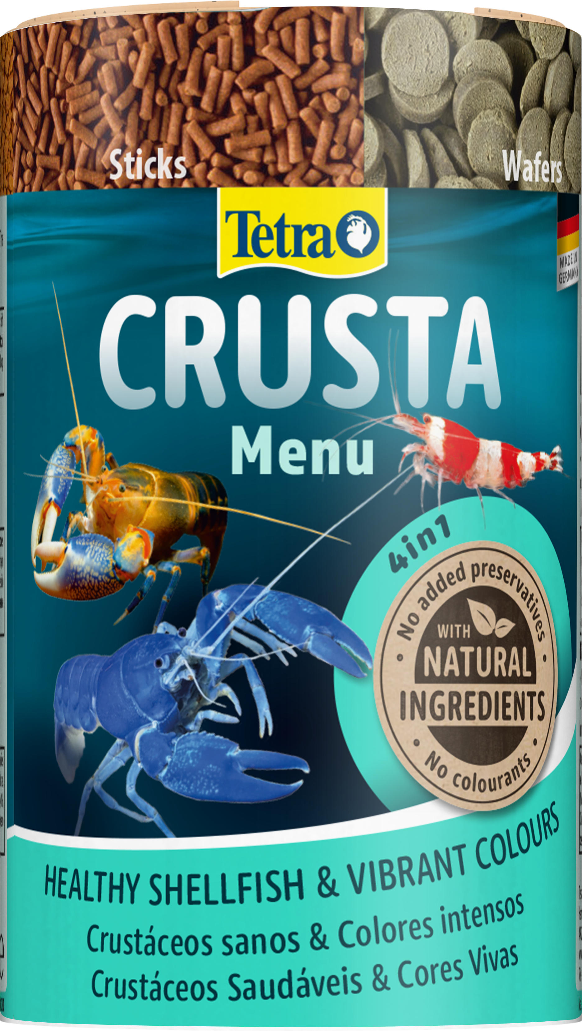 Tetra Crusta Menu es un alimento completo variado y equilibrado para sus gambas y cangrejos de agua dulce. Los cuatro componentes diferentes (barritas, pellets, wafers y crisps) garantizan la diversión en la alimentación y aseguran que cada especie encuentre su manjar favorito. Gracias a los niveles óptimos de proteínas y minerales, Tetra Crusta Menu favorece una muda saludable de todos sus crustáceos. La nutrición de alta calidad Tetra fomenta el bienestar de sus habitantes acuáticos al mejorar el sistema inmunitario y la vitalidad por igual. Gracias a su composición fácil de ingerir y a su alta digestibilidad, los cuatro componentes mantienen el agua del acuario limpia y los valores estables. Tetra Crusta Menu está formulado sin colorantes ni conservantes añadidos.