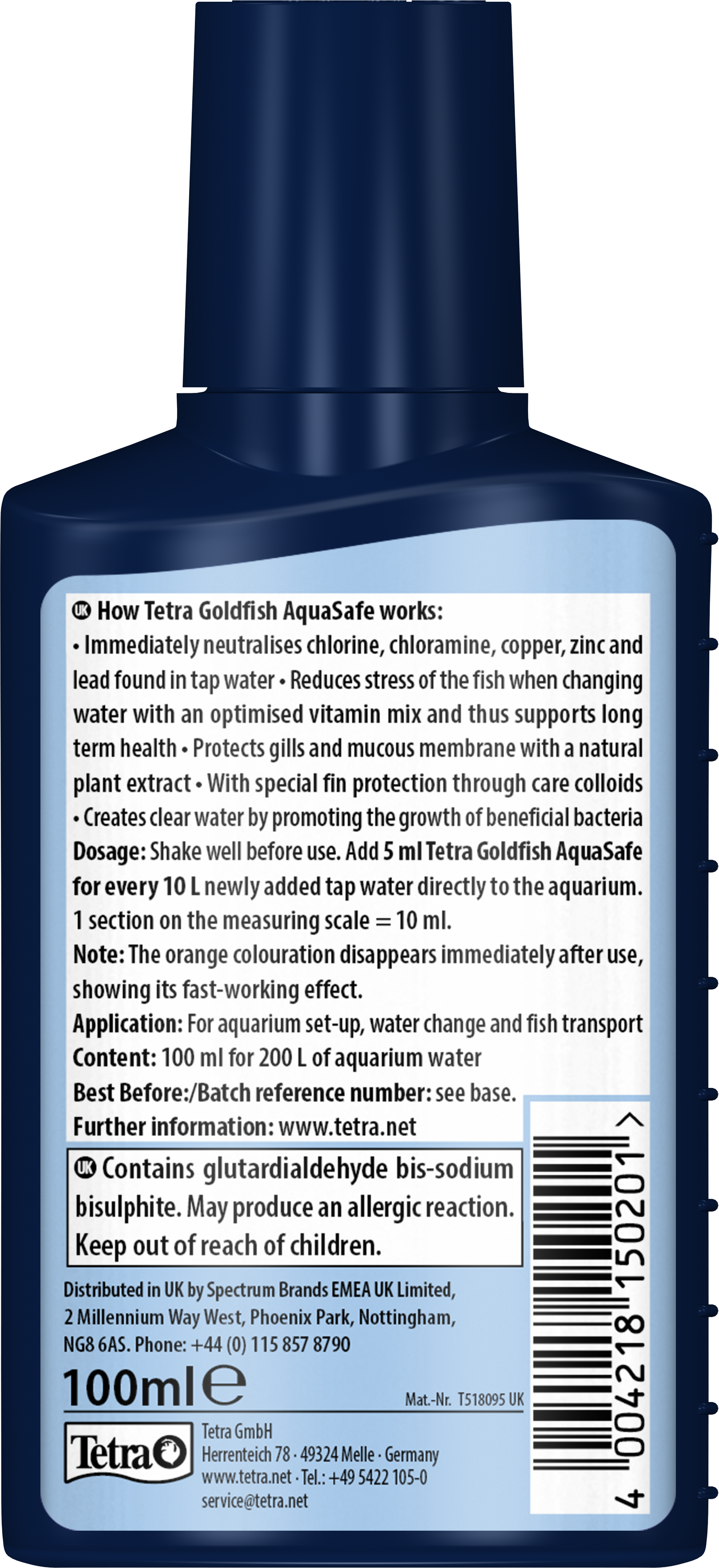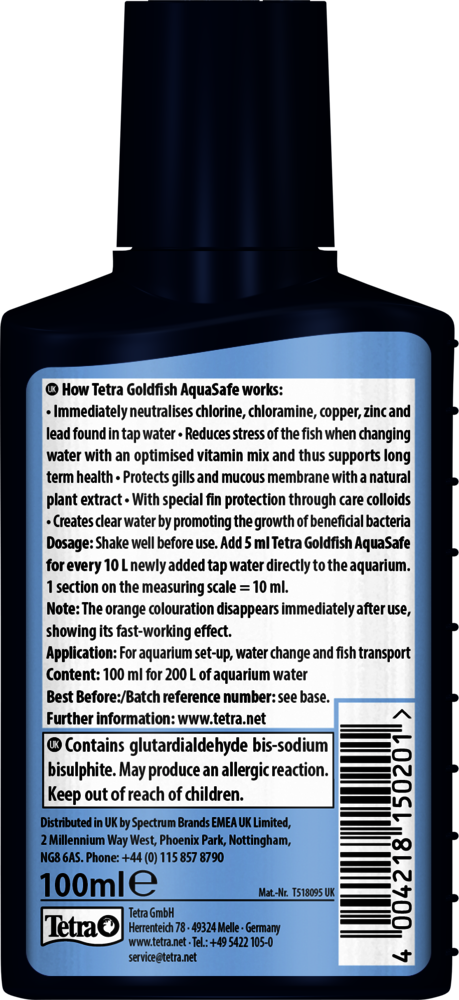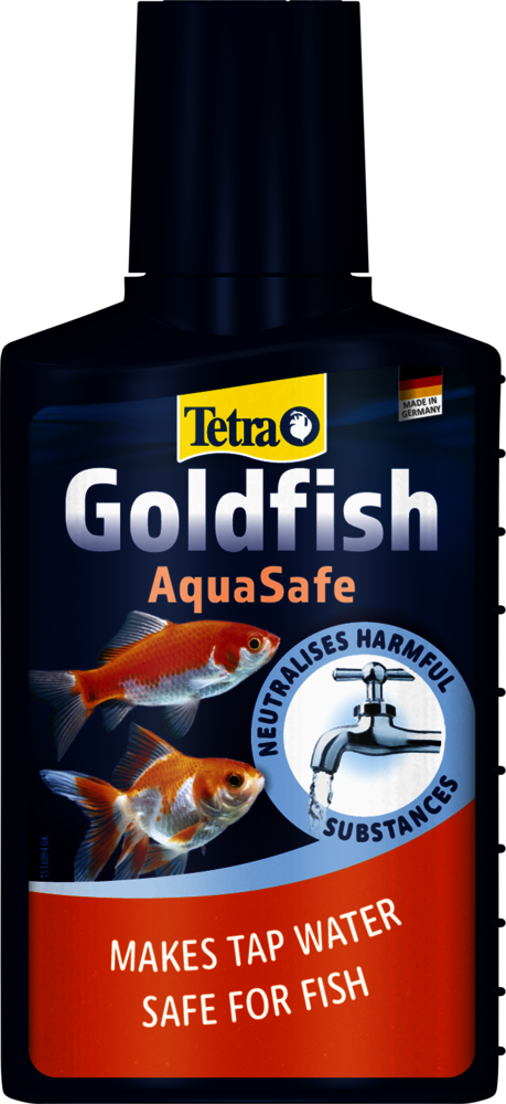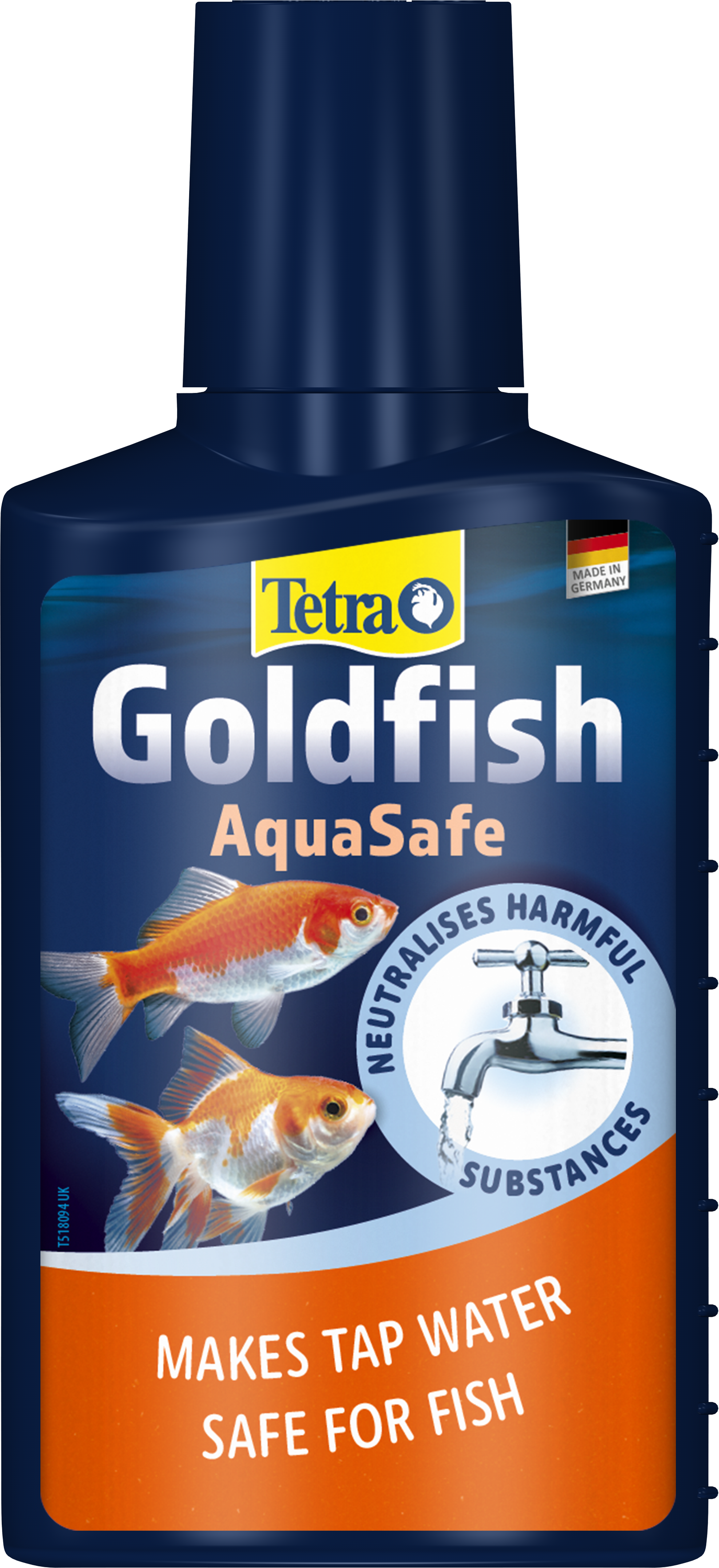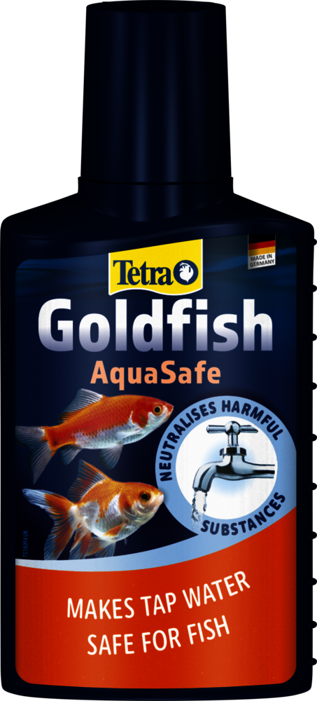Tetra Goldfish AquaSafe ha sido especialmente desarrollado para hacer que el agua del grifo sea segura para los goldfish. Neutraliza al instante el cloro, la cloramina y los metales pesados nocivos como el cobre, el zinc y el plomo, que se encuentran habitualmente en el agua y pueden ser muy perjudiciales para sus carpines dorados. La mezcla optimizada de vitaminas ayuda a reducir el estrés durante los cambios de agua, la instalación o el transporte, favoreciendo la salud y la vitalidad a largo plazo. Un extracto natural adicional de plantas protege las delicadas branquias y las membranas mucosas, mientras que los coloides de cuidado especial proporcionan una protección específica para las aletas, manteniéndolas fuertes e intactas. Al mismo tiempo, Tetra Goldfish AquaSafe favorece el crecimiento de bacterias beneficiosas, asegurando un agua clara y limpia que favorece el bienestar general.Agitar bien antes de usar. Añada 5 ml de Tetra Goldfish AquaSafe por cada 10 l de agua del grifo recién añadida directamente en el acuario. La coloración naranja del líquido desaparece inmediatamente después de la aplicación.