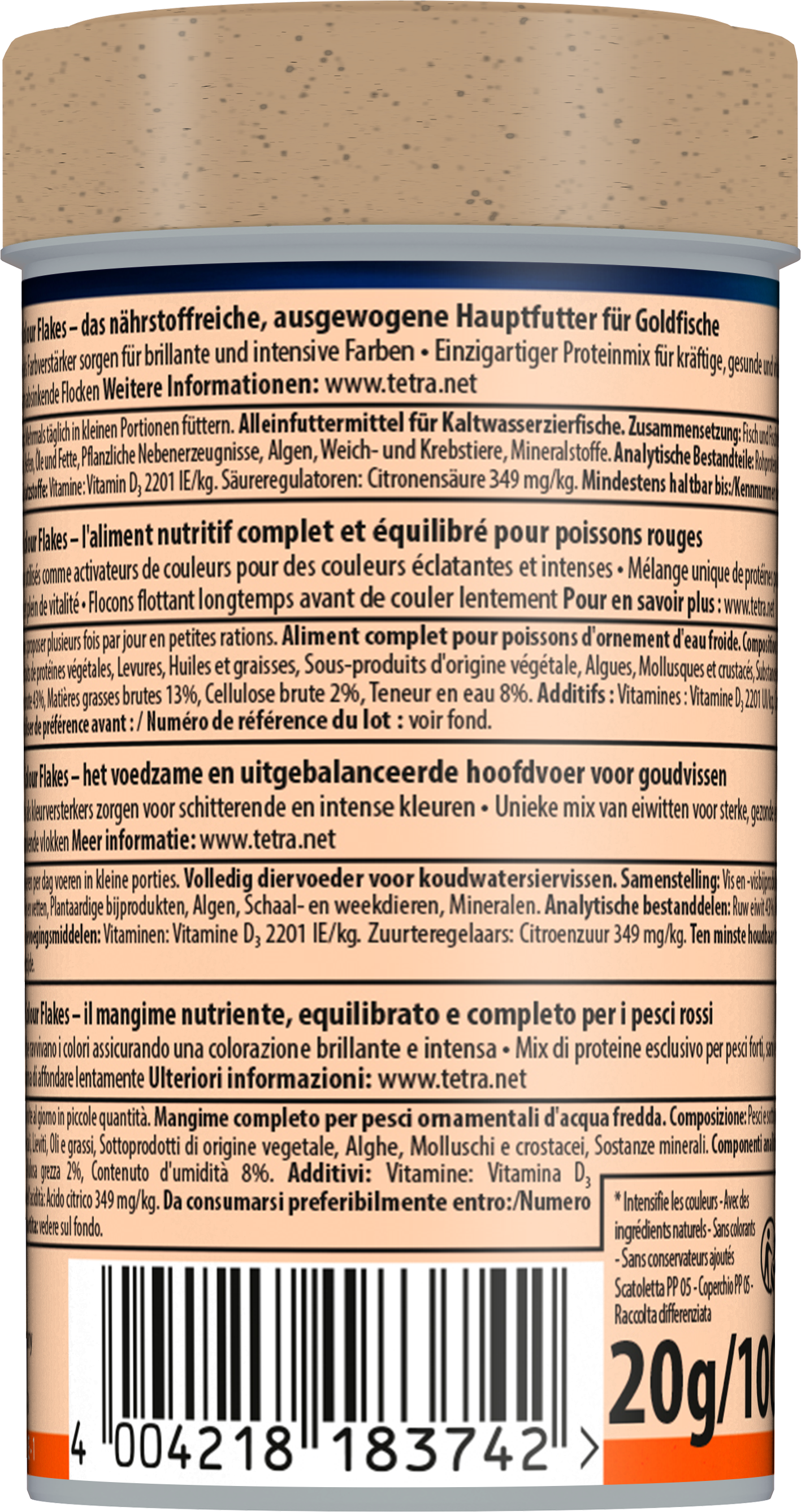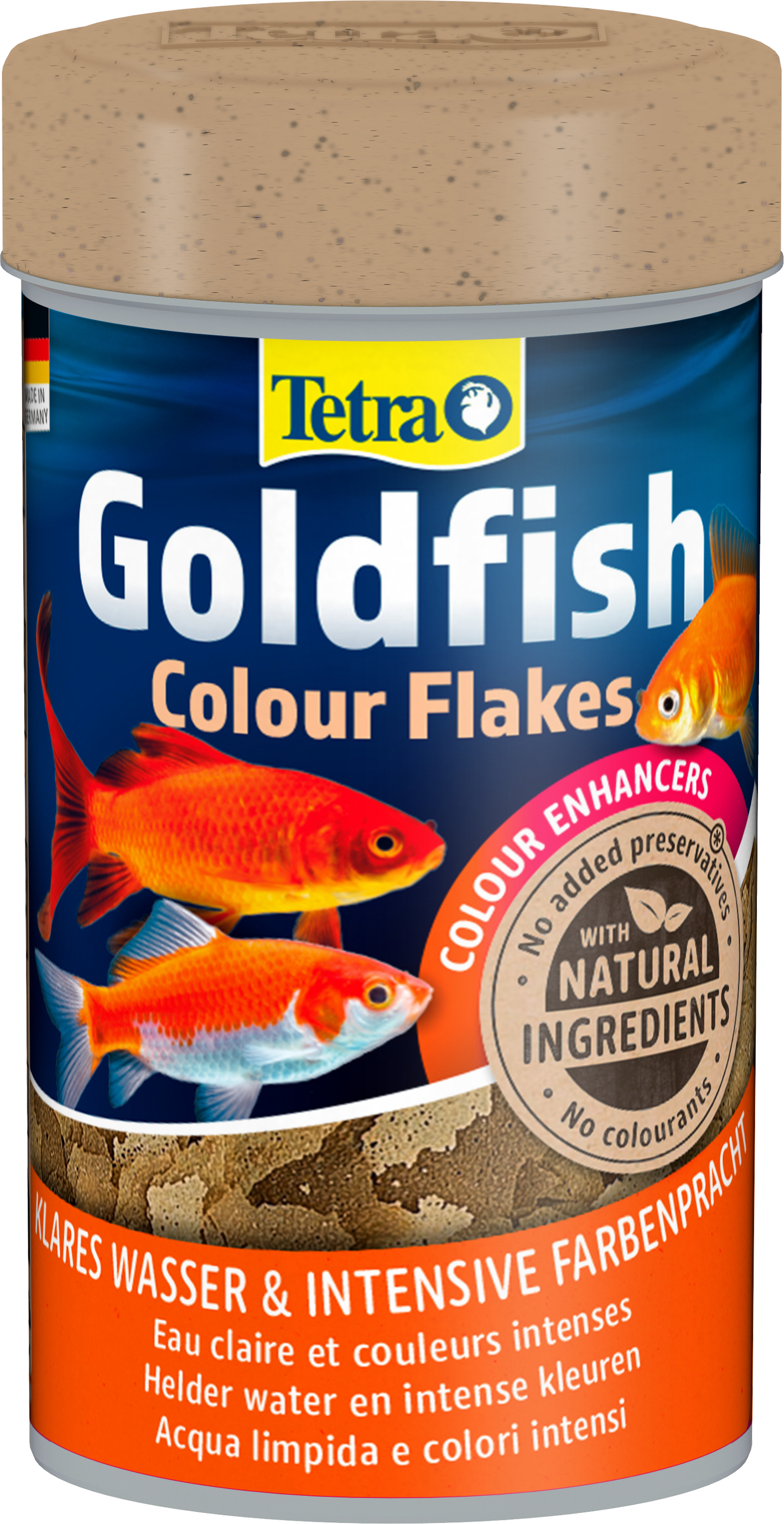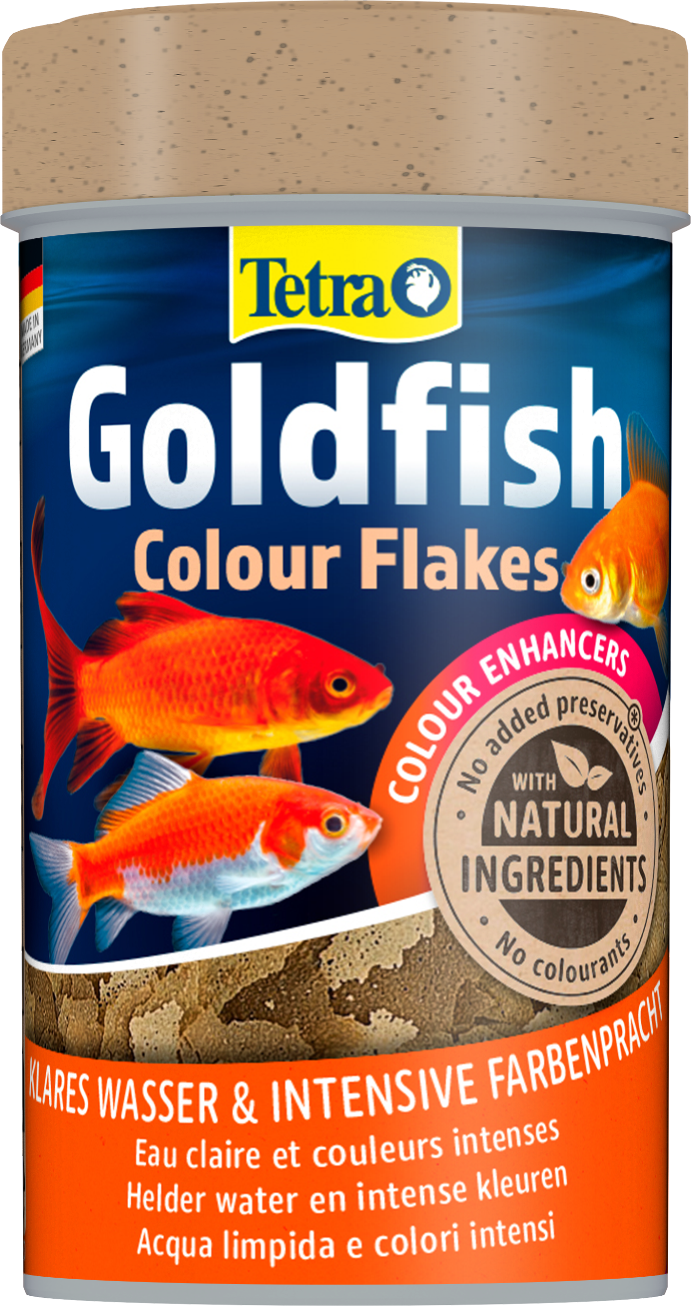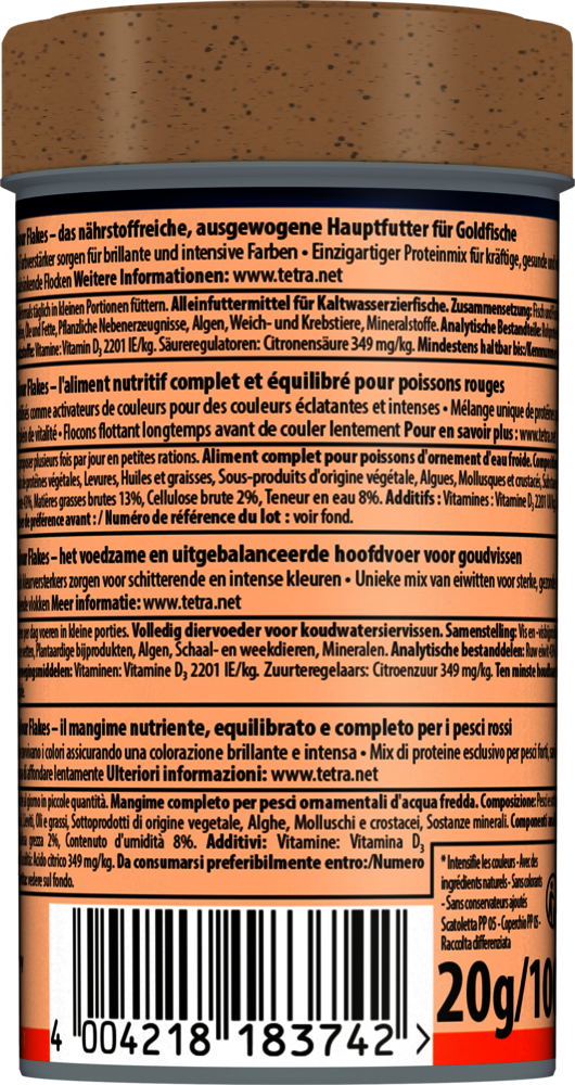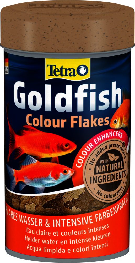 Tetra Goldfish Colour Flakes es un alimento completo, nutritivo y equilibrado para carpines dorados para realzar sus colores naturales. La calidad óptima de esta fórmula equilibrada favorece su salud y el bienestar. El alimento contiene carotenoides como potenciadores del color para garantizar colores brillantes e intensos. Las escamas de larga flotación y de descenso lento minimizan los residuos y la contaminación del agua gracias a su alta digestibilidad. La receta única, con ingredientes naturales de alta calidad, sin colorantes ni conservantes añadidos, y la mezcla de proteínas adaptada de forma óptima favorecen el crecimiento óptimo, la vitalidad y una mayor resistencia. Con Tetra Goldfish Colours Flakes, sus carpines dorados prosperarán y el agua de su acuario se mantendrá limpia y transparente.