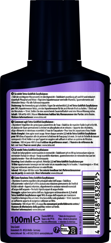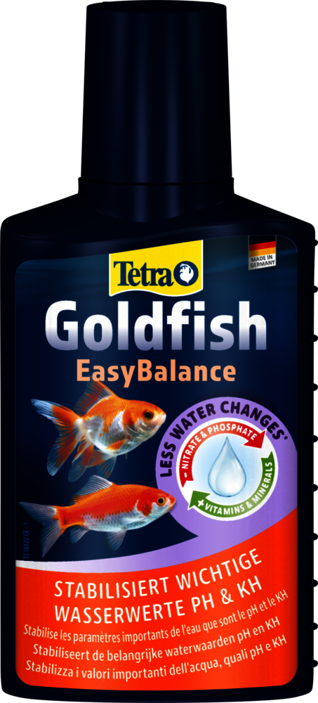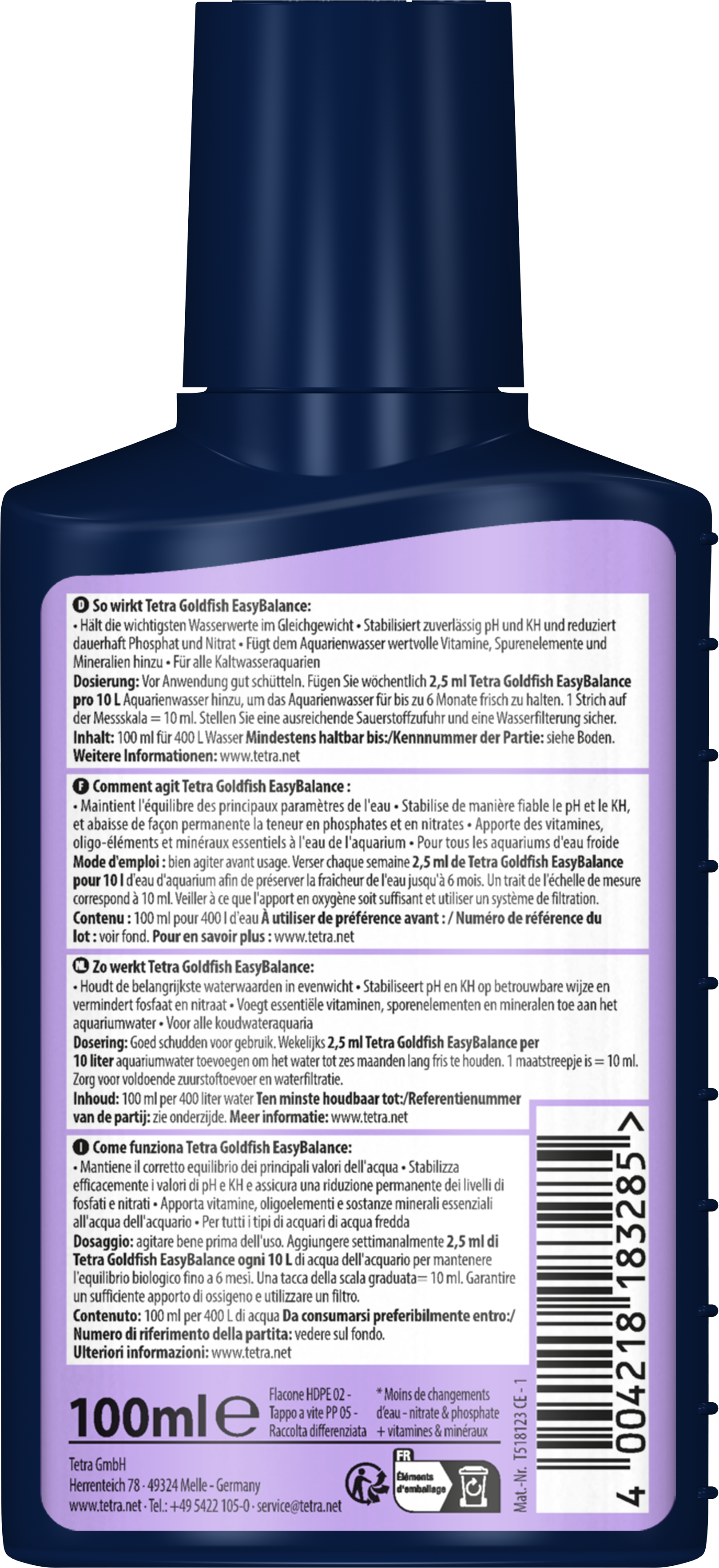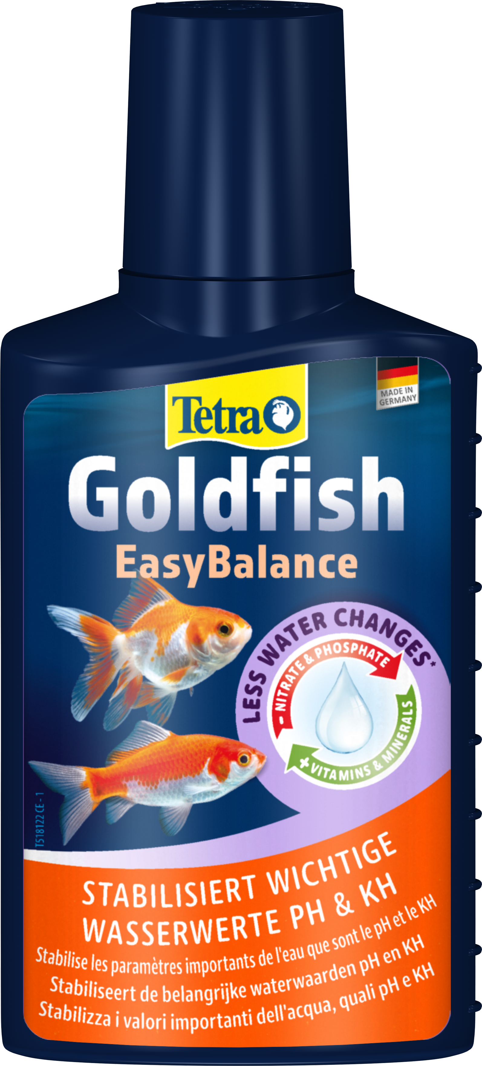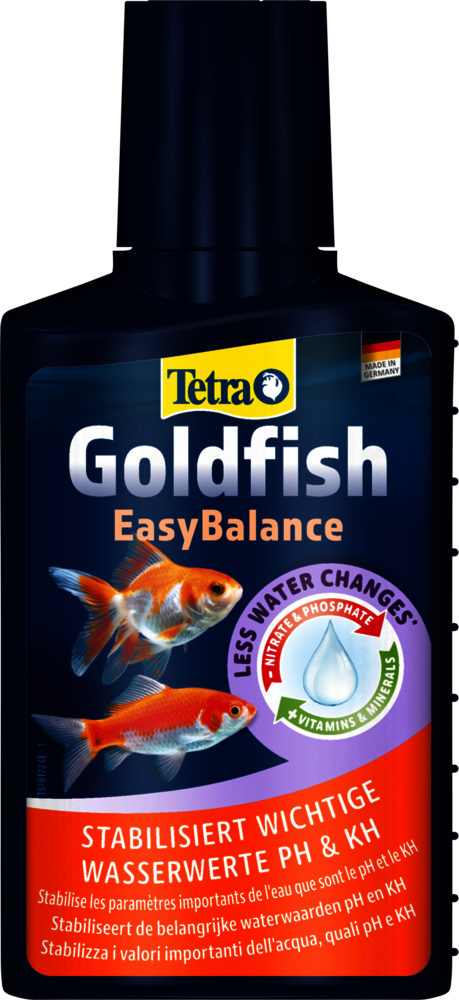 Tetra Goldfish EasyBalance hace que el cuidado de su acuario sea más fácil y agradable, dándole más tiempo para relajarse y admirar sus carpines dorados en lugar de preocuparse por el mantenimiento frecuente. Al estabilizar de forma fiable los valores de pH y dureza carbonatada, Tetra Goldfish EasyBalance protege a sus peces de cambios repentinos en la química del agua que, de otro modo, podrían ser estresantes o incluso perjudiciales. Al mismo tiempo, reduce los fosfatos y nitratos, lo que ayuda a prevenir la proliferación de algas antiestéticas y mantiene el agua fresca durante más tiempo. Los gránulos visibles en el líquido se esparcen rápidamente por el acuario, se hunden hasta el fondo y comienzan a actuar de inmediato, sin ningún peligro para los peces y los invertebrados, aunque los ingieran. Además de mantener unas condiciones estables del agua, Tetra Goldfish EasyBalance añade valiosas vitaminas, oligoelementos y minerales especialmente adaptados a las necesidades de sus carpines dorados para favorecer su vitalidad y resistencia. Con un uso semanal, reduce el número de cambios parciales de agua necesarios. De este modo, Tetra Goldfish EasyBalance hace que su afición le requiera menos tiempo y ayuda a ahorrar agua del grifo, lo que contribuye a una acuariofilia más respetuosa con el medio ambiente. La aplicación es sencilla: solo tiene que agitar bien el frasco antes de usarlo y añadir 2,5 ml por cada 10 l de agua del acuario una vez a la semana. Un buen suministro de oxígeno (p. ej., con la bomba de aire Tetra APS) y una filtración adecuada garantizan los mejores resultados. Es importante recordar que Tetra Goldfish EasyBalance no es un acondicionador de agua del grifo, por lo que siempre que se añada nuevo agua de este tipo, se debe utilizar Tetra Goldfish AquaSafe. Compruebe con regularidad los valores del agua de su acuario con Tetra Test 7in1.
