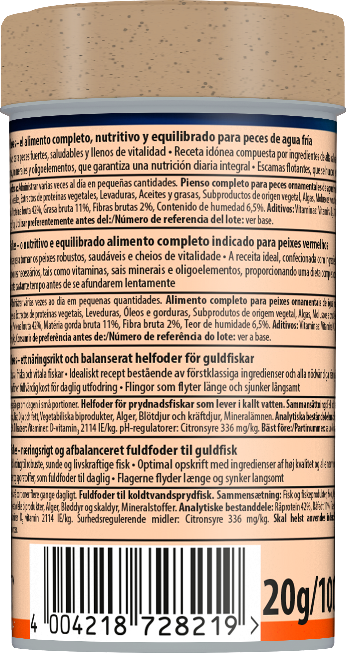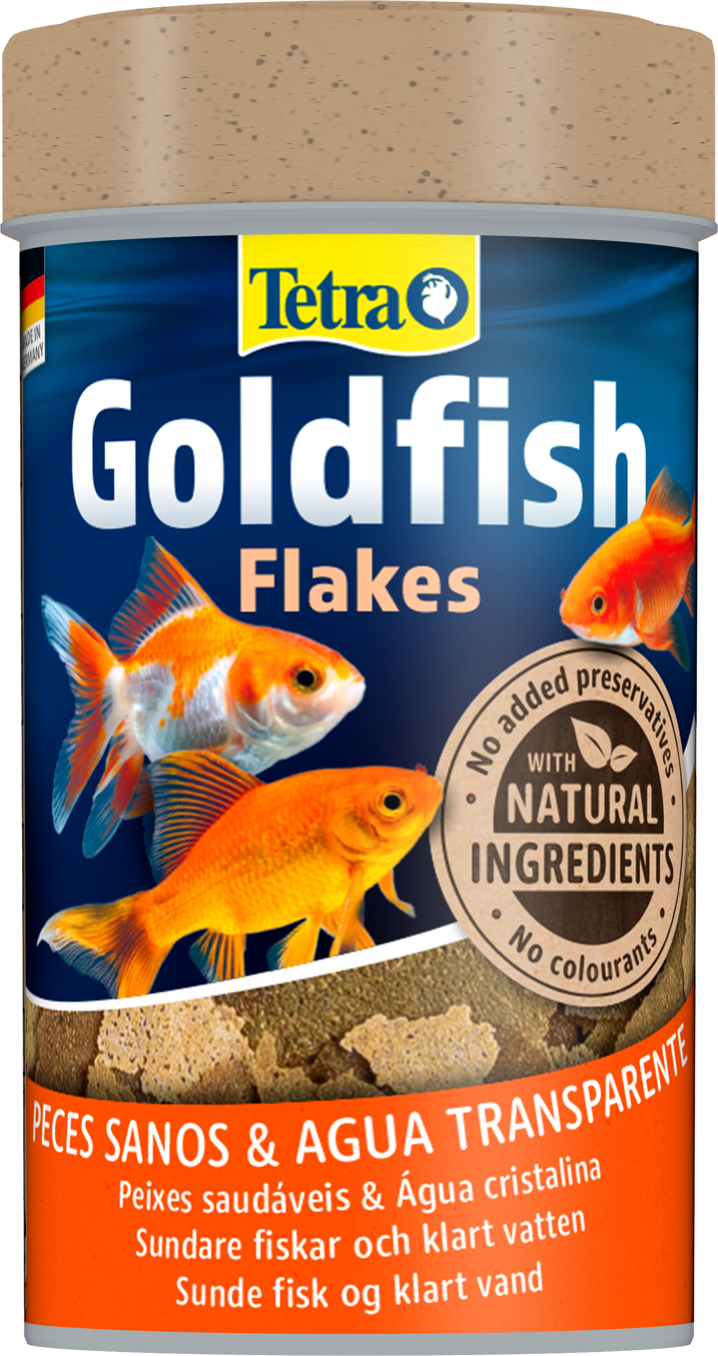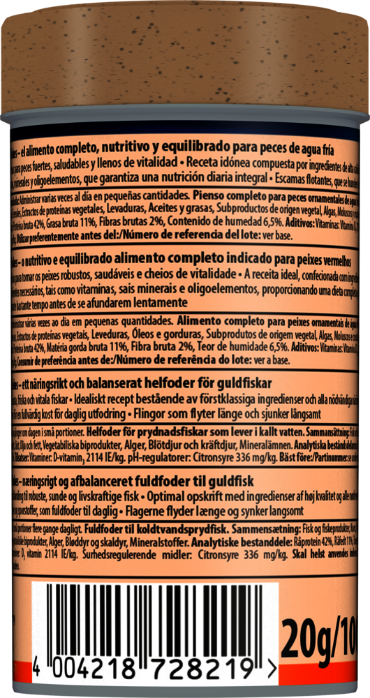 Tetra Goldfish Flakes es un alimento completo, nutritivo y equilibrado para carpines dorados. La mezcla de escamas de equilibrio óptimo para una dieta variada mantiene a los carpines dorados sanos y activos. Mezcla cuidadosamente seleccionada de ingredientes altamente nutritivos con vitaminas, minerales y oligoelementos que garantiza una nutrición completa de sus carpines dorados. Las escamas que contiene flotan durante mucho tiempo y descienden lentamente. Nuestra receta única, con ingredientes naturales de alta calidad, sin colorantes ni conservantes añadidos, y la mezcla de proteínas adaptada de forma óptima favorecen el crecimiento óptimo, la vitalidad y una mayor resistencia. Con Tetra Goldfish Flakes, sus carpines dorados prosperarán y el agua de su acuario se mantendrá limpia y transparente.