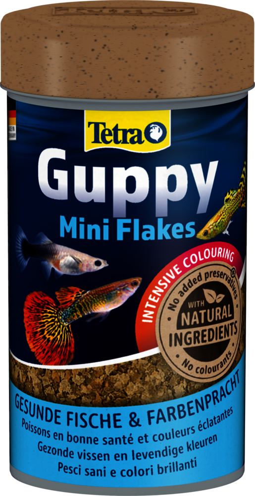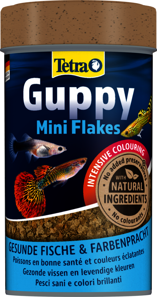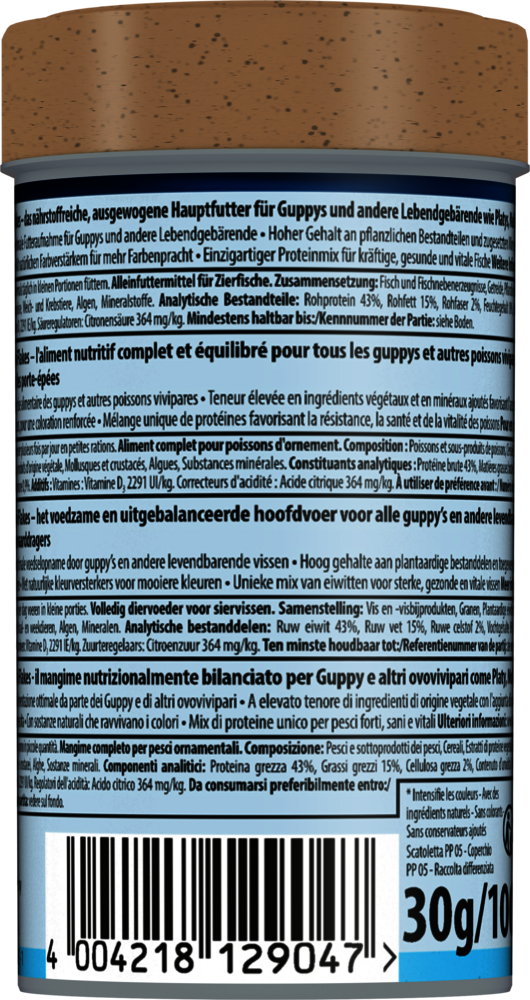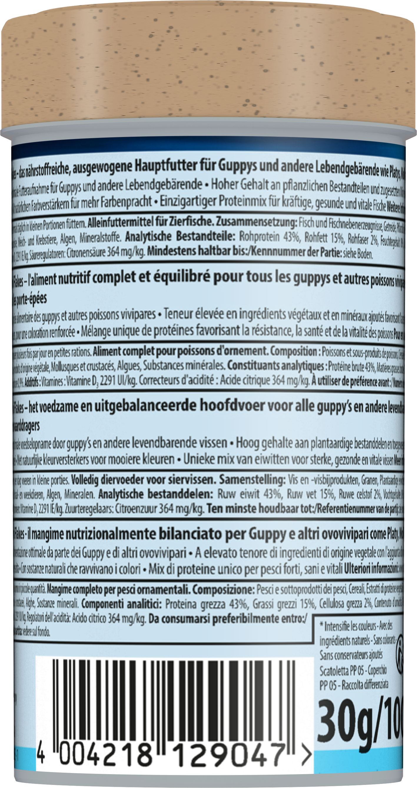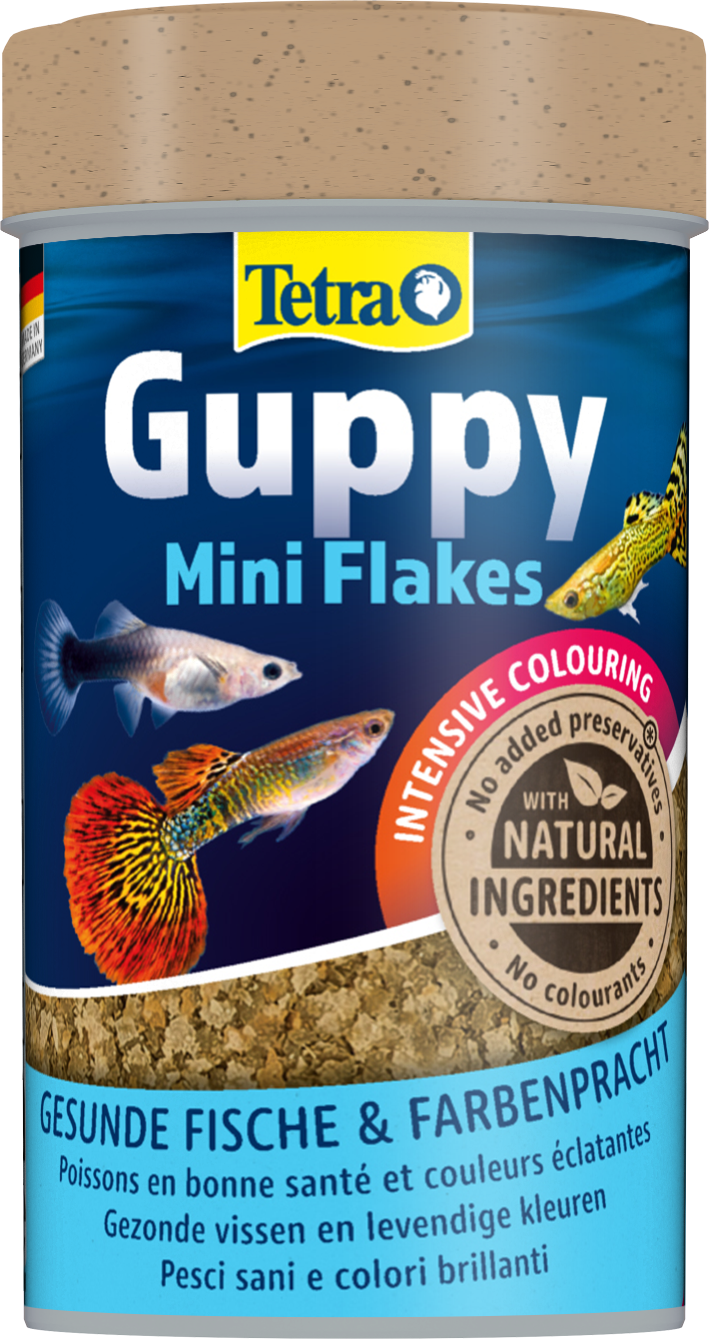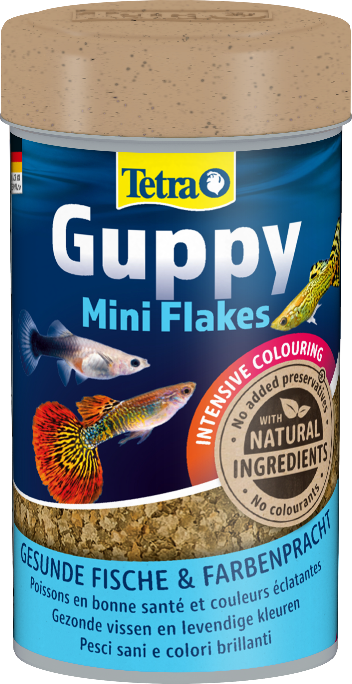Alimento completo en forma de pequeñas escamas para todos los guppys y otras carpas dentadas vivíparas como platys, mollys y colas de espada.