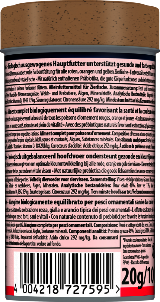 El elevado contenido de ingredientes naturales reforzadores de los colores garantiza una coloración magnífica para todos los peces ornamentales rojos, naranjas y amarillos