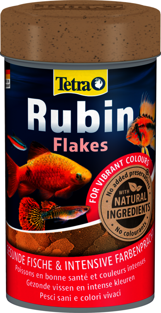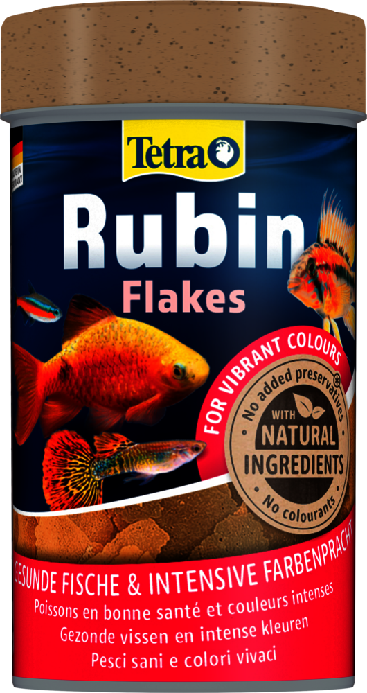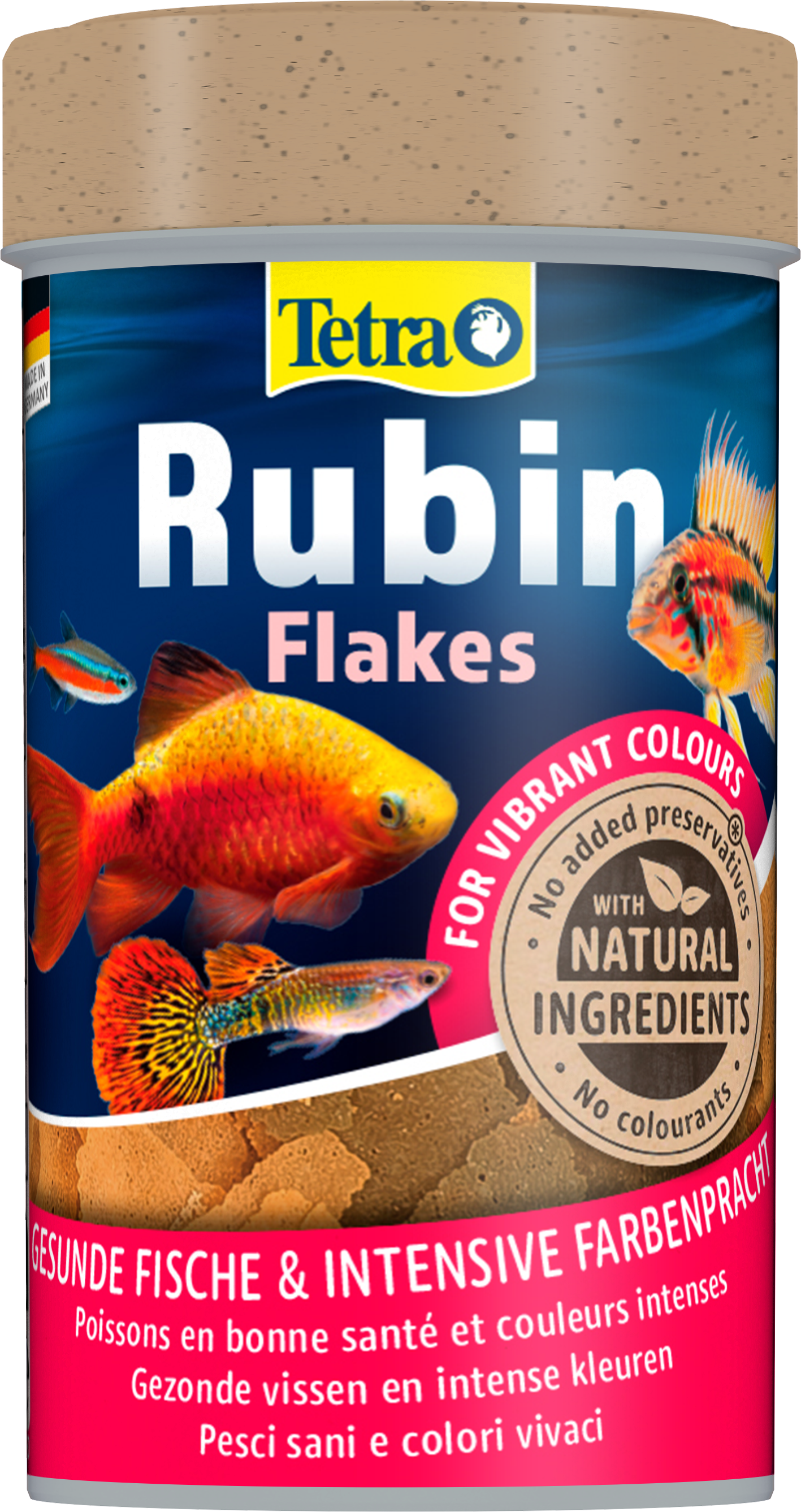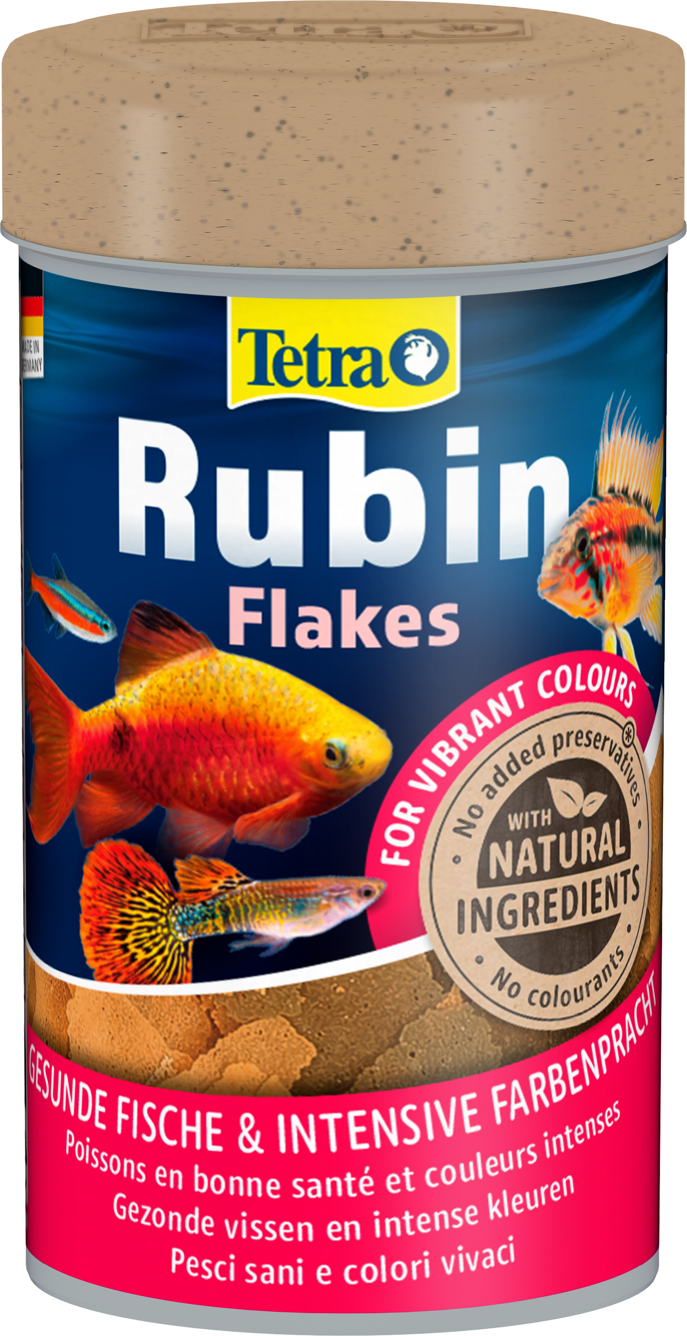 Tetra Rubin Flakes es un alimento en escamas biológicamente equilibrado que proporciona una dieta completa para la alimentación diaria de todos los peces ornamentales. Los ingredientes naturales adicionales potencian los tonos vivos de los peces rojos, naranjas y amarillos. El efecto reforzador de los colores se aprecia con tan solo unas semanas de administración regular. Además, los prebióticos contribuyen a mejorar las funciones corporales y la conversión alimenticia. Esto garantiza un crecimiento sano de los peces, mejora su vitalidad y ayuda a mantener limpia el agua del acuario. Esta receta única, con ingredientes naturales de alta calidad, sin colorantes ni conservantes añadidos, y la mezcla de proteínas adaptada de forma óptima favorecen un crecimiento ideal, vitalidad y una mayor resistencia. Con los Tetra Rubin Flakes, sus peces ornamentales prosperarán y el agua de su acuario se mantendrá limpia y transparente.