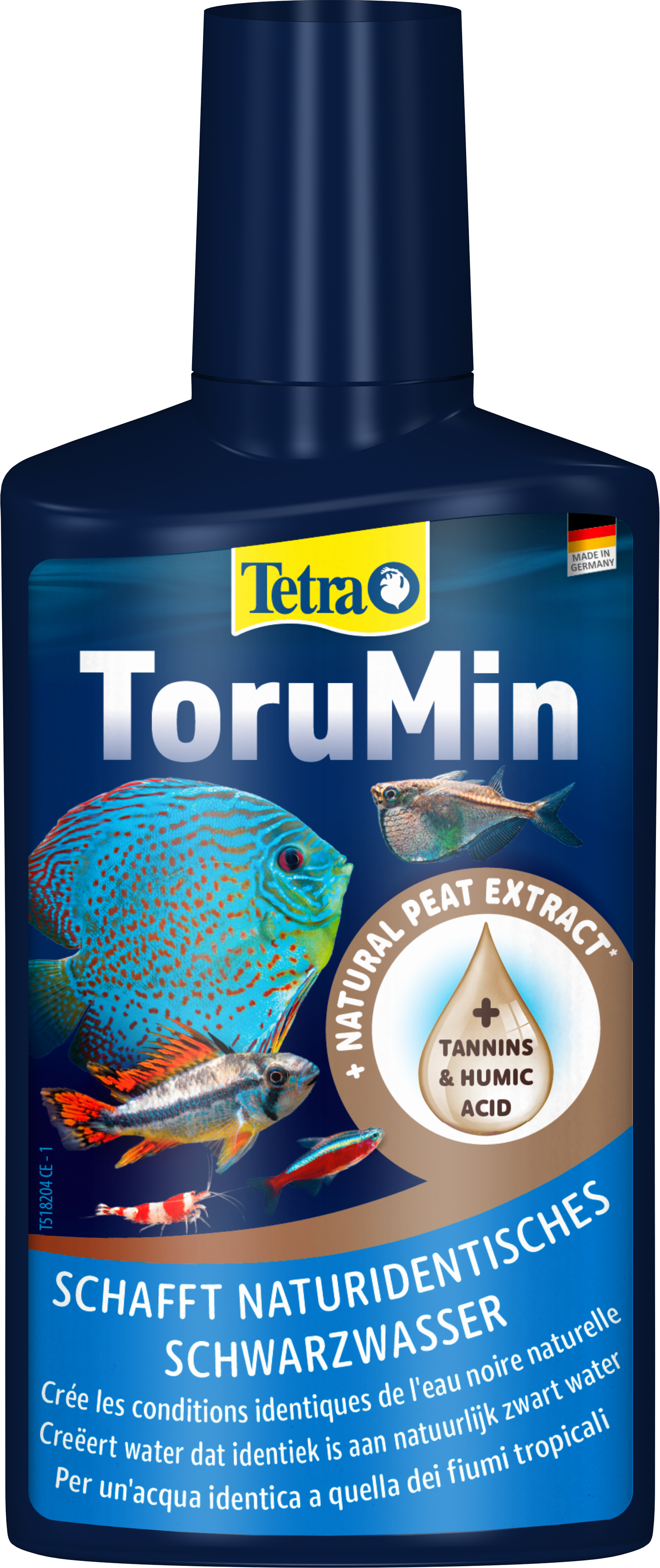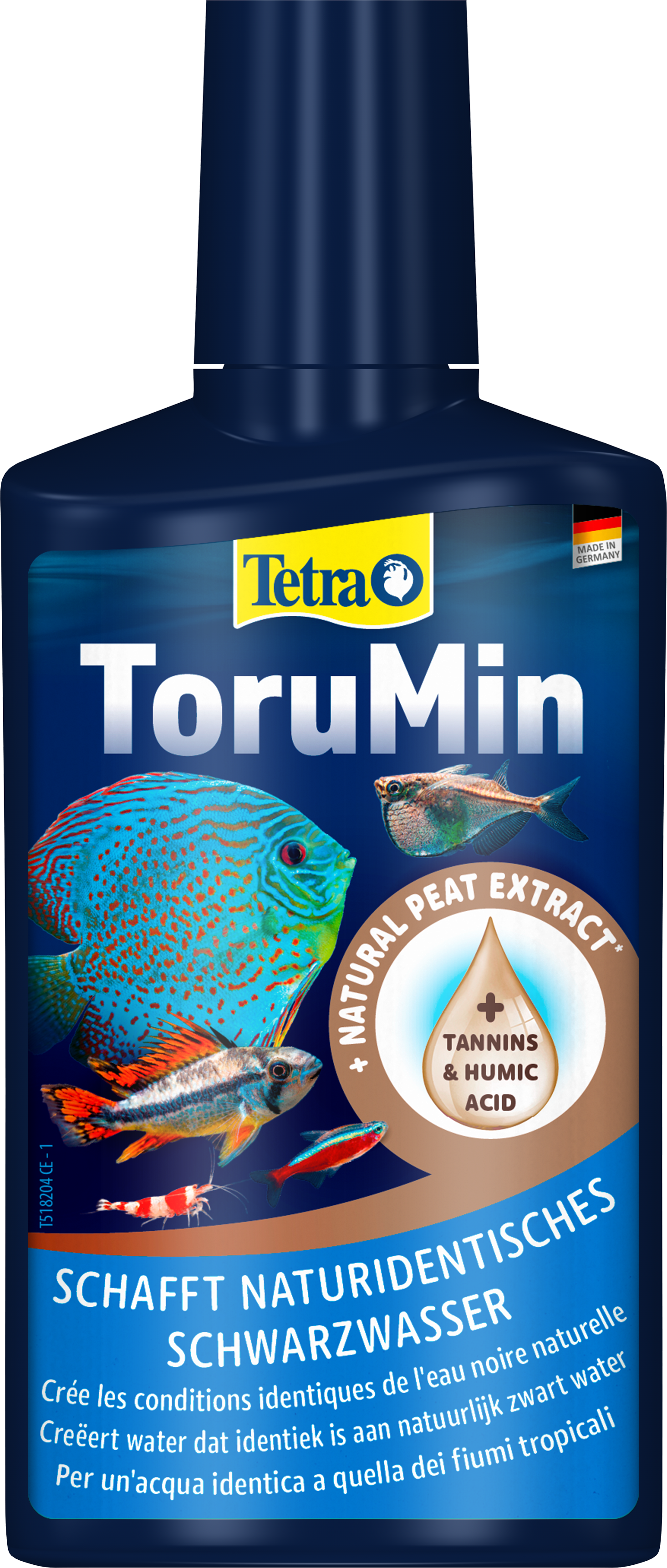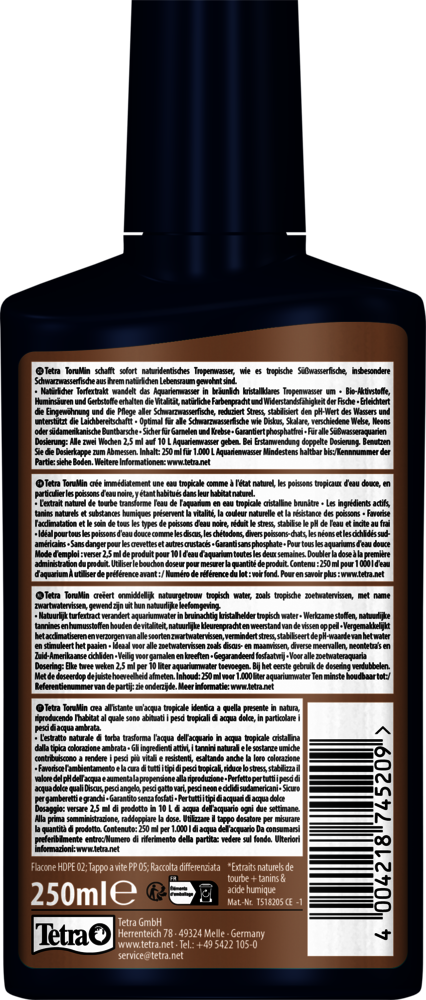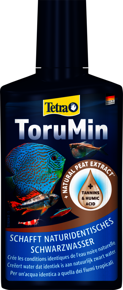 Tetra ToruMin convierte el agua común de los acuarios en aguas negras que reflejan el hábitat tropical de muchas especies de acuarios populares. Reduce el crecimiento de algas y favorece el éxito del desove. Para un ecosistema natural próspero.