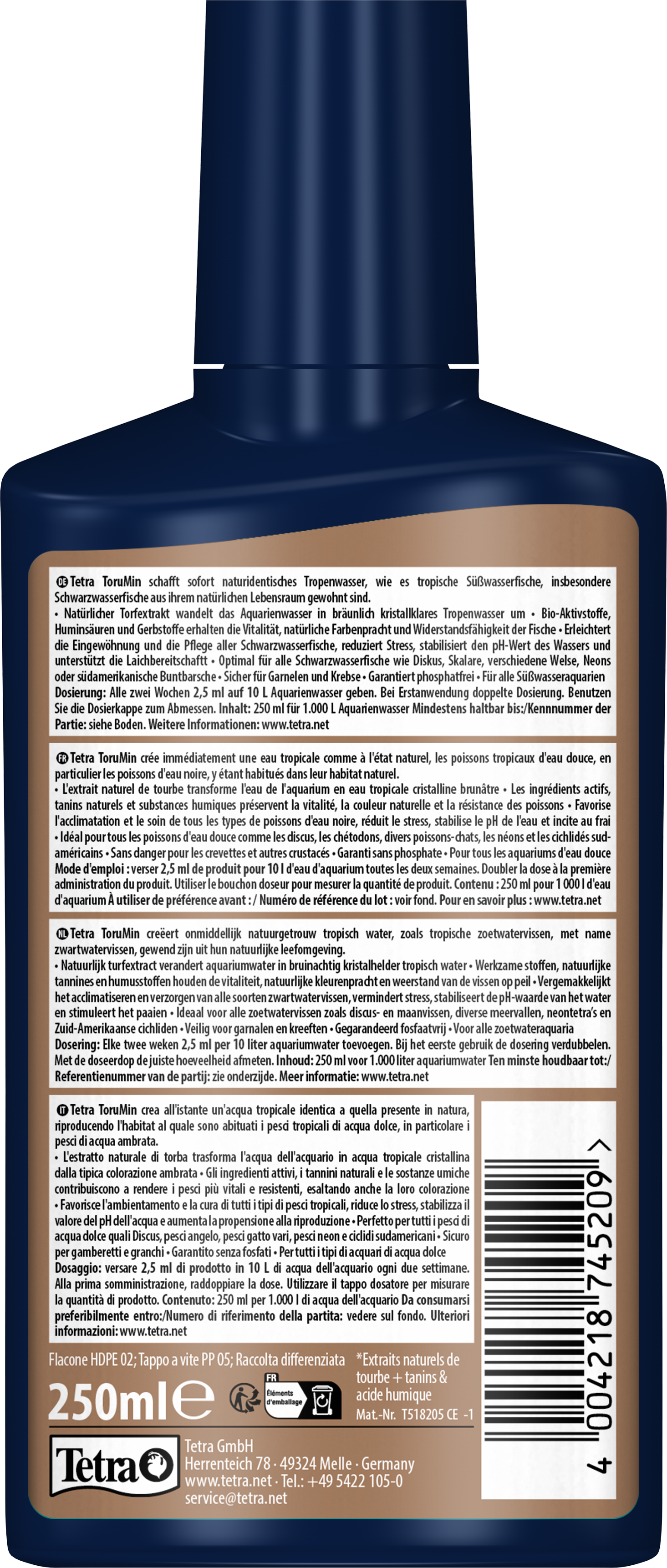 Tetra ToruMin convierte el agua ordinaria del acuario en aguas negras que reflejan el hábitat tropical de muchas especies populares de acuarios. Su extracto de turba natural le da al agua un delicado tinte marrón, creando un agua tropical cristalina que no solo tiene un aspecto auténtico sino que también beneficia el bienestar de los peces. Los taninos naturales y los ácidos húmicos contenidos en el extracto reducen el estrés, fortalecen la resiliencia y crean un entorno en el que los peces pueden sentirse seguros, mostrar su comportamiento natural y prosperar. Además, el ligero tinte marrón reduce la cantidad de luz que penetra en el agua, lo que ralentiza naturalmente el crecimiento excesivo de algas. Los ingredientes bioactivos de Tetra ToruMin aumentan la vitalidad, mejoran la coloración natural y la salud en general. Con la adición de yodo, el producto también ayuda a preparar a los peces para el apareamiento y favorece el éxito del desove, lo que lo hace particularmente valioso para los acuaristas que tienen especies sensibles o reproductoras. Al mismo tiempo, los macroelementos y oligoelementos cuidadosamente seleccionados promueven el crecimiento saludable de las plantas, mientras que los coloides naturales de las plantas mejoran la calidad y la claridad del agua. Al estabilizar el pH del agua de forma suave y natural, Tetra ToruMin hace que los acuarios sean más seguros y cómodos para las especies que provienen de aguas blandas y ácidas. Esto incluye el pez disco, el pez ángel, varios bagres, peces neón y cíclidos sudamericanos, así como camarones y otros invertebrados. También se garantiza que Tetra ToruMin no contiene fosfatos, lo que lo hace responsable con el medio ambiente y seguro para todos los acuarios de agua dulce. Añada siempre Tetra AquaSafe para neutralizar las sustancias nocivas que suele contener el agua del grifo. La aplicación es sencilla: añadir 2,5 ml de Tetra ToruMin por cada 10 l de agua del acuario cada dos semanas. Use una dosis doble para la primera aplicación. Con su acción natural y fácil uso, Tetra ToruMin es la opción ideal para los acuaristas que buscan proporcionar a sus peces las condiciones de vida más naturales y libres de estrés posibles.