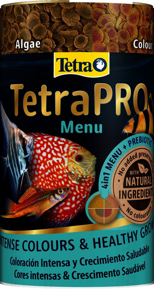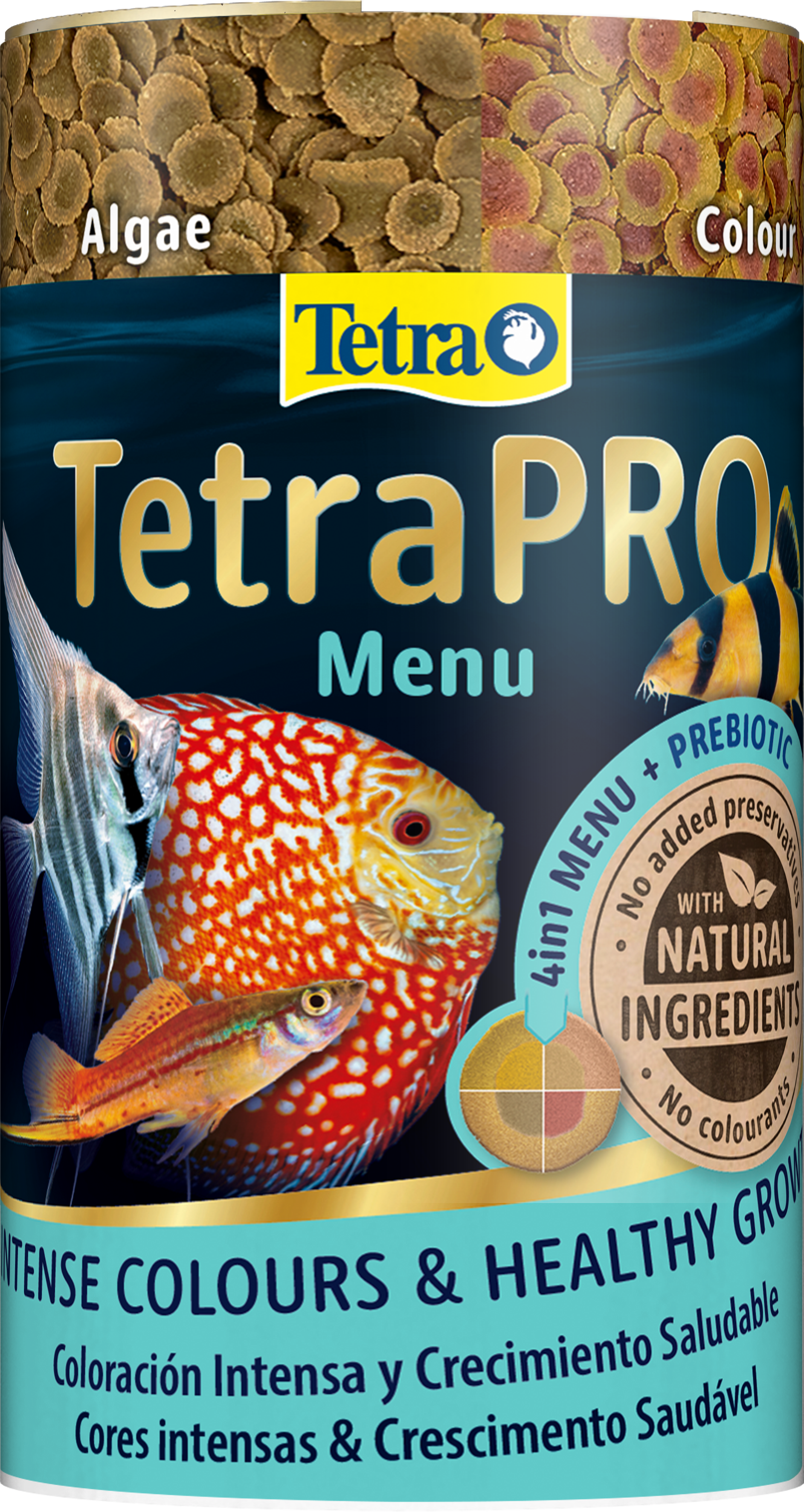 TetraPRO Menu ofrece una gama de cuatro alimentos completos de primera calidad, altamente nutritivos y cuidadosamente formulados. Puede elegir entre multi-crisps que refuercen el sistema inmunitario, favorezcan un crecimiento saludable, realcen el brillo natural del color o potencien la vitalidad de sus peces ornamentales.