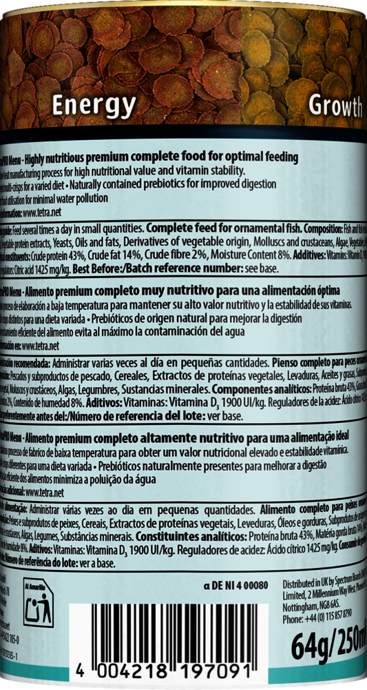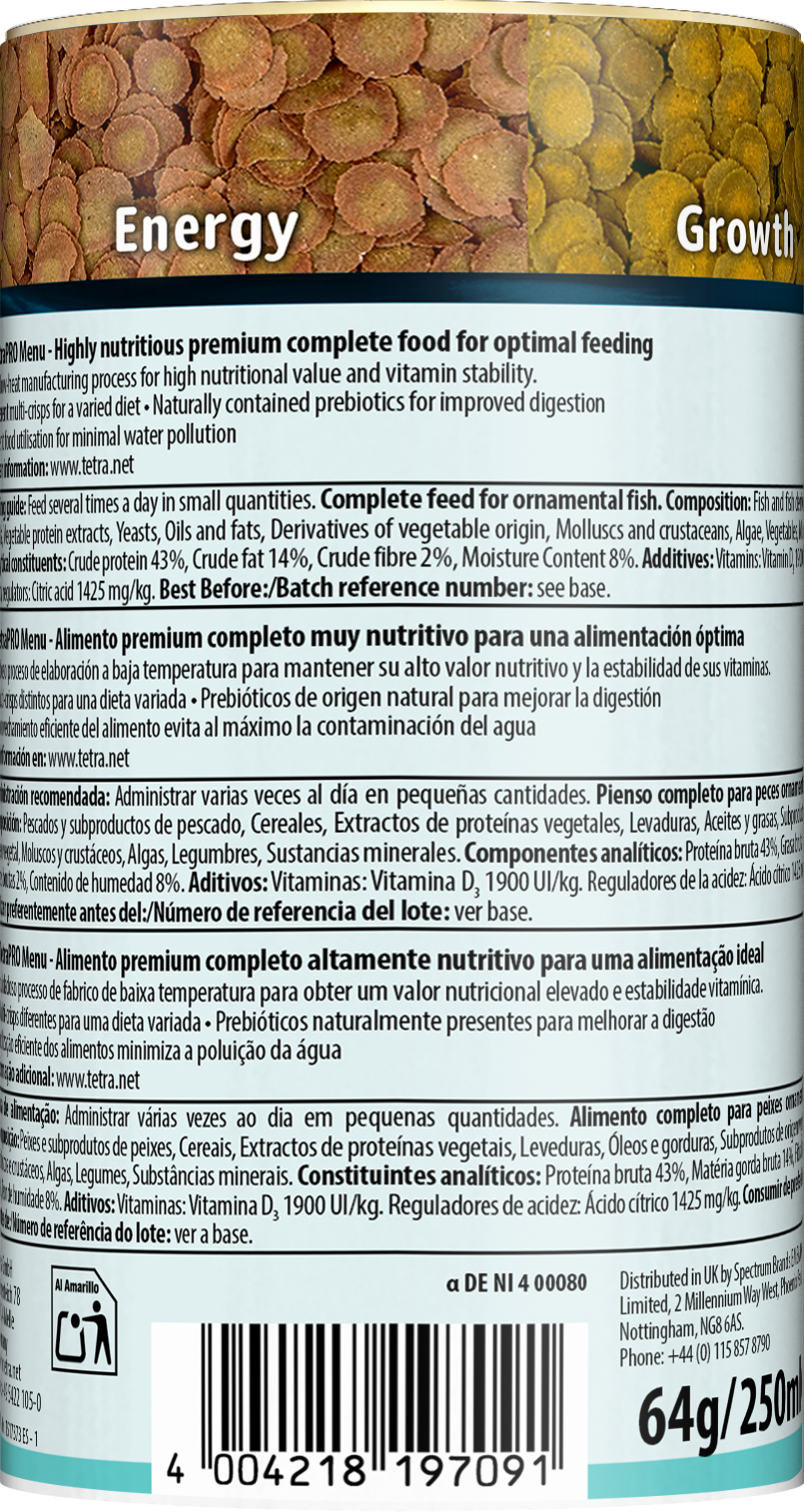 La gama TetraPRO ha marcado un antes y un después en la nutrición para peces. Estos alimentos completos y de primera calidad se formulan mediante un delicado proceso a baja temperatura, un método especial que proporciona a cada uno de los cuatro tipos de multi-crisps bicolores incluidos en TetraPRO Menu, un valor nutricional muy alto: ¡todo un festín para sus peces ornamentales! Los multi-crisps también absorben menos agua que las escamas convencionales, lo que aumenta el contenido de nutrientes por volumen. Todos los alimentos TetraPRO aportan una proporción equilibrada de proteínas y grasas. Esta ratio asegura que los peces puedan utilizar la proteína específicamente para desarrollar músculo mientras proporciona una gran cantidad de ácidos grasos esenciales para la generación de energía. TetraPRO Menu combina todas las ventajas de los distintos multi-crisps. Usted elige: mientras que el concentrado energético de los multi-crisps Energy aumenta la vitalidad, los multi-crisps Colour resaltan el brillo natural del color de sus peces. Los multi-crisps Algae les proporcionan todo lo que necesitan para fortalecer su sistema inmunitario, y los multi-crisps Growth favorecen un crecimiento saludable. Los multi-crisps Tetra también se deshacen mucho menos que las escamas comunes, por lo que apenas generan polvo en el envase. Por otra parte, los prebióticos presentes de forma natural actúan en el tracto intestinal de los peces para estimular específicamente el crecimiento y el metabolismo de bacterias beneficiosas para la salud. Gracias a su palatabilidad y alta digestibilidad, los multi-crisps mantienen el agua del acuario limpia. TetraPRO Menu ha sido elaborado con ingredientes de alta calidad y no contiene colorantes ni conservantes añadidos.